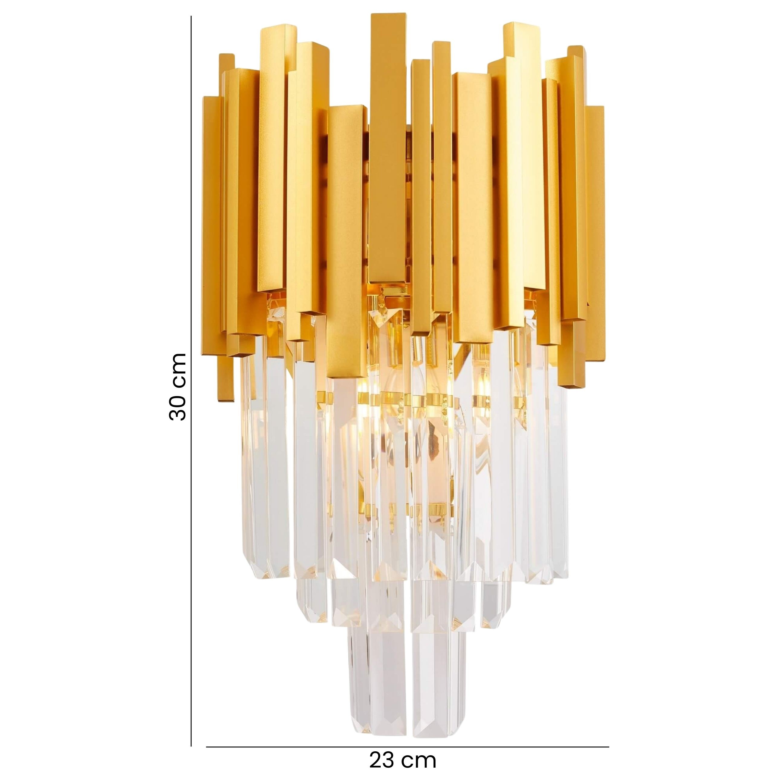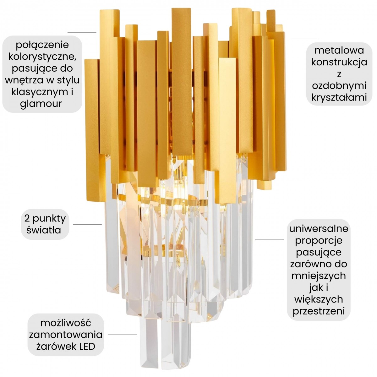 Złoty kinkiet FERA W2 łączy geometryczne, pionowe elementy w odcieniu klasycznego złota z warstwą szlifowanych kryształów, które tworzą elegancką, wielopoziomową formę. To kinkiet, który wygląda jak biżuteria na ścianie: jest szlachetny, pełen detali i zaprojektowany tak, by przyciągał wzrok. Wzór ułożonych naprzemiennie złotych linek i transparentnych kryształów tworzy przestrzenną, dekoracyjną kompozycję o wyraźnej architektonicznej linii.