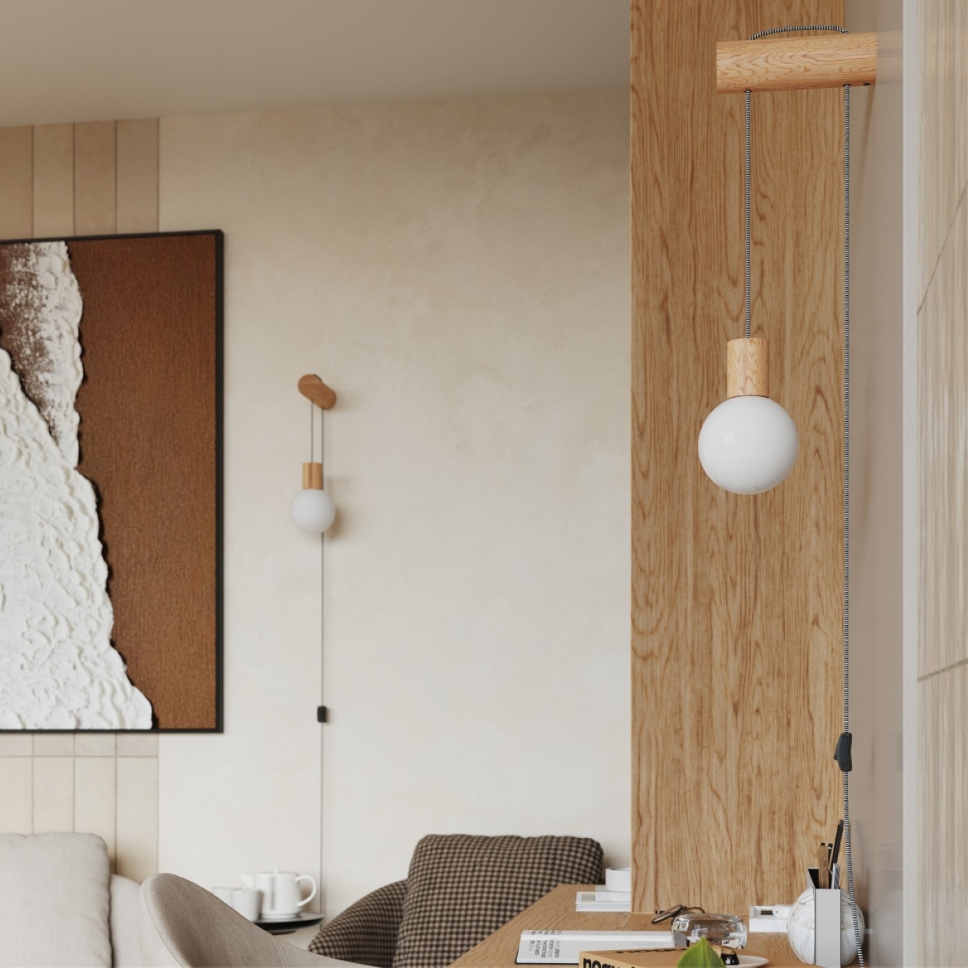 Zastosowanie drewna oraz delikatnej konstrukcji sprawia, że NIMBI świetnie odnajduje się w nowoczesnych i minimalistycznych przestrzeniach. Lampa nie dominuje wnętrza, lecz subtelnie je dopełnia, tworząc przytulny nastrój w każdym zakątku Twojego domu.
