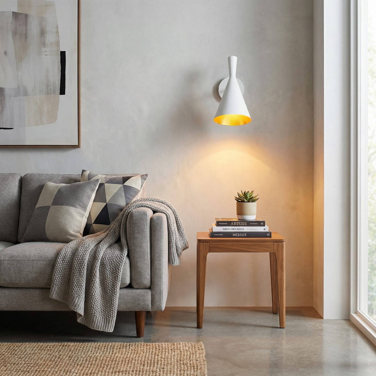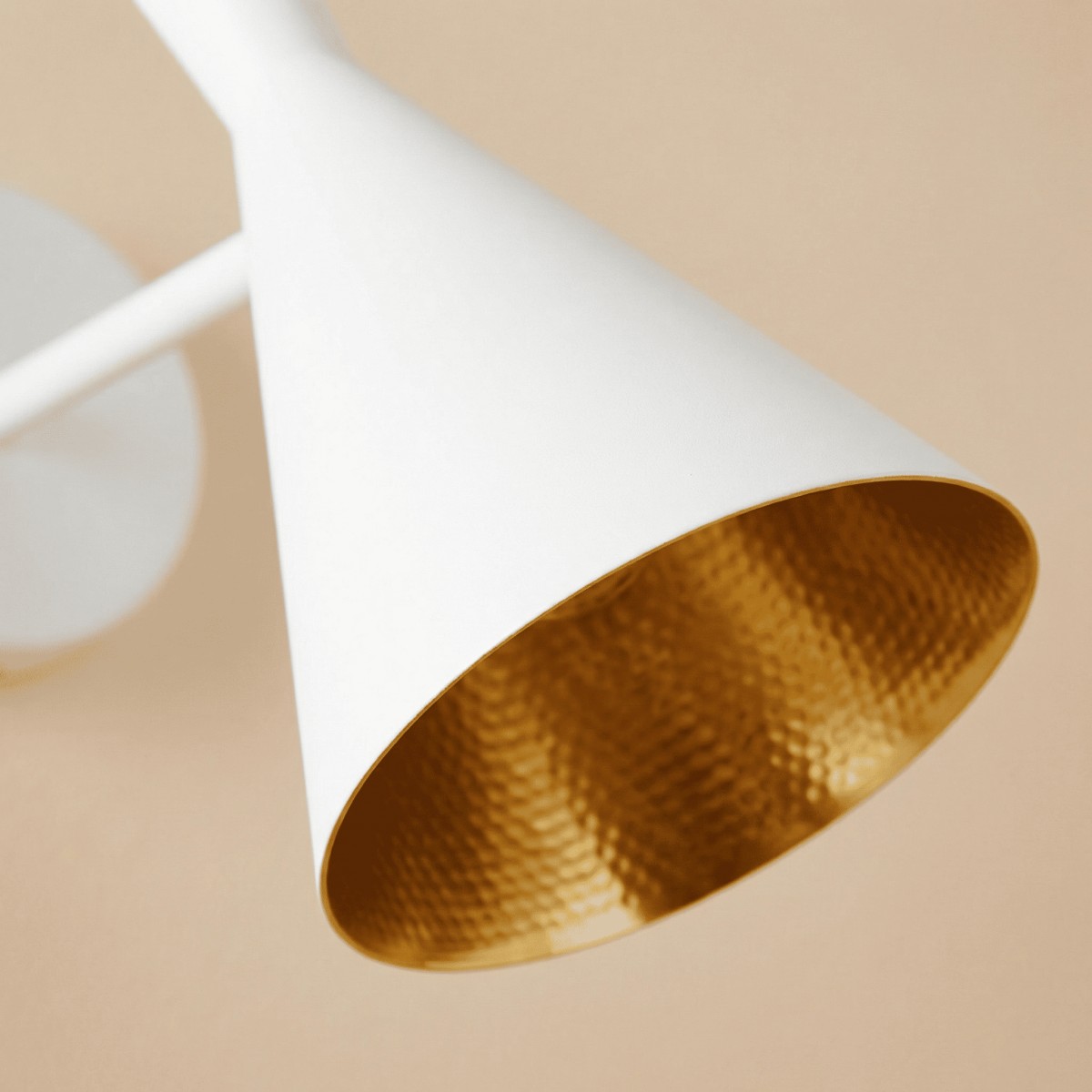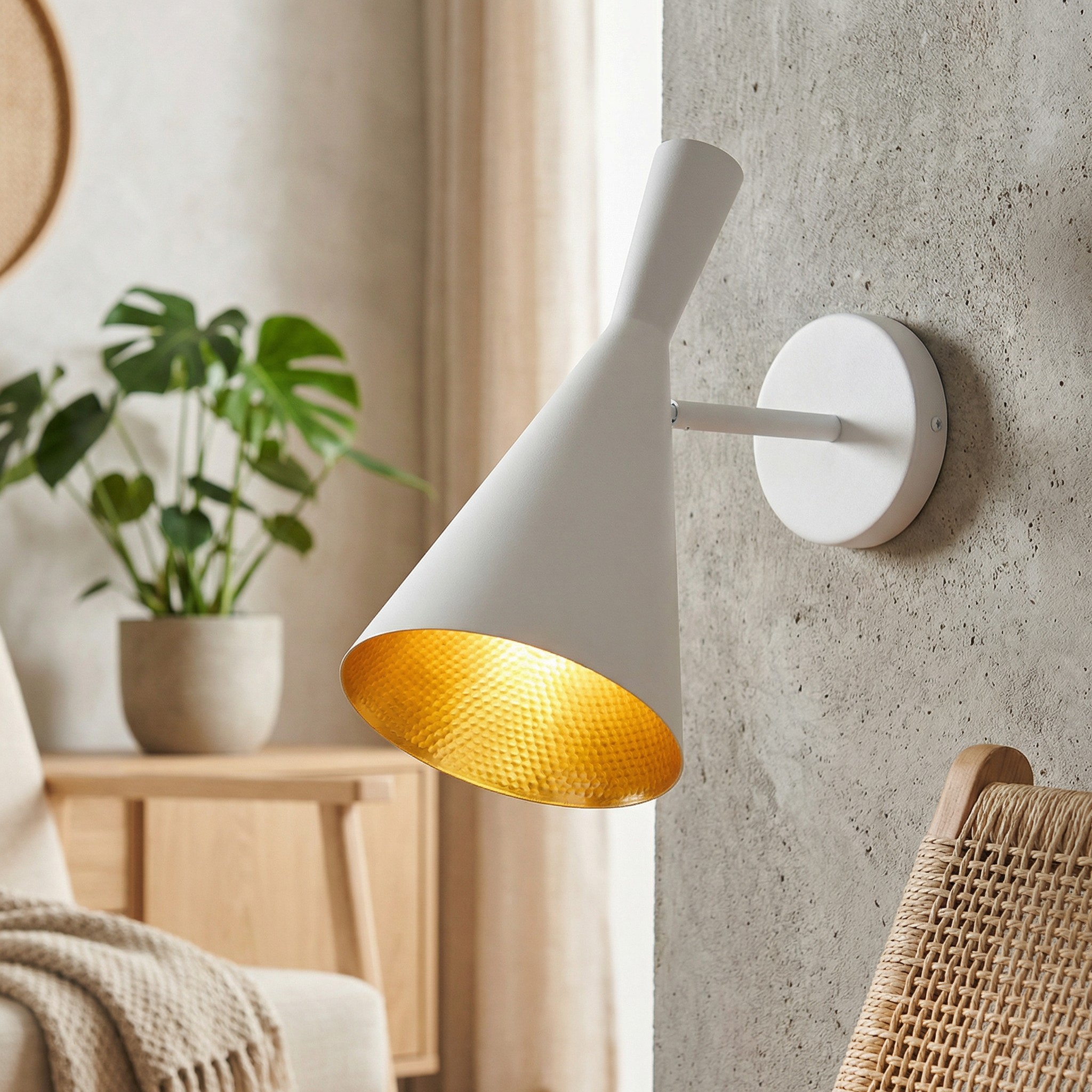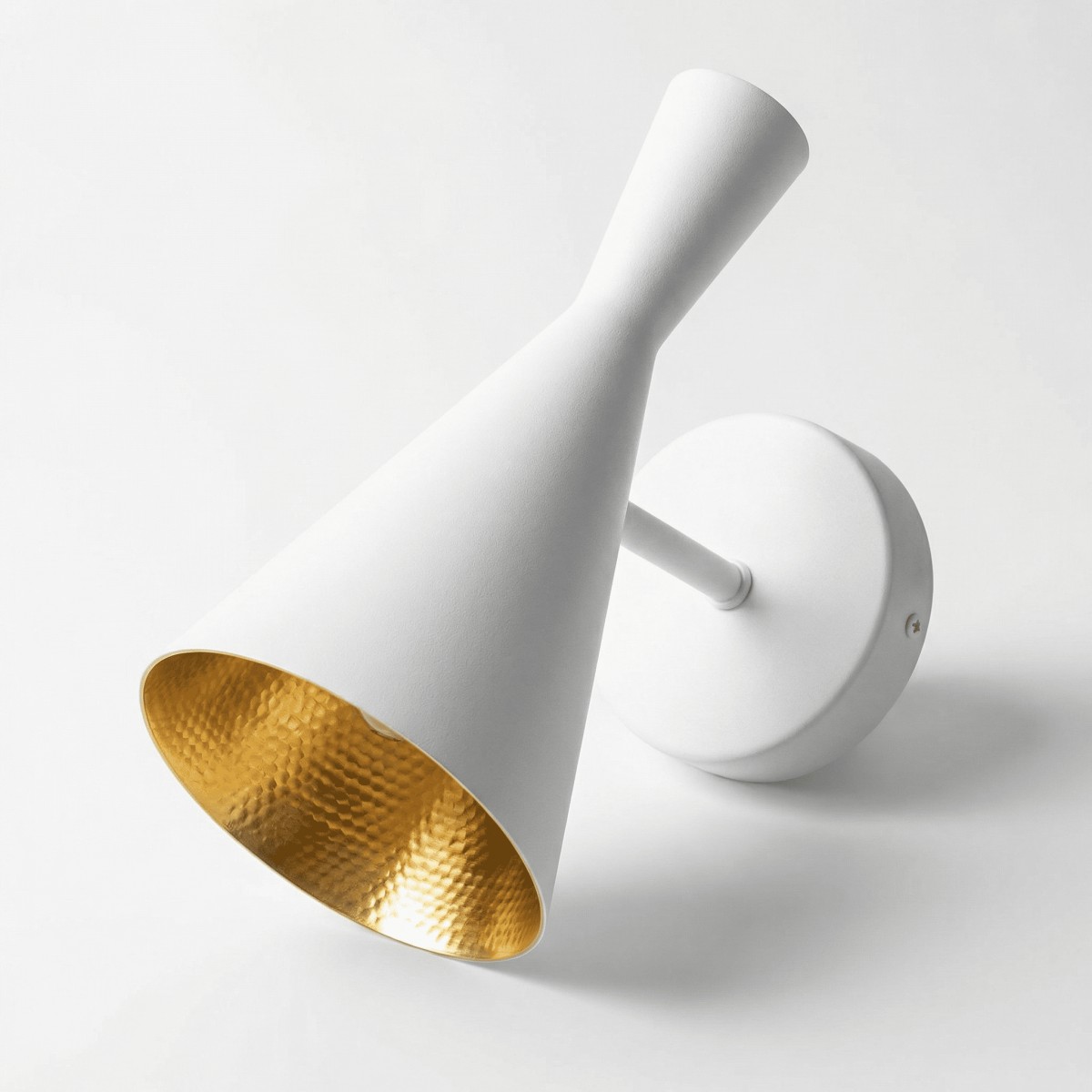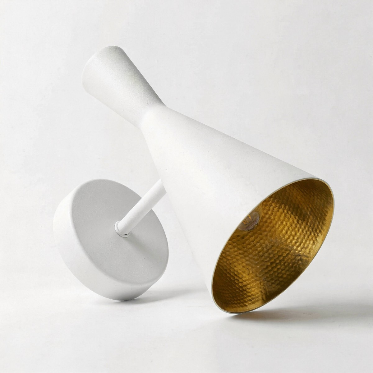 Smukły, stożkowy klosz w bieli nadaje kinkietowi zdecydowany, industrialny charakter. Minimalistyczna forma przyciąga wzrok, a jednocześnie nie dominuje aranżacji – idealnie wpisuje się w nowoczesne i loftowe wnętrza, gdzie liczy się prostota i wyrazisty detal.