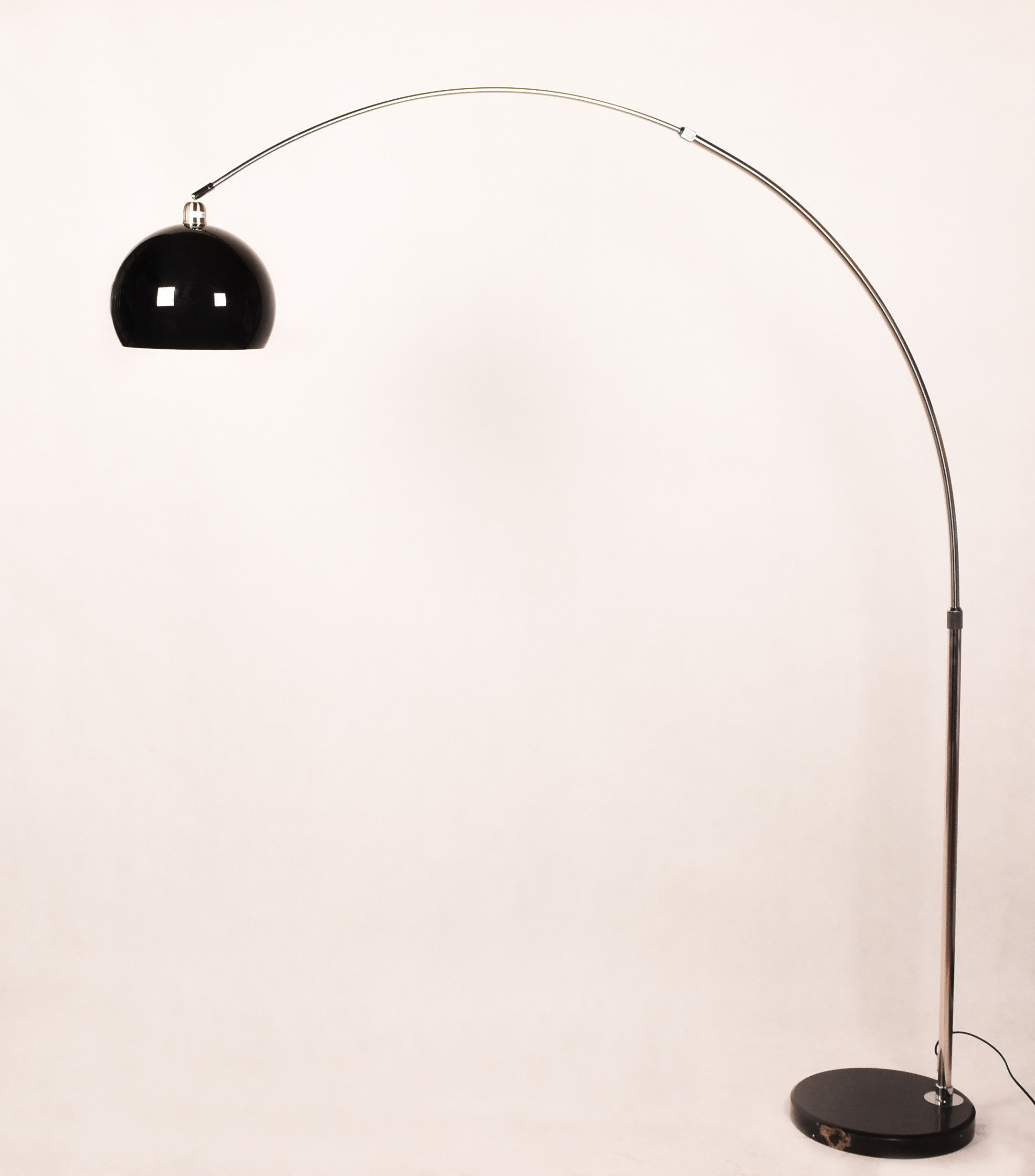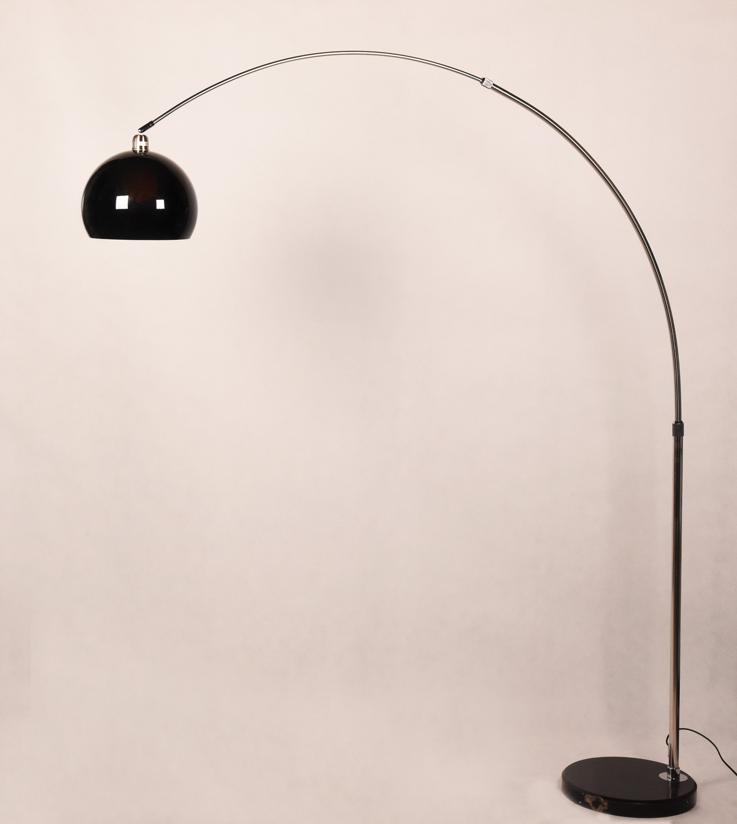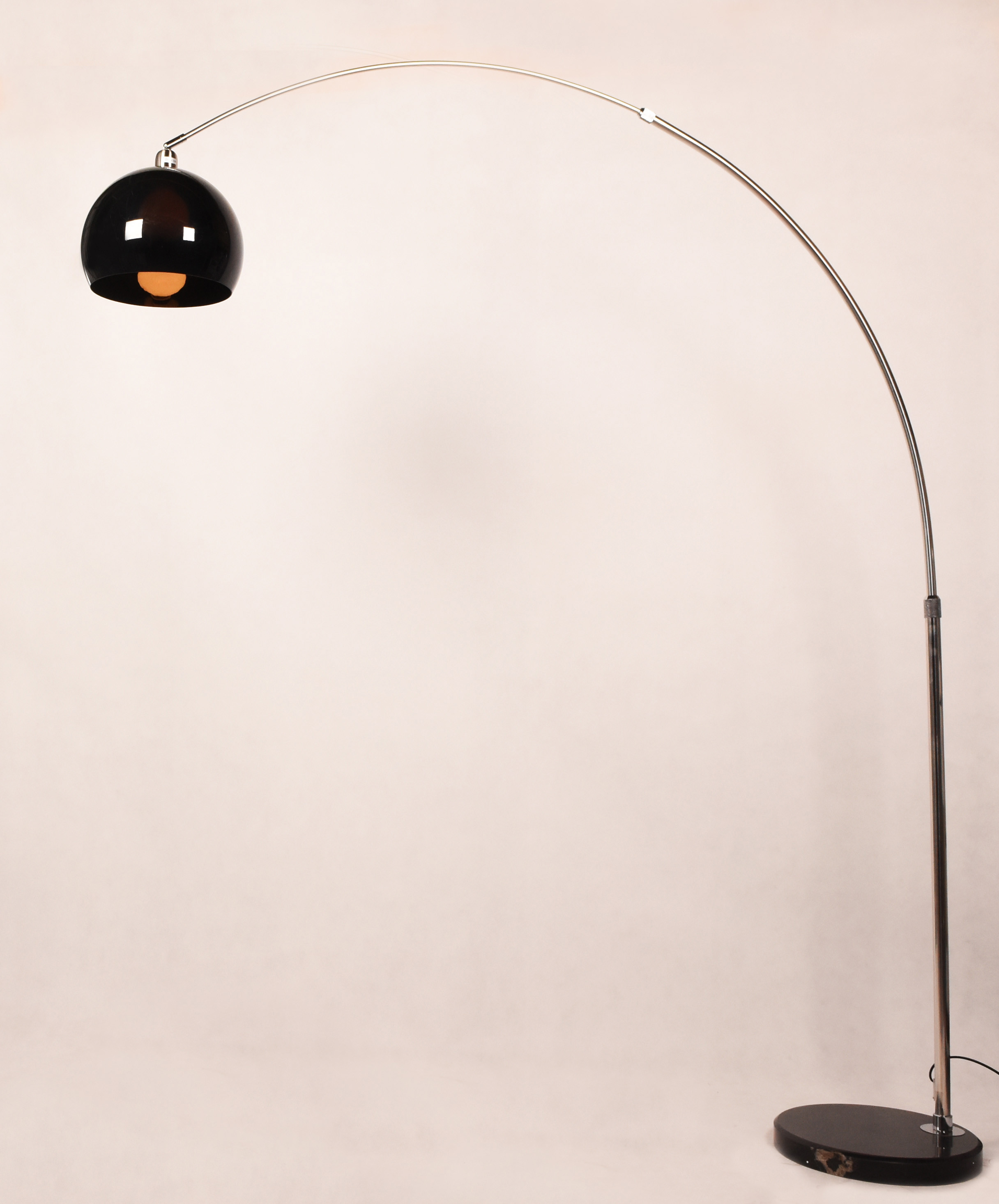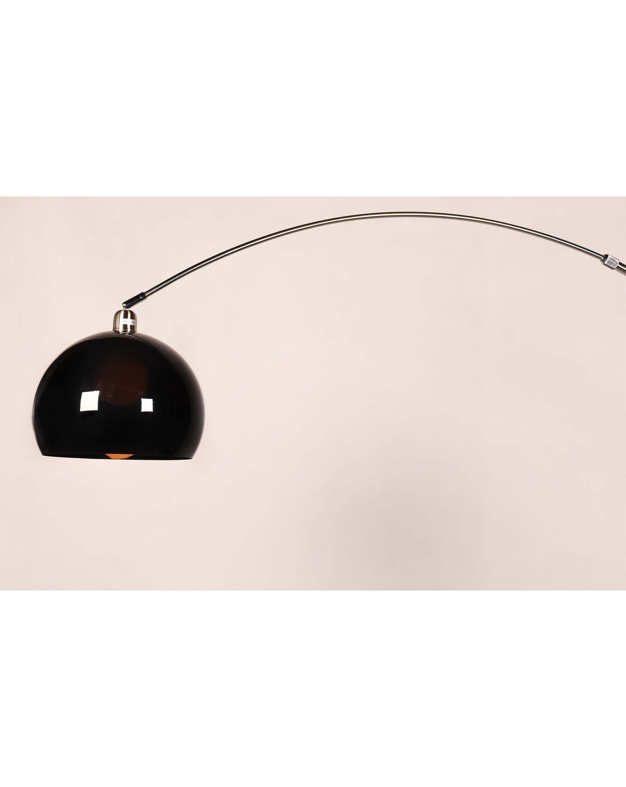 Czarna oprawa podłogowa o nowoczesnym, modernistycznym designie. Przykuwa wzrok intrygującą podpórką wyginającą się na kształt łuku oraz prostym klosze o formie geometrycznej kopuły. Ustawiona na nietypowej, bo wykonanej z granitu podstawie, która zapewnia lampie maksymalną stabilność — zapobiega chwianiu się stelaża na boki, zawsze utrzymuje go w jednej pozycji.