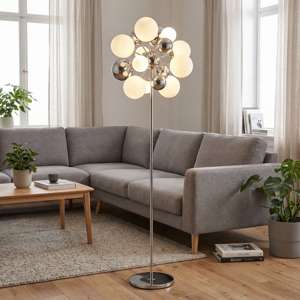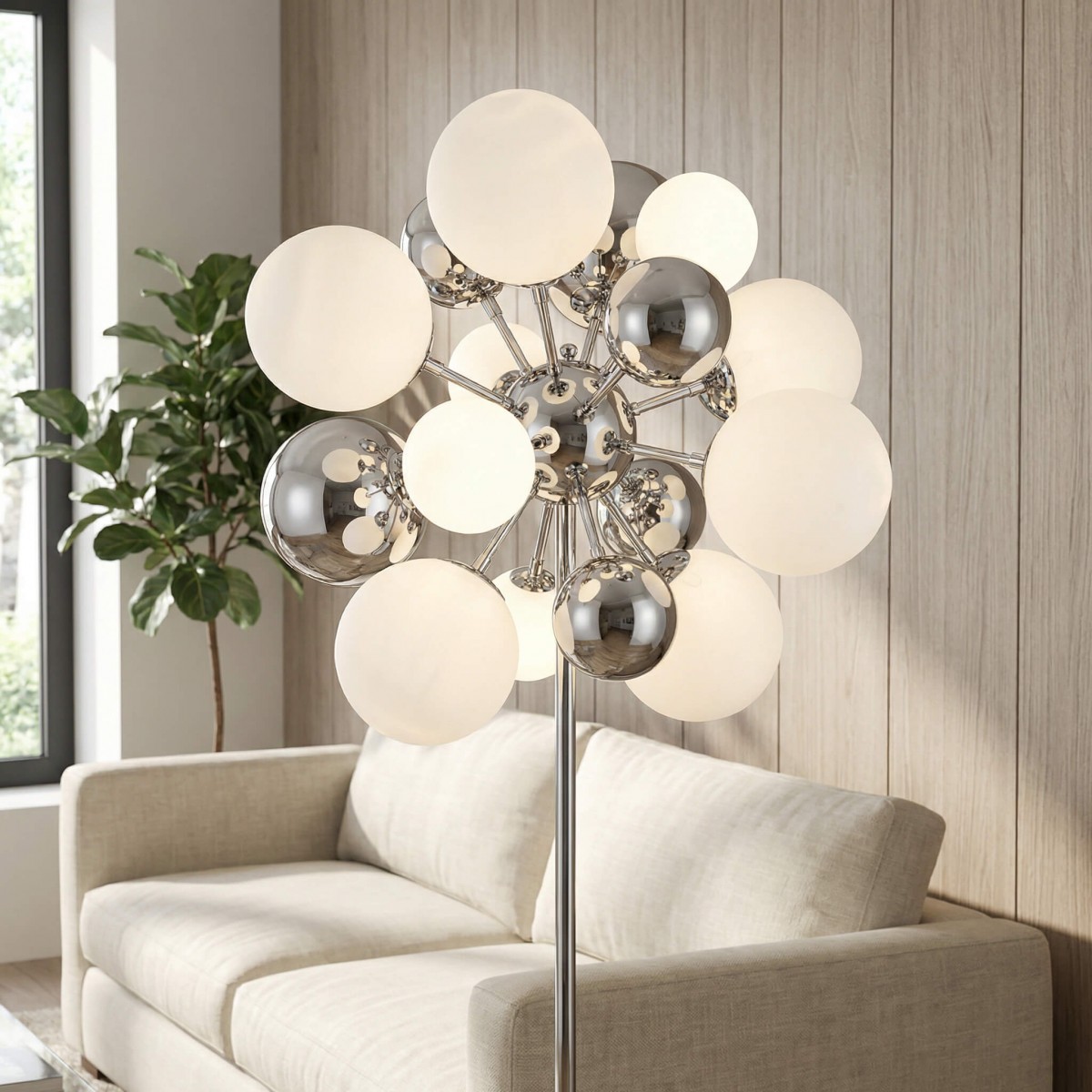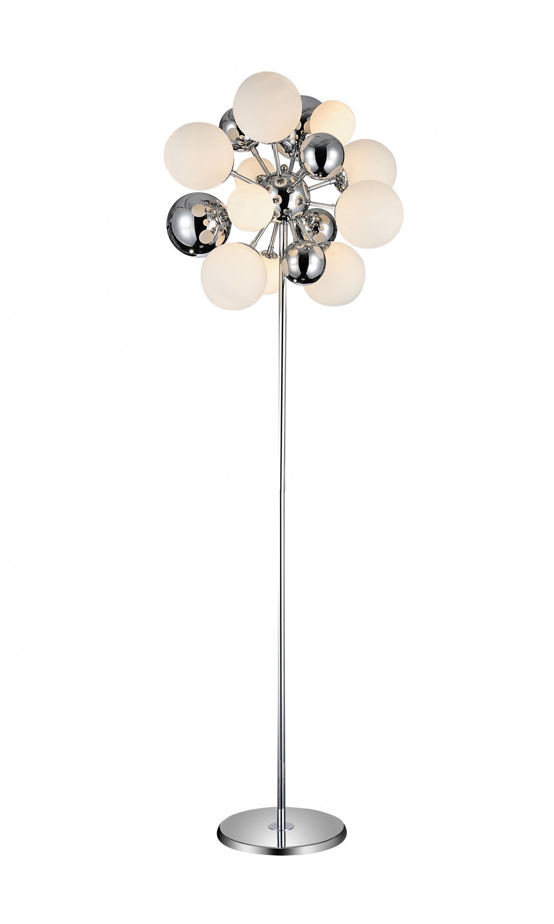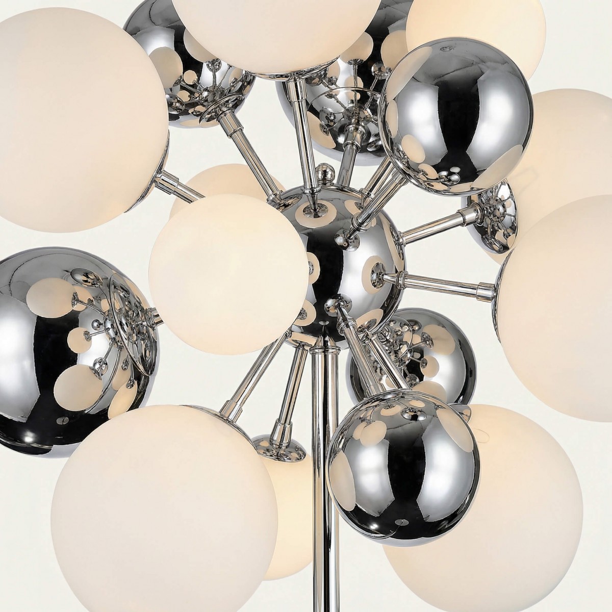 Nowoczesna lampa stojąca podłogowa o wydłużonym ramieniu. Maksymalne wyciągnięcie do góry pozwala jej oświetlać salony, gabinety i poczekalnie tak samo dobrze jak standardowe lampy wiszące. Świetlne kule wykonane z białego szkła i chromowanego metalu niejednostajnie rozmieszczono na promienistych ramionach. Śmiała propozycja z nutą humoru, utrzymana w modnym stylu hi-tech.