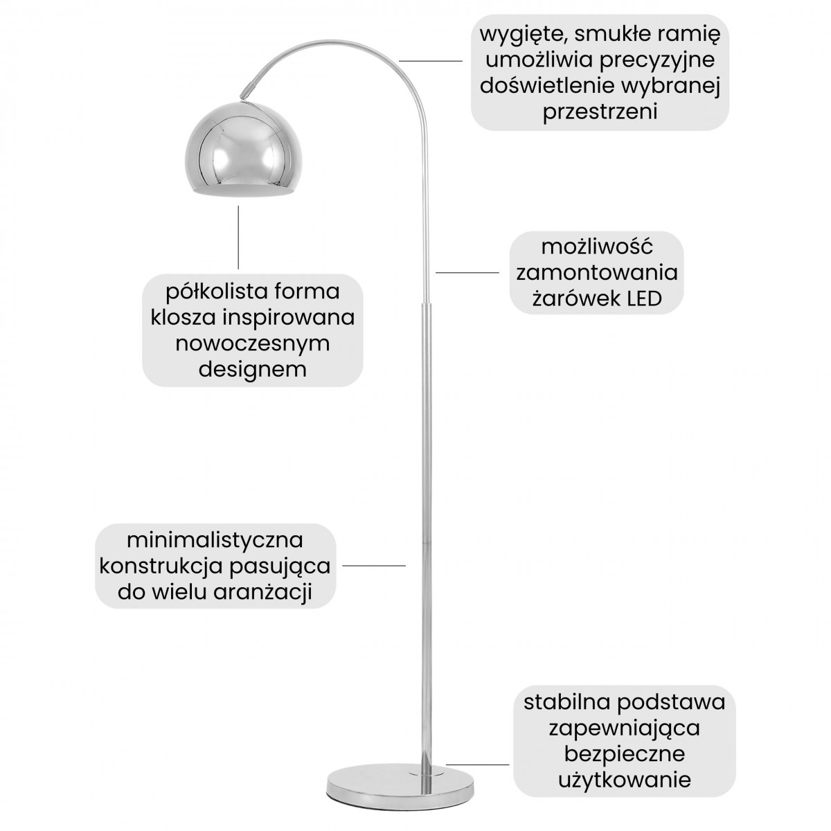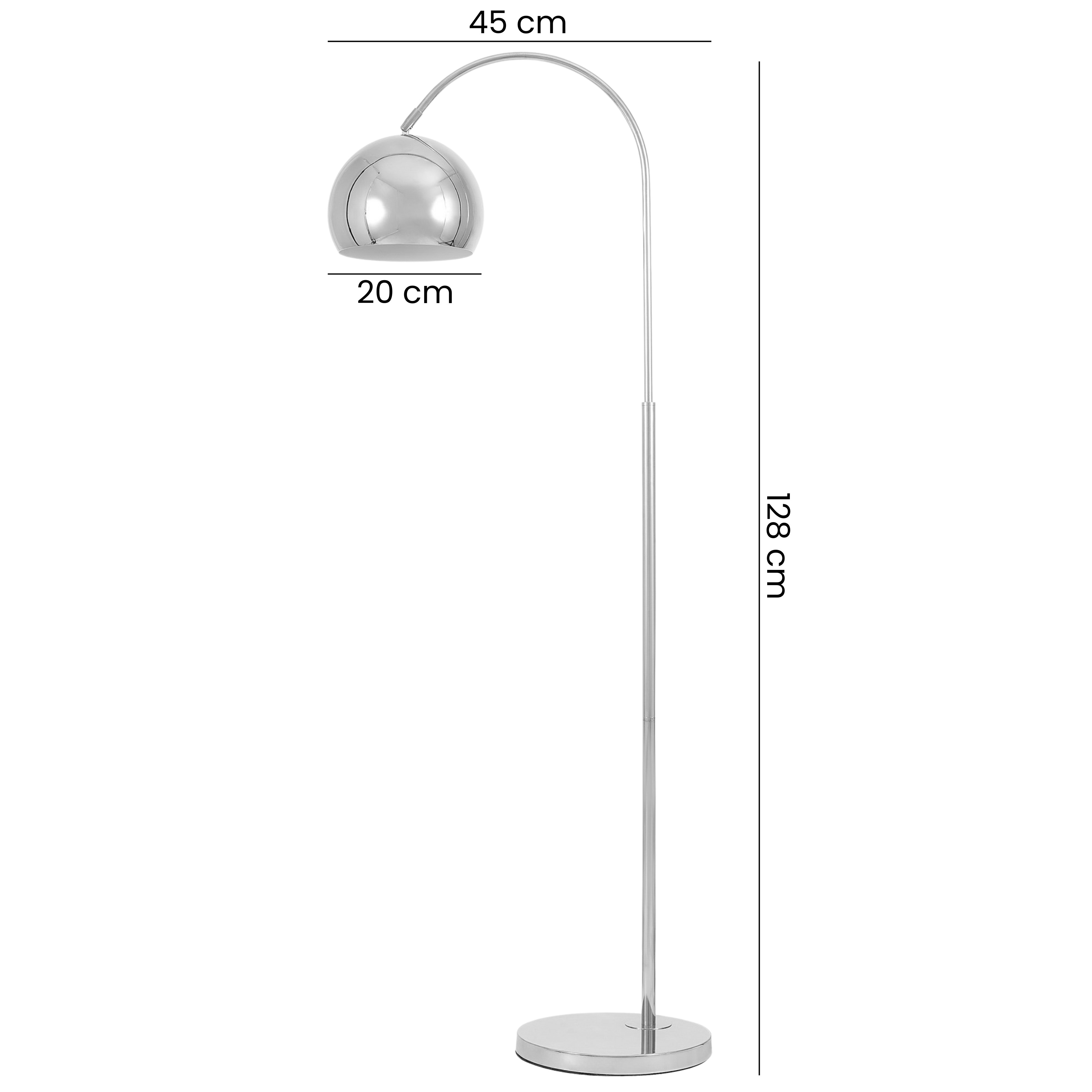 NEVO to lampa z chromowanym kloszem o półkolistej formie, umieszczonym na smukłym, łukowym ramieniu. Nowoczesny design i przemyślana forma sprawiają, że model pełni nie tylko funkcję użytkową, ale również dekoracyjną. Światło skierowane jest w dół, co pozwala doświetlić konkretną strefę - miejsce do czytania, rozmów lub wieczornego odpoczynku - przez co NEVO doskonale sprawdzi się jako lampa do salonu, sypialni czy biura.