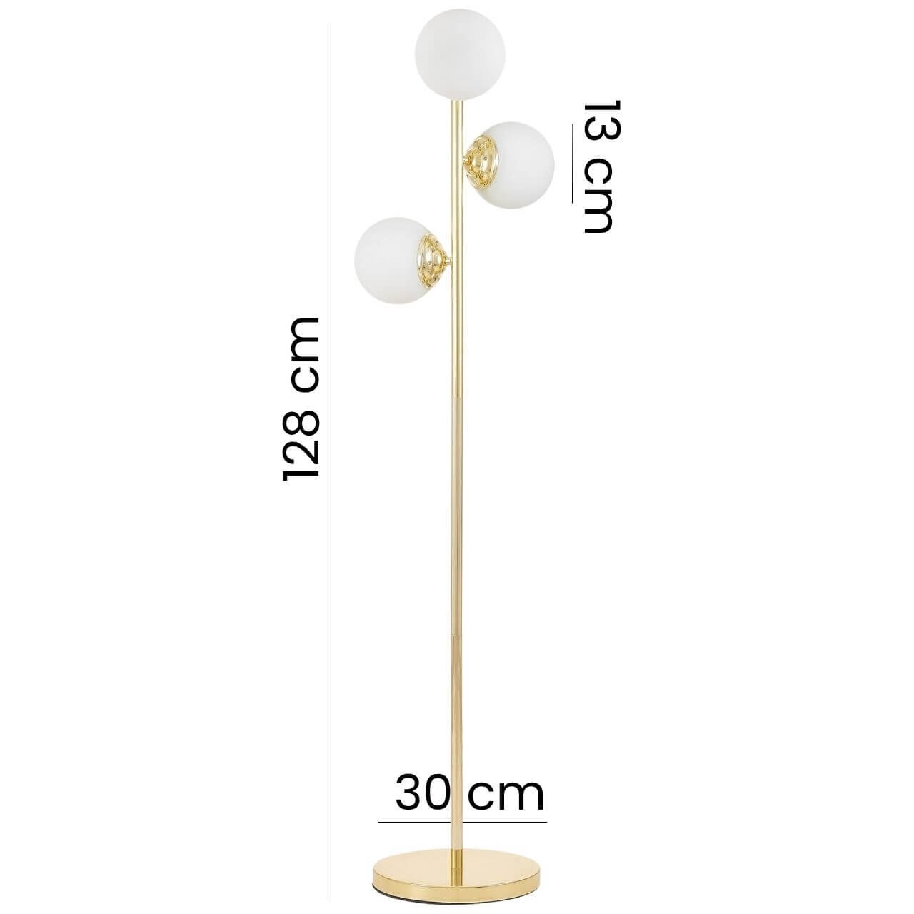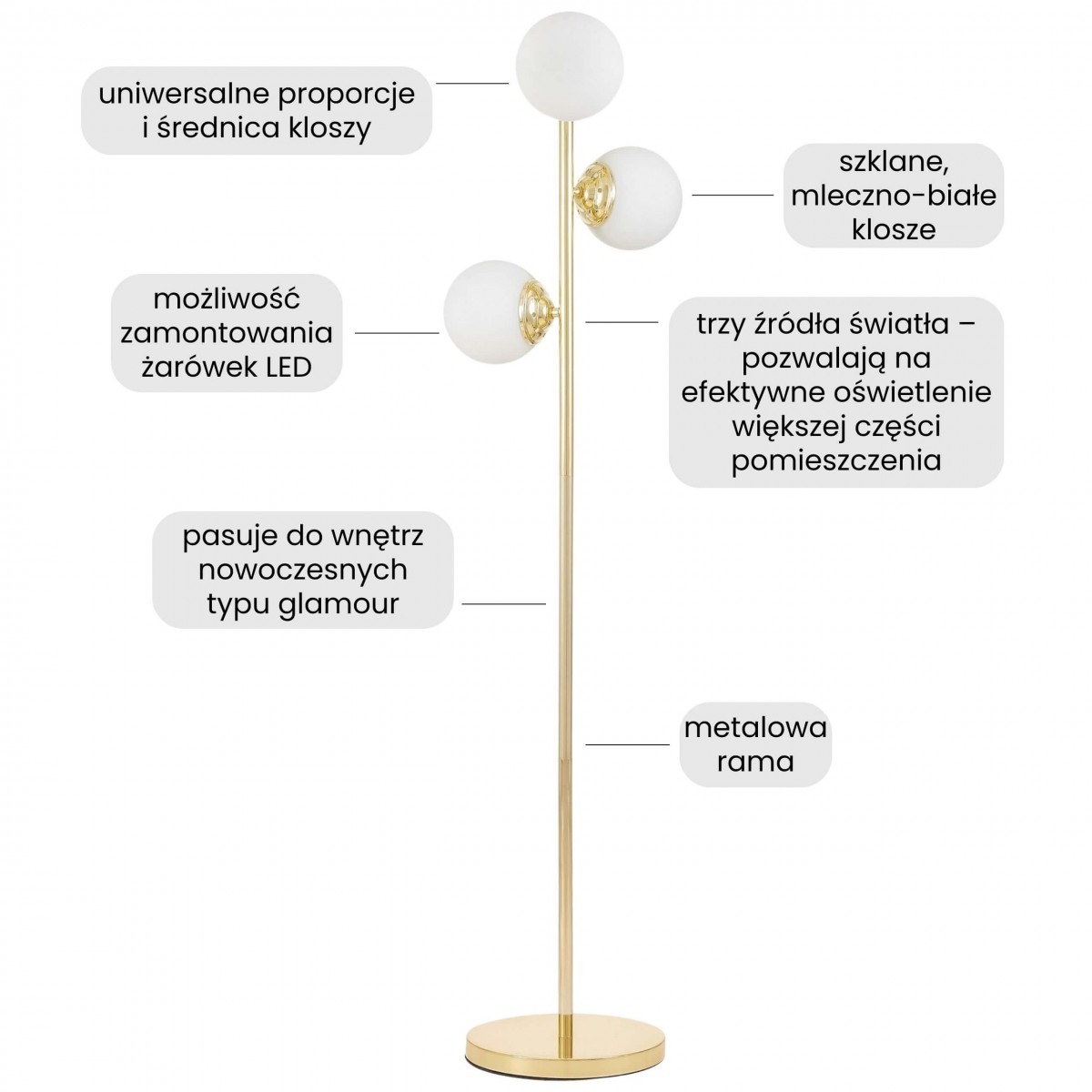 Złota lampa stojąca FINO W3 to propozycja dla osób, które lubią, gdy oświetlenie jest czymś więcej niż tylko praktycznym dodatkiem. Jej smukła konstrukcja i trzy mleczne kule wprowadzają do wnętrz lekkość, a złote wykończenie ociepla aranżację i nadaje jej reprezentacyjnego charakteru.