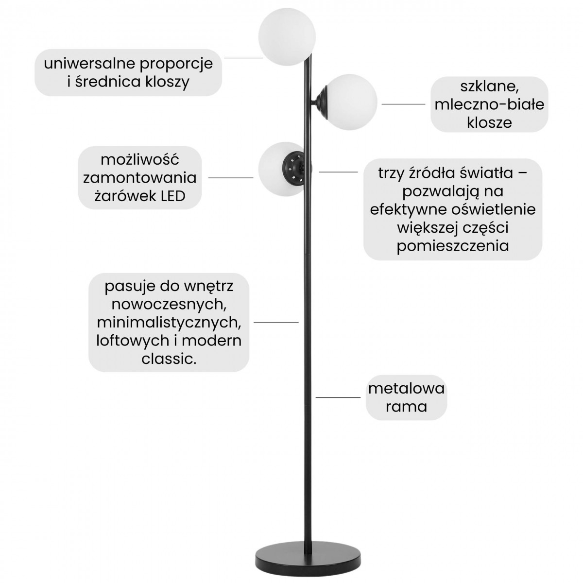 Lampa stojąca FINO W3 w czerni to model, który łączy prostotę formy z nowoczesnym charakterem. Smukła konstrukcja i trzy kuliste klosze tworzą detal, który sprawdza się w wielu aranżacjach – od minimalistycznych po nowoczesne i industrialne.
