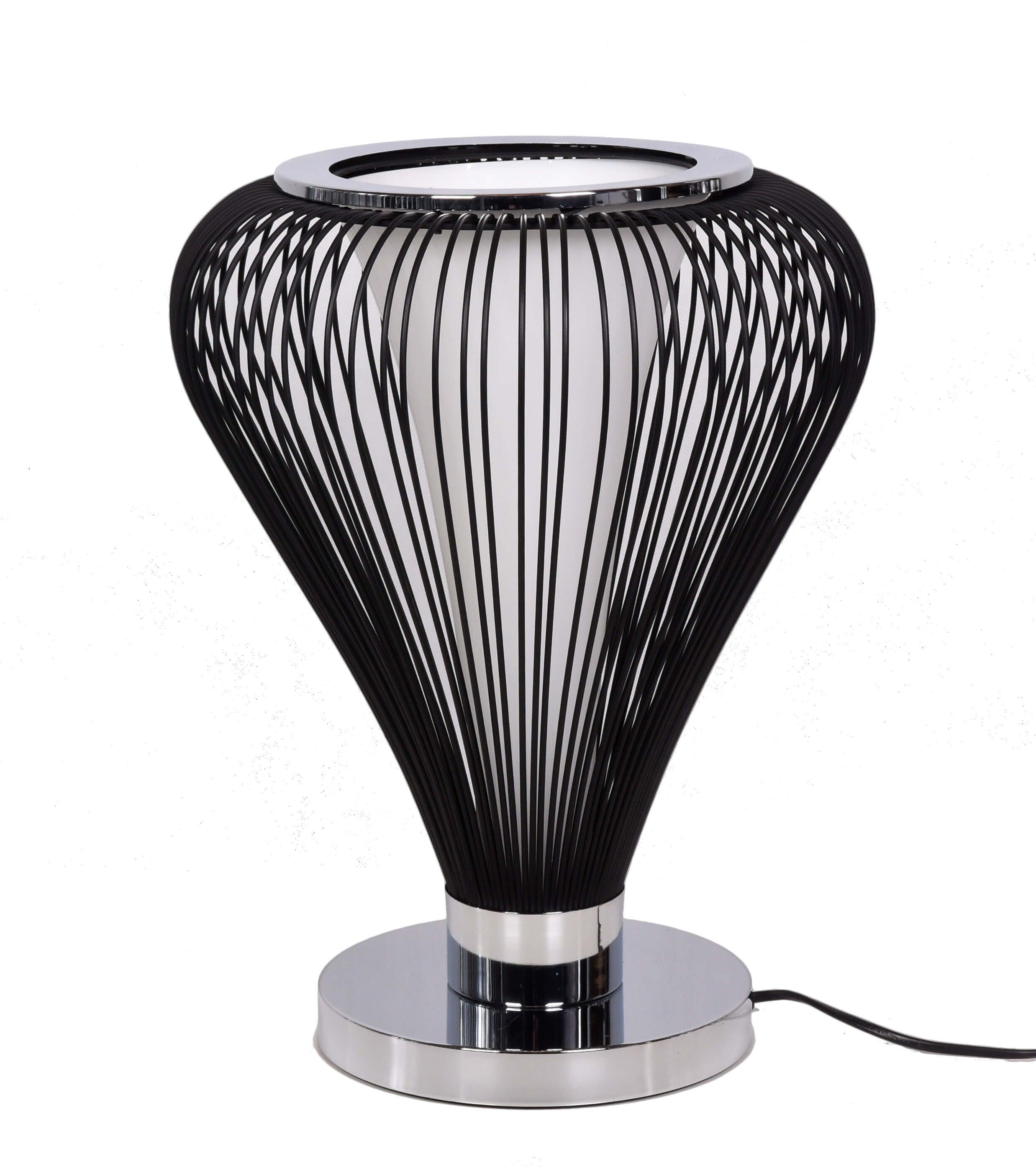 Seria MARTINES przyciąga uwagę niespotykanymi wcześniej pomysłami na oświetlenie, zmieniając jednocześnie postrzeganie go wyłącznie w charakterze funkcjonalności. Lampa biurkowa intryguje swoją opływową bryłą, składającą się z licznych, czarnych pręcików okalających trzon lampy. W jej stożkowym wnętrzu znajduje się źródło światła, które ciekawie doświetla wnętrze zarówno z boków, jak i od góry. Chromowana obręcz u góry wspólnie z chromowaną podstawą uzupełniają efekt o kontrastujące ze sobą barwy.