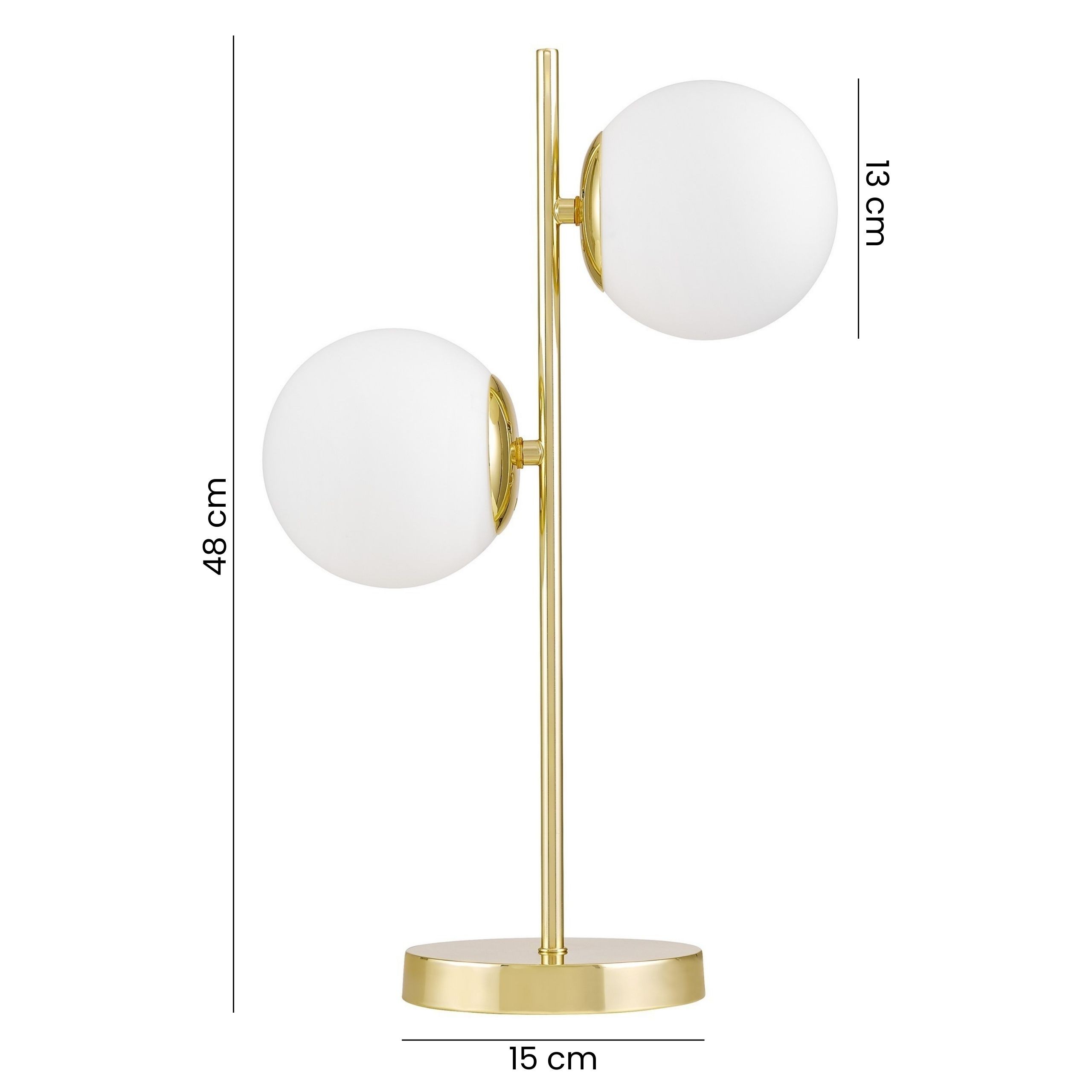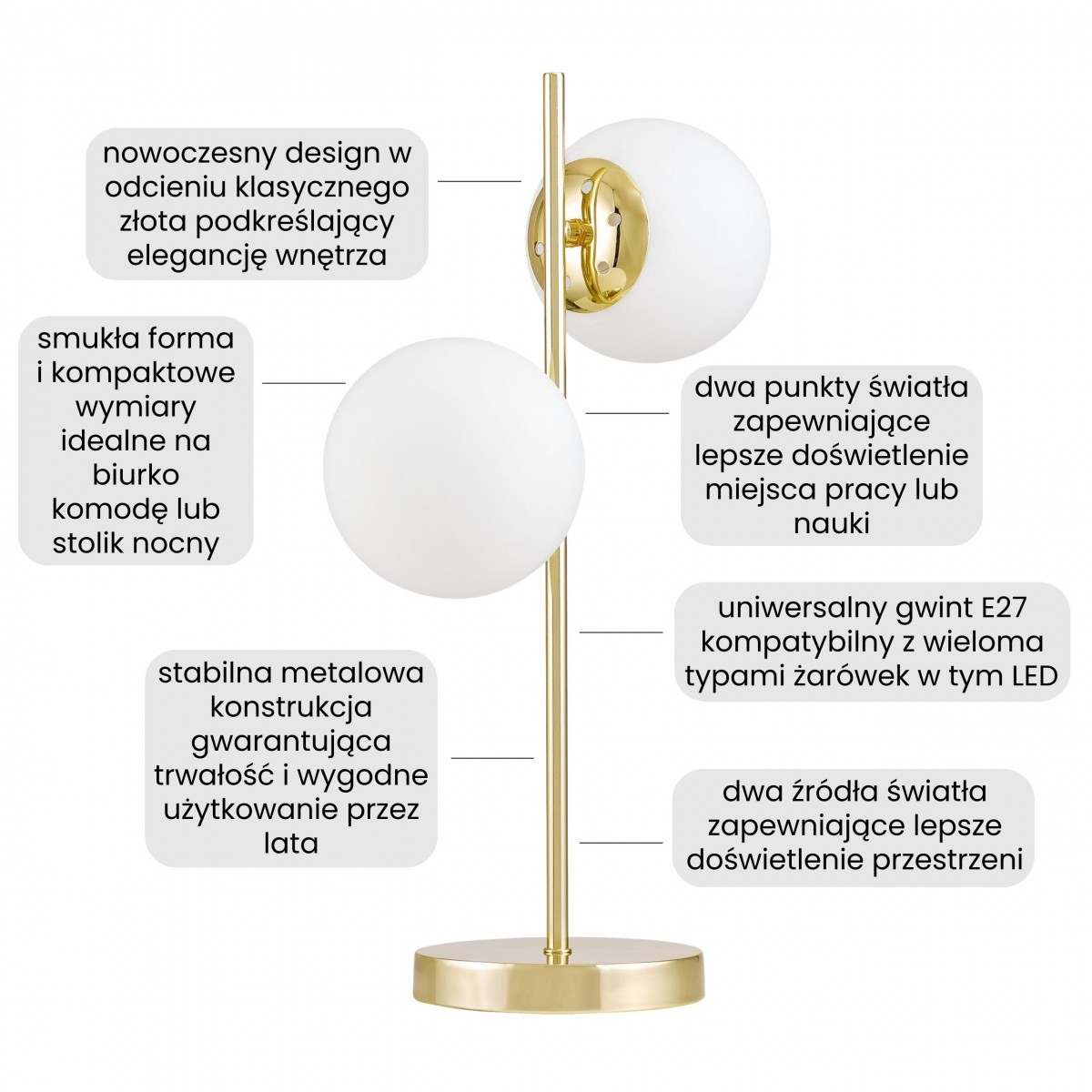 TESO W2 to nowoczesny model, który udowadnia, że lampa biurkowa może być dekoracją równie elegancką co salonowy żyrandol. Połączyliśmy smukłą, złotą konstrukcję z dwiema mlecznymi kloszami w kształcie kul, które idealnie pasują jako oświetlenie na biurko w domowym gabinecie, konsolę w przedpokoju lub jako stylowa lampka nocna na szafki w sypialni.