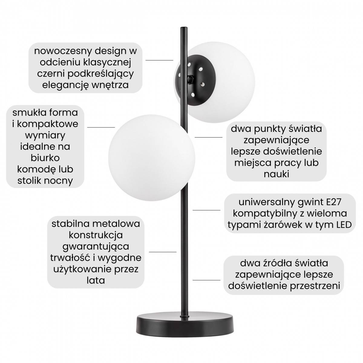 Czarna lampa stołowa z serii TESO powstała z myślą o zwolennikach nowoczesnego, nieskomplikowanego oświetlenia. Zaprojektowaliśmy model, w którym zdecydowaliśmy się połączyć czarny, smukły stelaż z dwiema białymi kulami. To klasyczny zestaw, który pasuje wszędzie i nie gryzie się z żadnymi dodatkami.