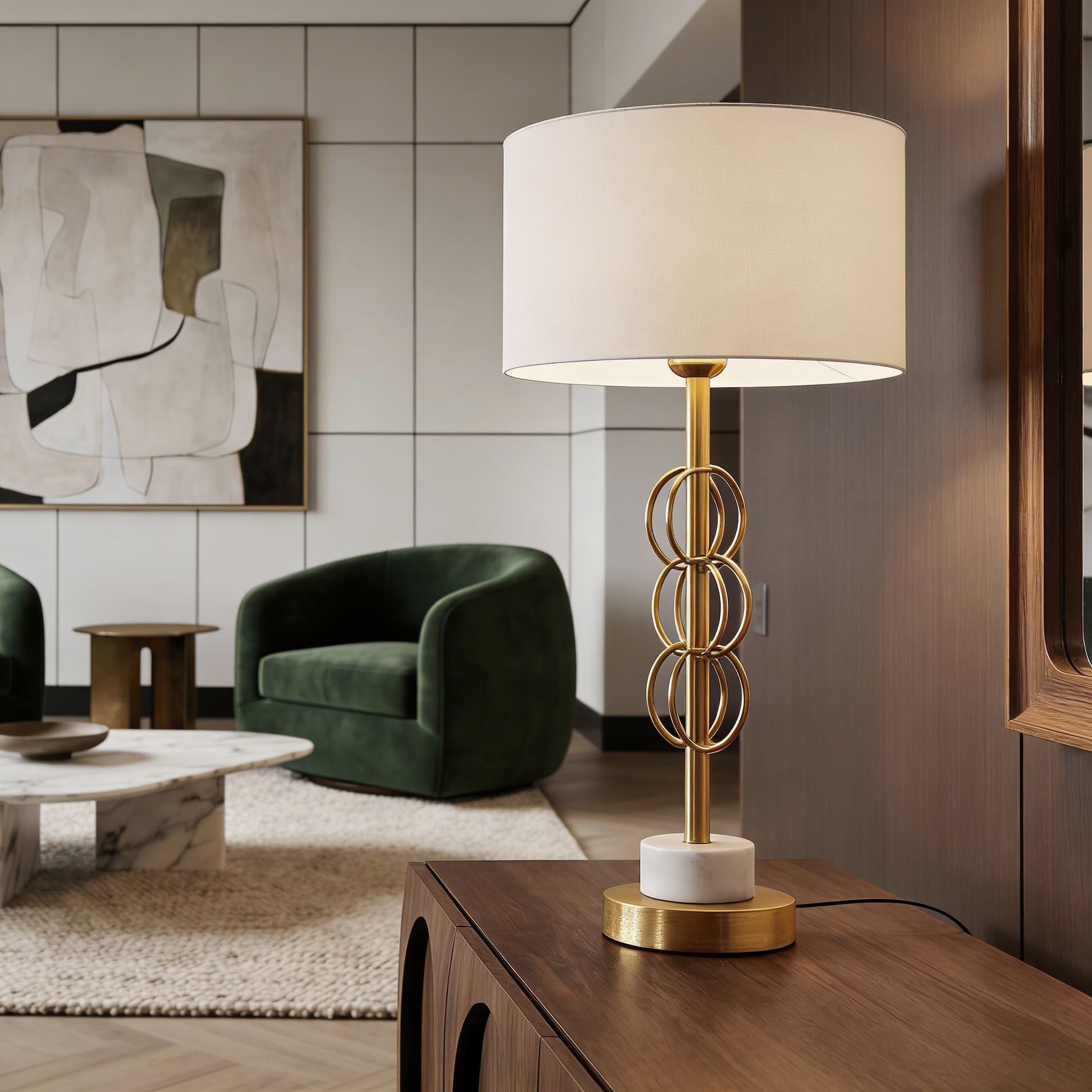 Lampa stołowa Azzaria to dekoracyjny i użytkowy sposób na aranżację wnętrza w eleganckim, wyszukanym stylu. Doskonale sprawdzi się w pomieszczeniach, w których dominuje styl wytworny, np. w sypialni, salonie lub eleganckim punkcie usługowym. Wysoka jakość wykonania i misterne mosiężne elementy, w połączeniu z pięknym białym kloszem oraz marmurową białą podstawą, zapewnią rozświetlenie i powiew elegancji w każdym wnętrzu. Subtelne połączenia kolorystyczne sprawiają, że lampa nocna Azzaria zapewni przytulny klimat i wpasuje się nie tylko w nowoczesne aranżacje wnętrz, ale również bardziej klasyczne z nutką luksusu.