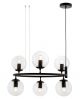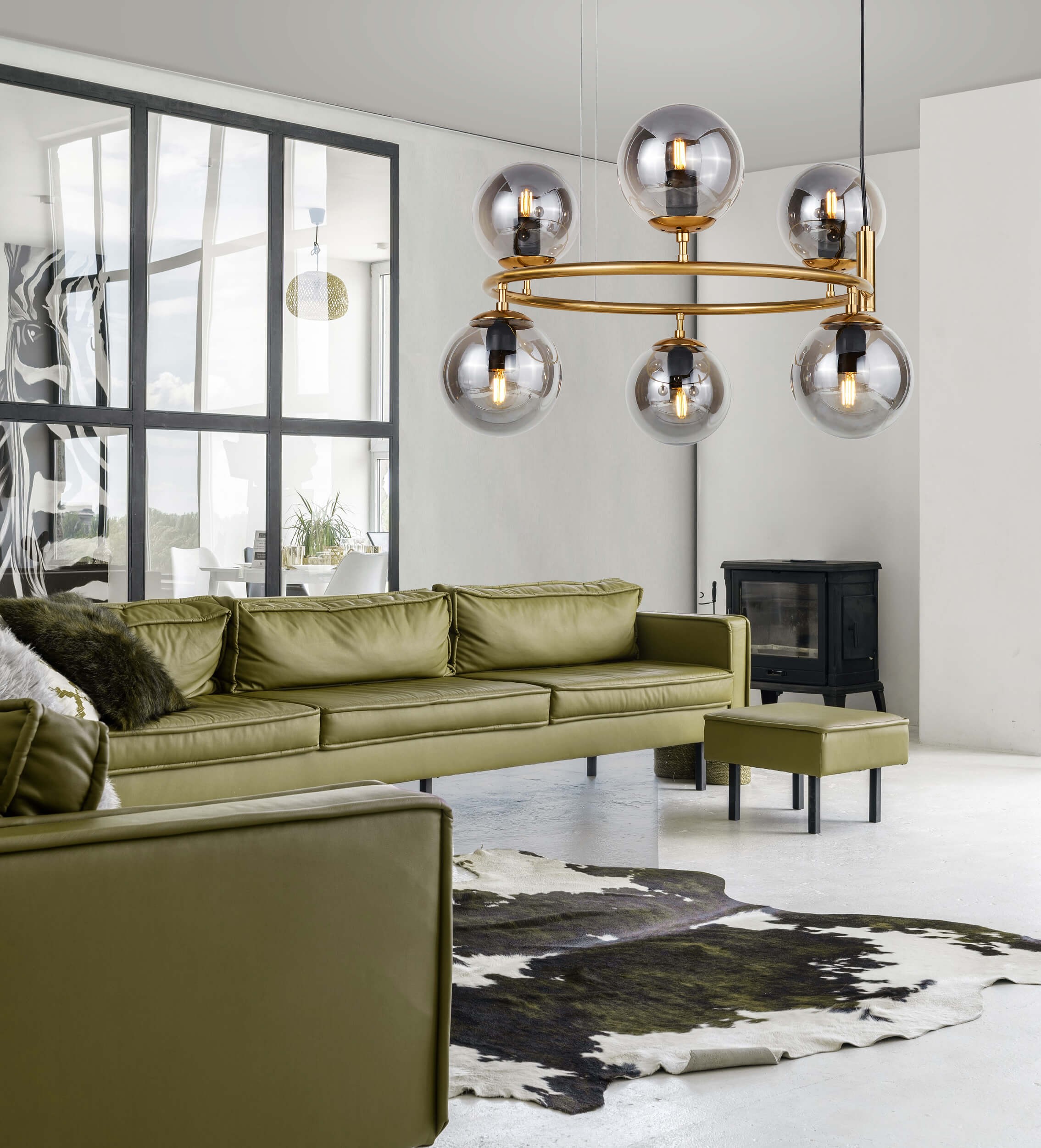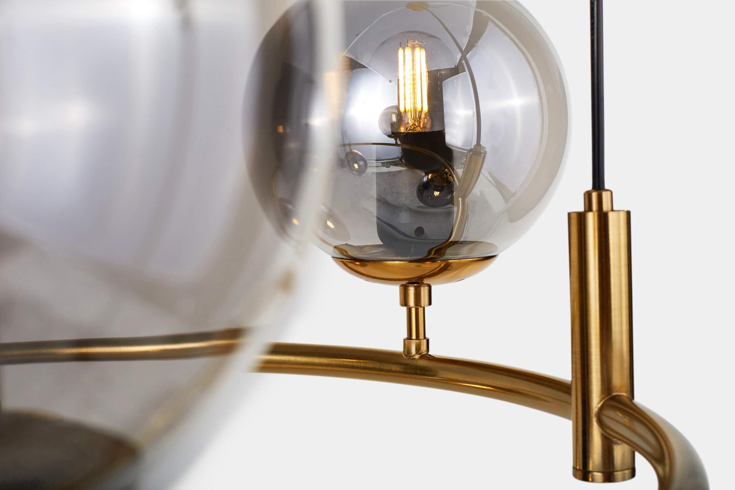 CEREDO to seria oświetlenia, która wyśmienicie akcentuje styl industrialny, opierając go na innowacyjnej bazie. Połączenie tych dwóch nurtów daje szczególny wymiar produktom, gdyż stają się one zestawieniem obecnej mody, świeżości, wyważonego luksusu oraz swobody. Nadmiar czy przesyt dekoracji tutaj nie istnieje – w zamian za to projektanci prezentowanej kolekcji proponują intrygujące kompozycje ze szkła i metalu w ciekawej kolorystyce. Rama lampy to metalowy, mosiężny okrąg z symetrycznie rozmieszczonymi na nim niewielkimi elementami, tworzącymi ramiona, zakończone podstawami dla kloszy. Sześć szklanych kul umieszczono na przemian u góry i u dołu okręgu, tworząc spójną i funkcjonalną całość. Wsparciem dla konstrukcji są z jednej strony dwie cienkie linki przymocowywane bezpośrednio do sufitu, a z drugiej czarny kabel o sporej regulacji długości, którego koniec umieszczono wewnątrz okrągłej, mosiężnej podsufitki.