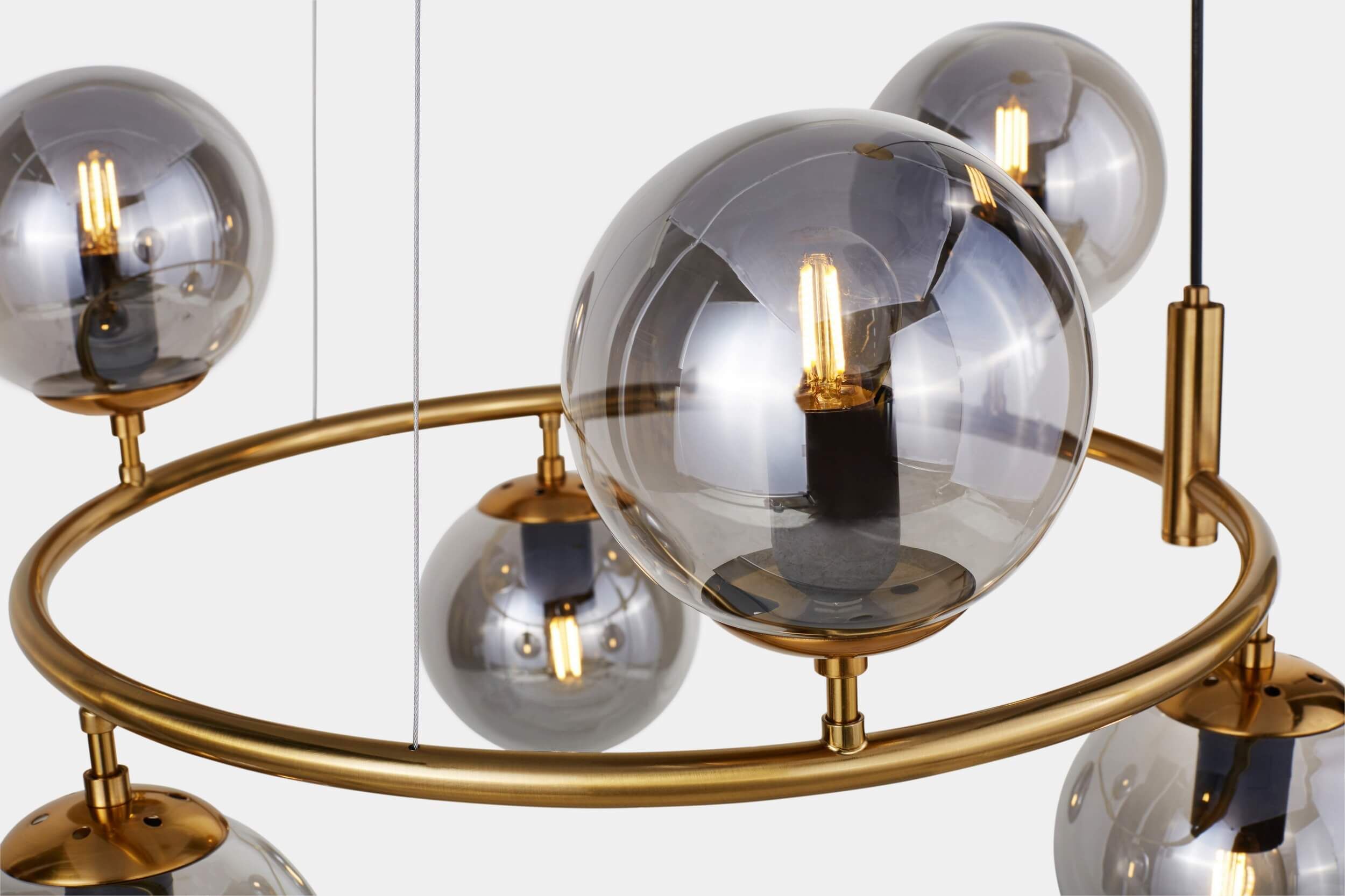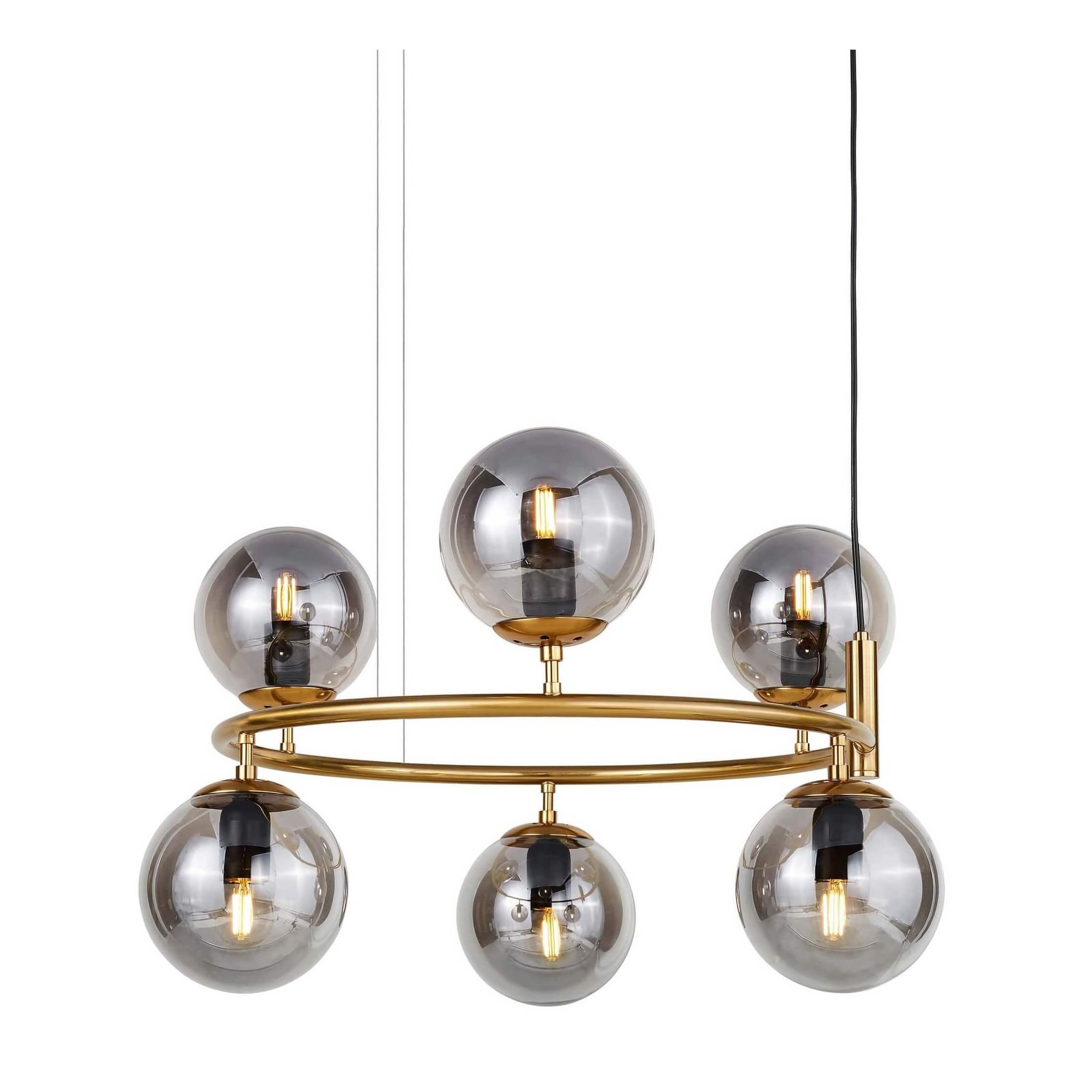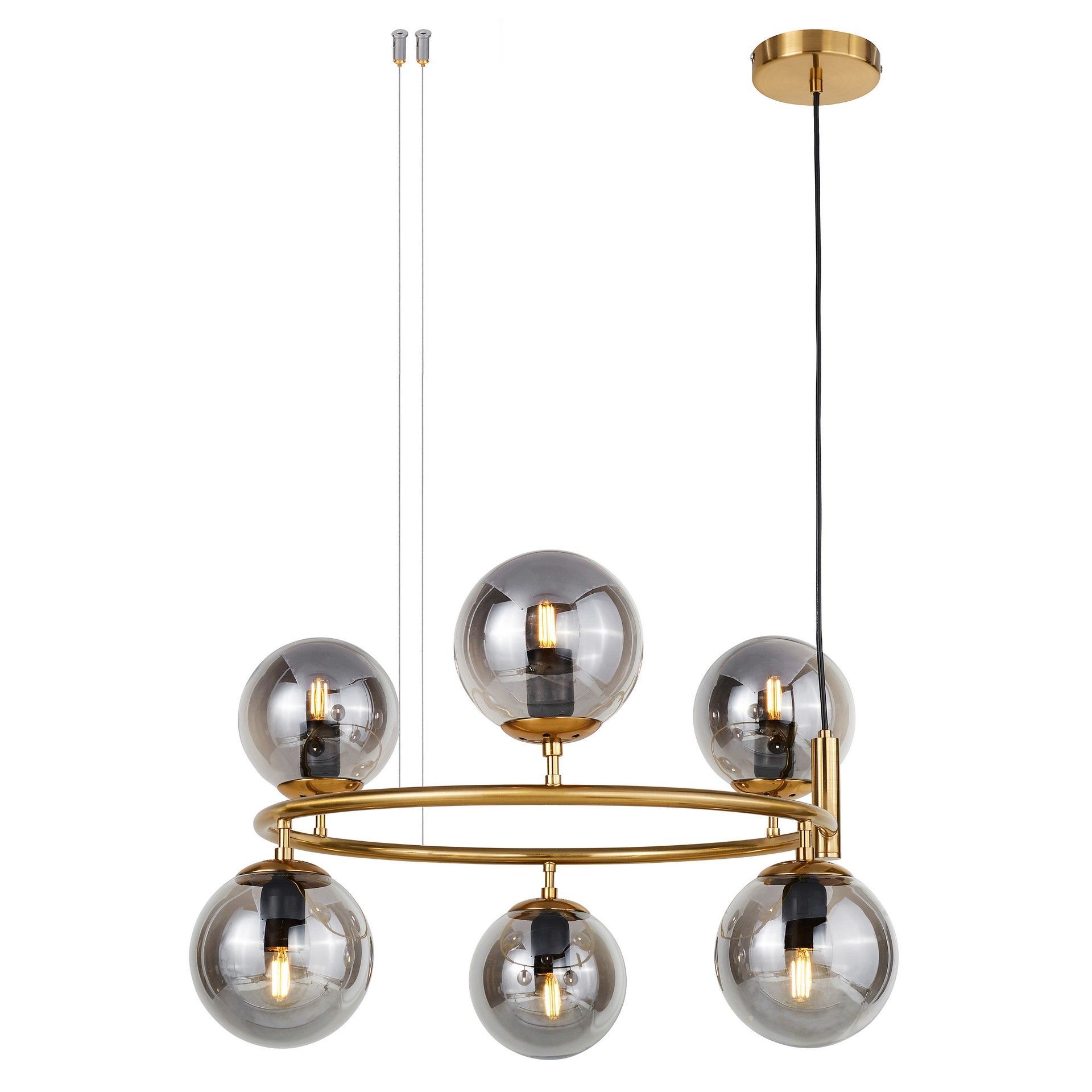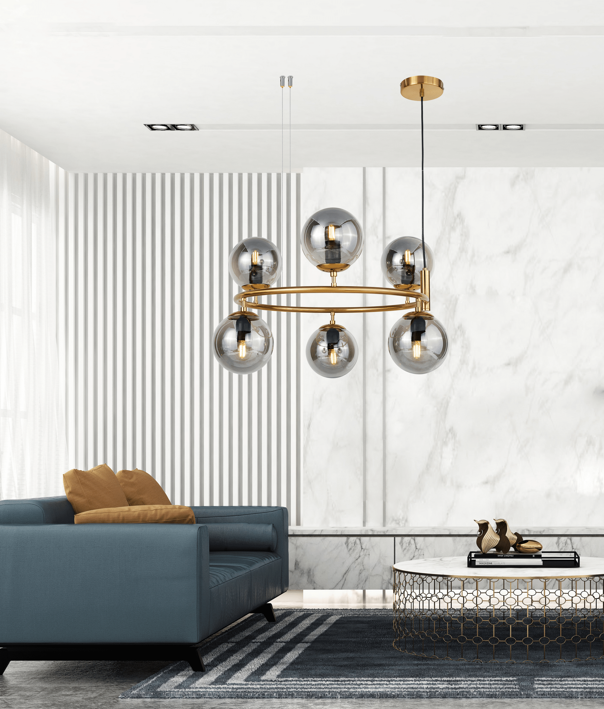 Wykonana częściowo z nowoczesną nutą, a po części w nurcie loftowym lampa wisząca CEREDO W6 to produkt idealny przede wszystkim do pokoju dziennego, sypialni i jadalni. Jego mosiężna oprawa doskonale podkreśli elegancję oraz wyjątkowość aranżacji, a sześć okrągłych kloszy dostatecznie rozświetli przestrzeń blaskiem padającym zza szkła w dymionym szarym kolorze.