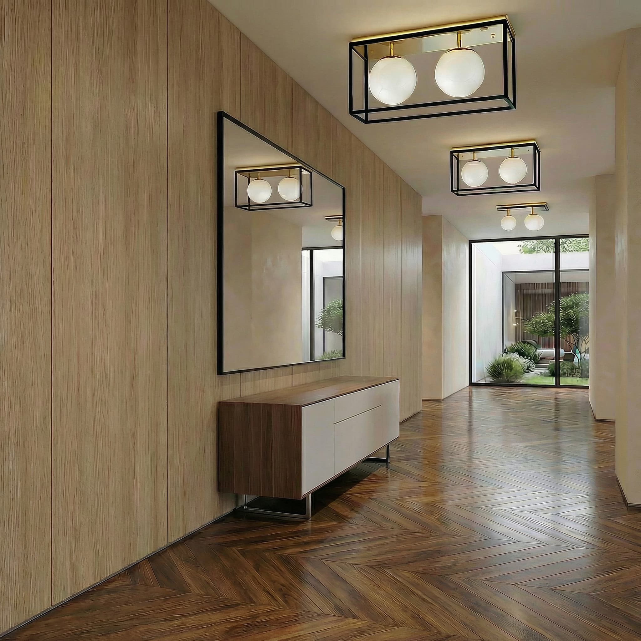 Geometryczna konstrukcja plafonu została podkreślona wykończeniem w kolorze szlachetnego złota, co nadaje mu luksusowego charakteru. Metalowa rama i dwa mleczne klosze tworzą nowoczesną, architektoniczną formę, która stanowi ozdobę każdego wnętrza.