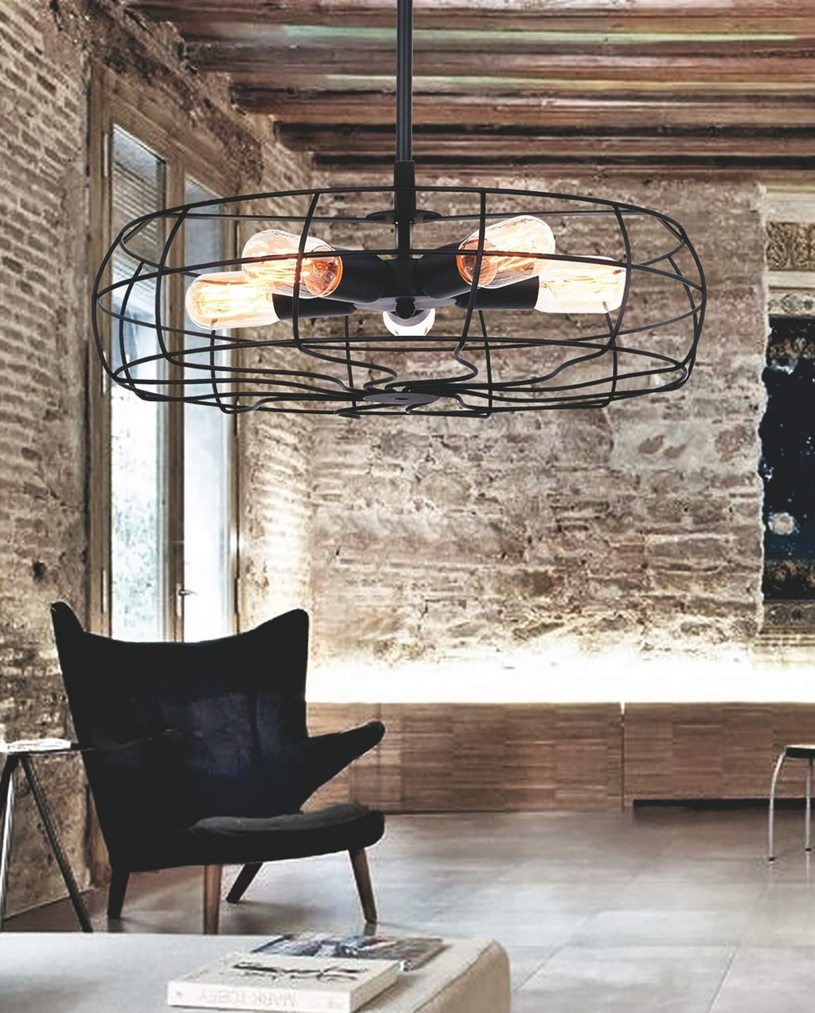 Wielopunktowa lampa wisząca loft w szalenie modnej, industrialnej stylistyce. Zbudowana z pięciu punktów świetlnych, otoczona przez czarny metalowy klosz. Imitacja drucianej foremnej klatki zawieszona na minimalistycznym kablu o regulowanej długości. Choć jest duża i zapewnia mnóstwo światła, dzięki zastosowaniu półotwartej konstrukcji nie dominuje wnętrz - nadaje się także do małych pomieszczeń.