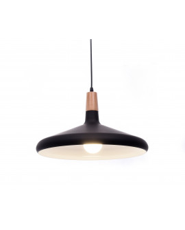 Nowoczesny, jednopunktowy zwis w stylu skandynawskim. Zachowawcza, spłaszczona forma prostego klosza unowocześniona zwieńczającym brązowym akcentem. Duet dwóch, na pozór przeciwstawnych materiałów — klasycznego drewna i czarnego metalu — w rozrachunku wygląda zadziwiająco dobrze. Najciekawszy efekt można uzyskać przy niższym zawieszeniu, które pozwala dodatkowo wyeksponować cienki zgrabny kabel.