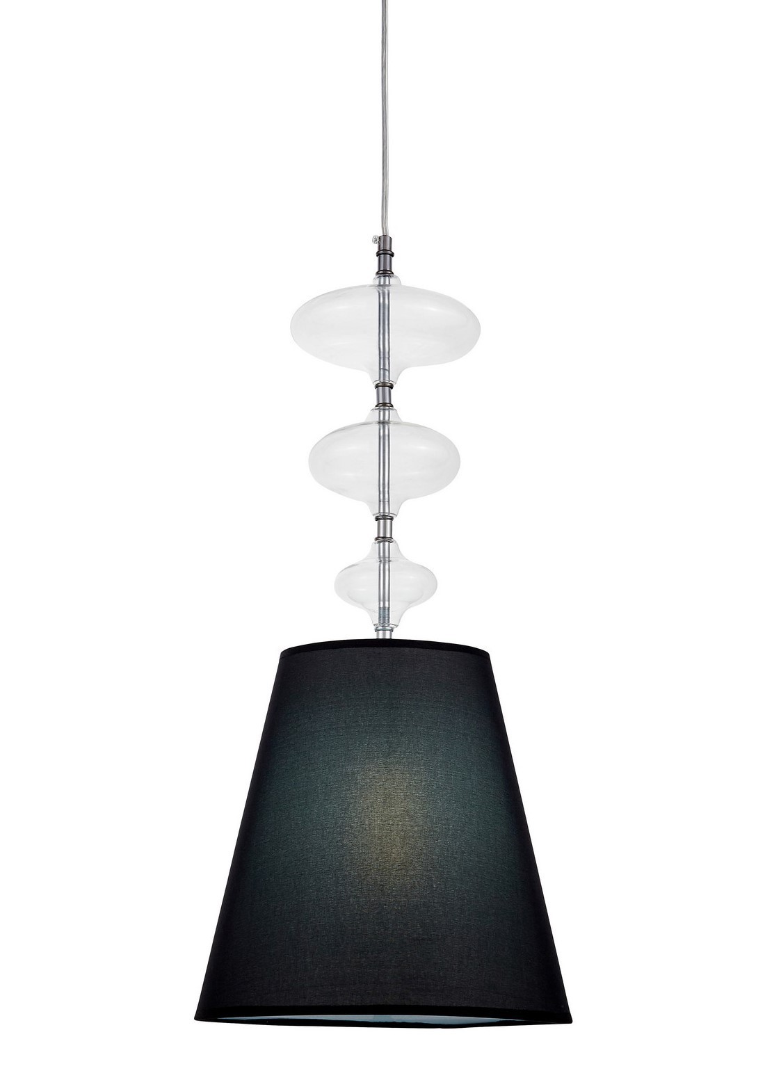 Czyste piękno ukryte w minimalistycznej konstrukcji. Czarna lampa wisząca emanuje ozdobnością każdym swoim detalem. Klasyczny stożkowaty abażur pokryto w niej grubą warstwą tkaniny. Nieoczywistym akcentem jest jej zawieszenie — przezroczysty cieniutki kabelek zdobiony zjawiskowymi szklistymi bryłami, przytwierdzony do elegancko chromowanej podsufitki. Konstrukcja dopracowana w każdym szczególe!
