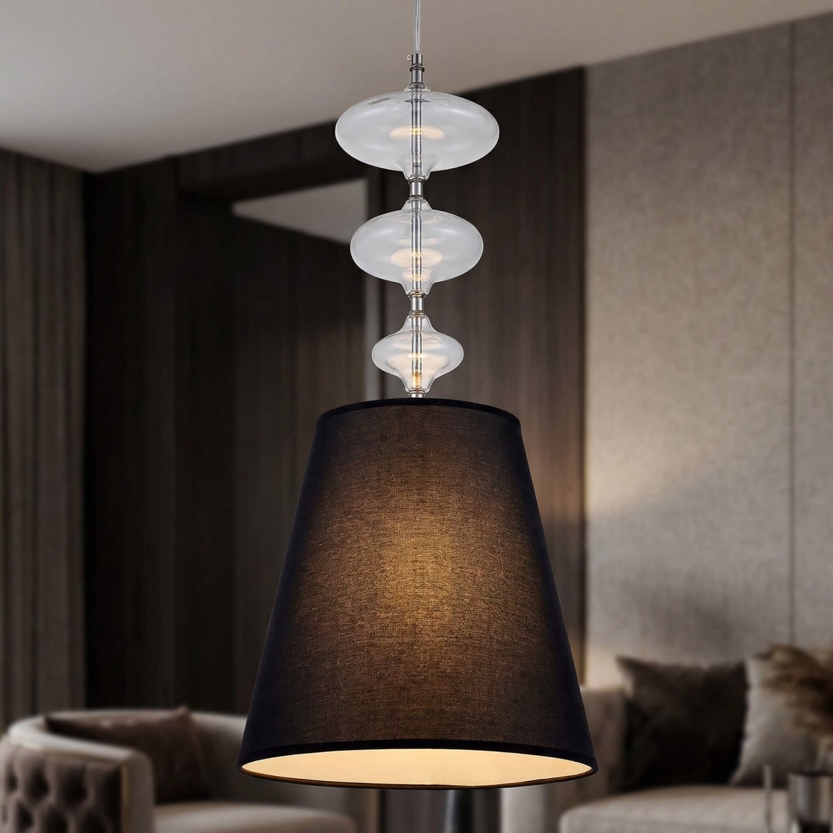 Czarny abażur z tkaniny subtelnie filtruje światło z pojedynczej żarówki E27, tworząc miękką, przytulną poświatę. To praktyczne i dekoracyjne oświetlenie, które sprawdzi się zarówno nad stołem w jadalni, jak i w strefie relaksu salonu.