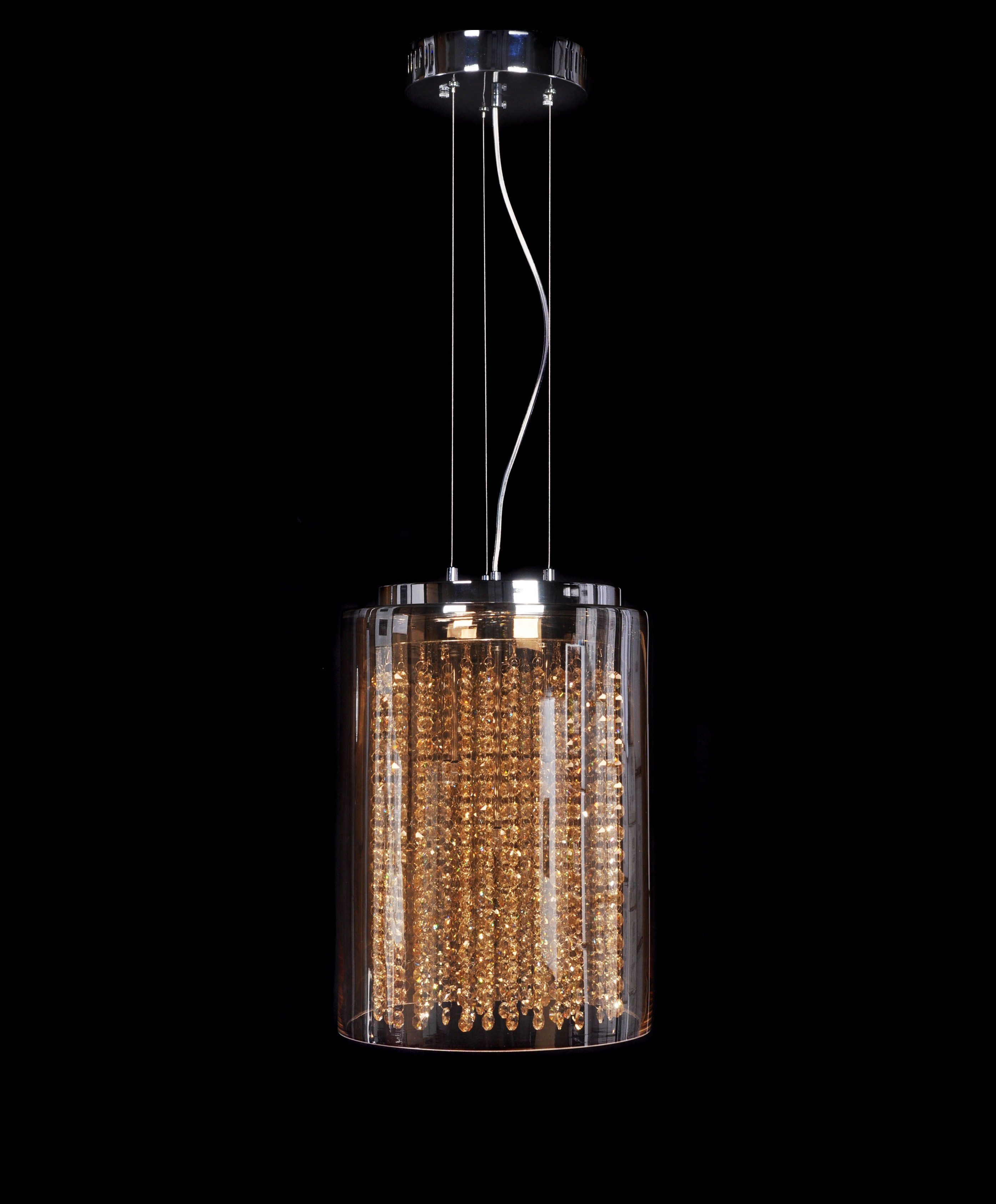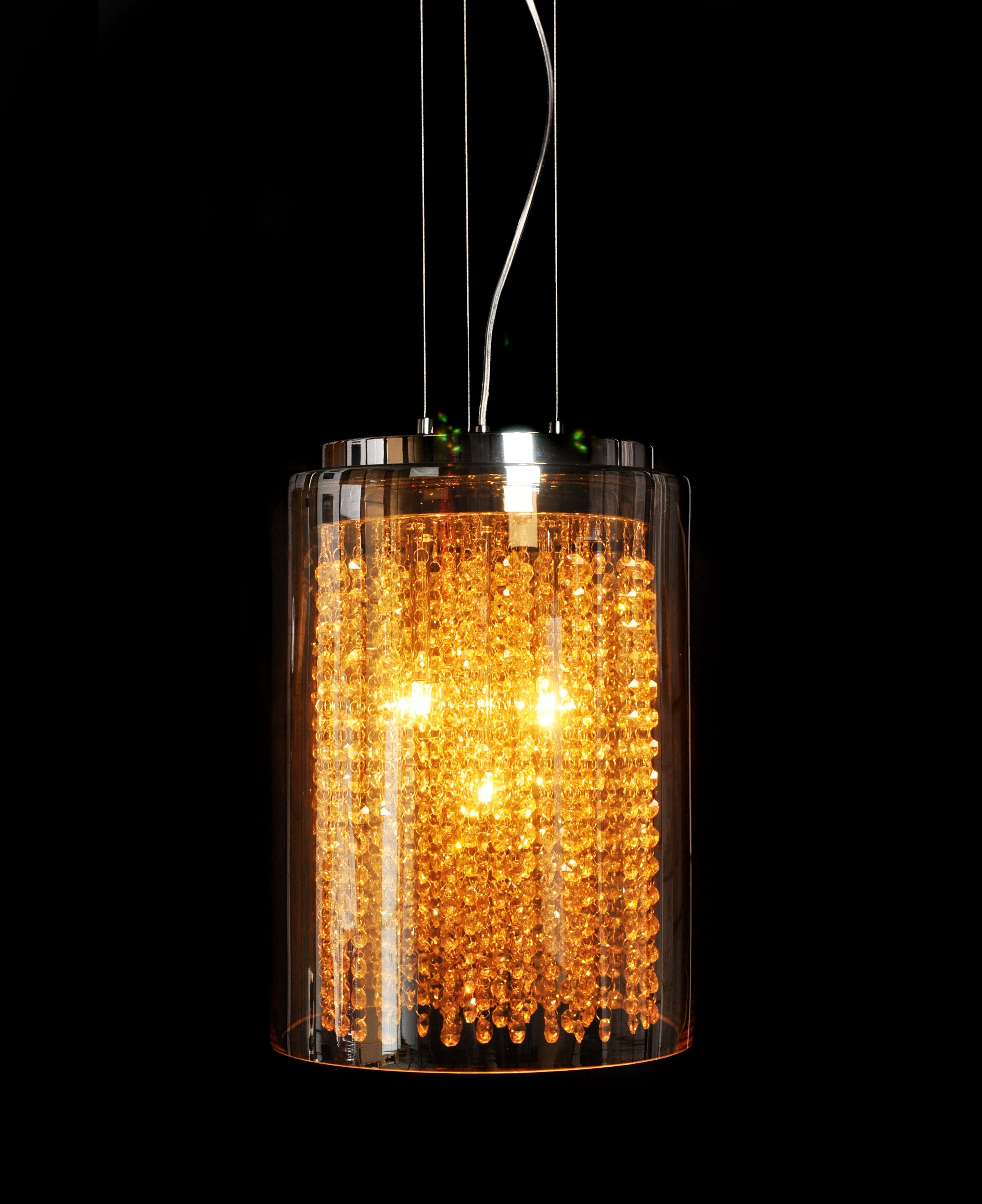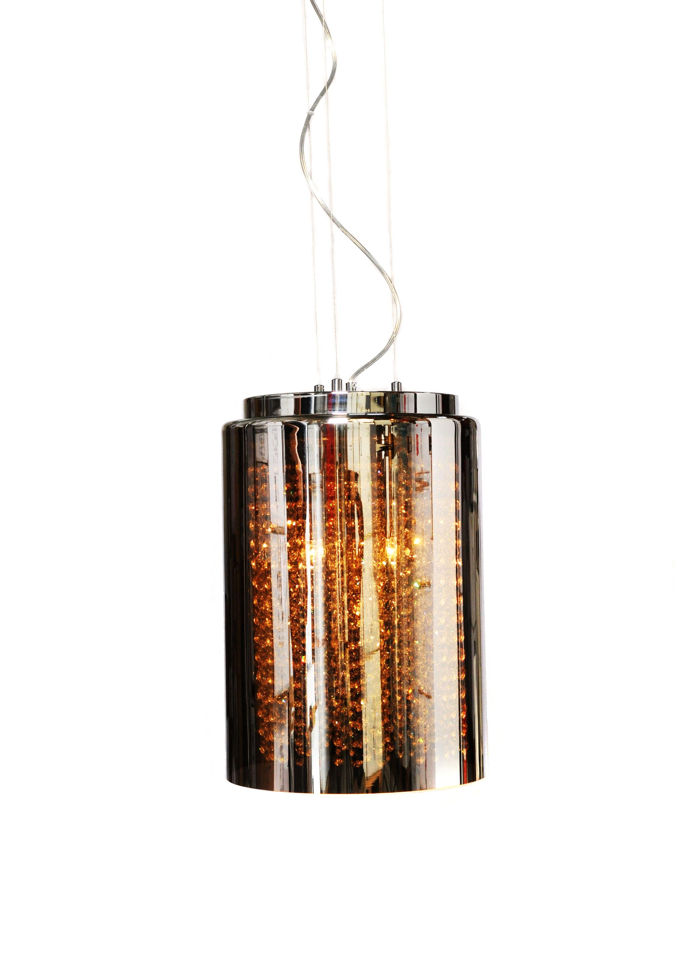 Kolekcja AMOREO pobudza wyobraźnię oraz przyćmiewa swoją postacią pozostałe dekoracje umieszczone we wnętrzu. Wykonana z połączenia metalu i szkła lampa wisząca stwarza możliwość zorganizowania klimatycznej, pełnej ciepła i nastroju przestrzeni, w której umieszczone zostanie oświetlenie o prostej, choć fantazyjnej kompozycji. Szklana tuba, która wypełniona została od wewnątrz bursztynowymi kamykami, doskonale rozświetla wnętrze pięcioma źródłami światła dającymi złotawy blask. Elementem kontrastowym jest chromowana podsufitka podłączona do lampy cienkimi linkami.