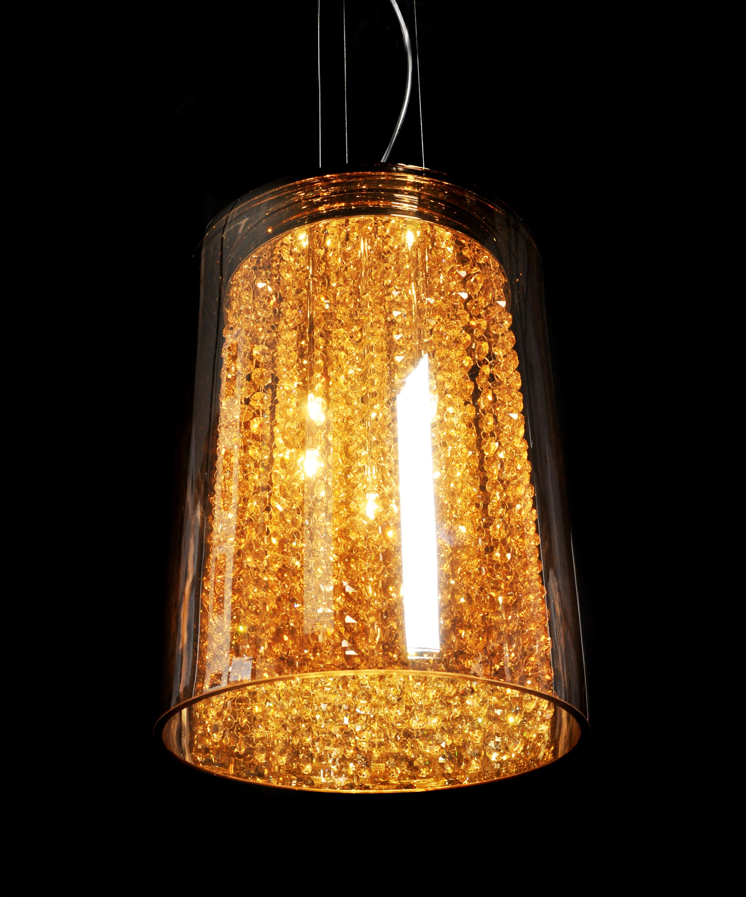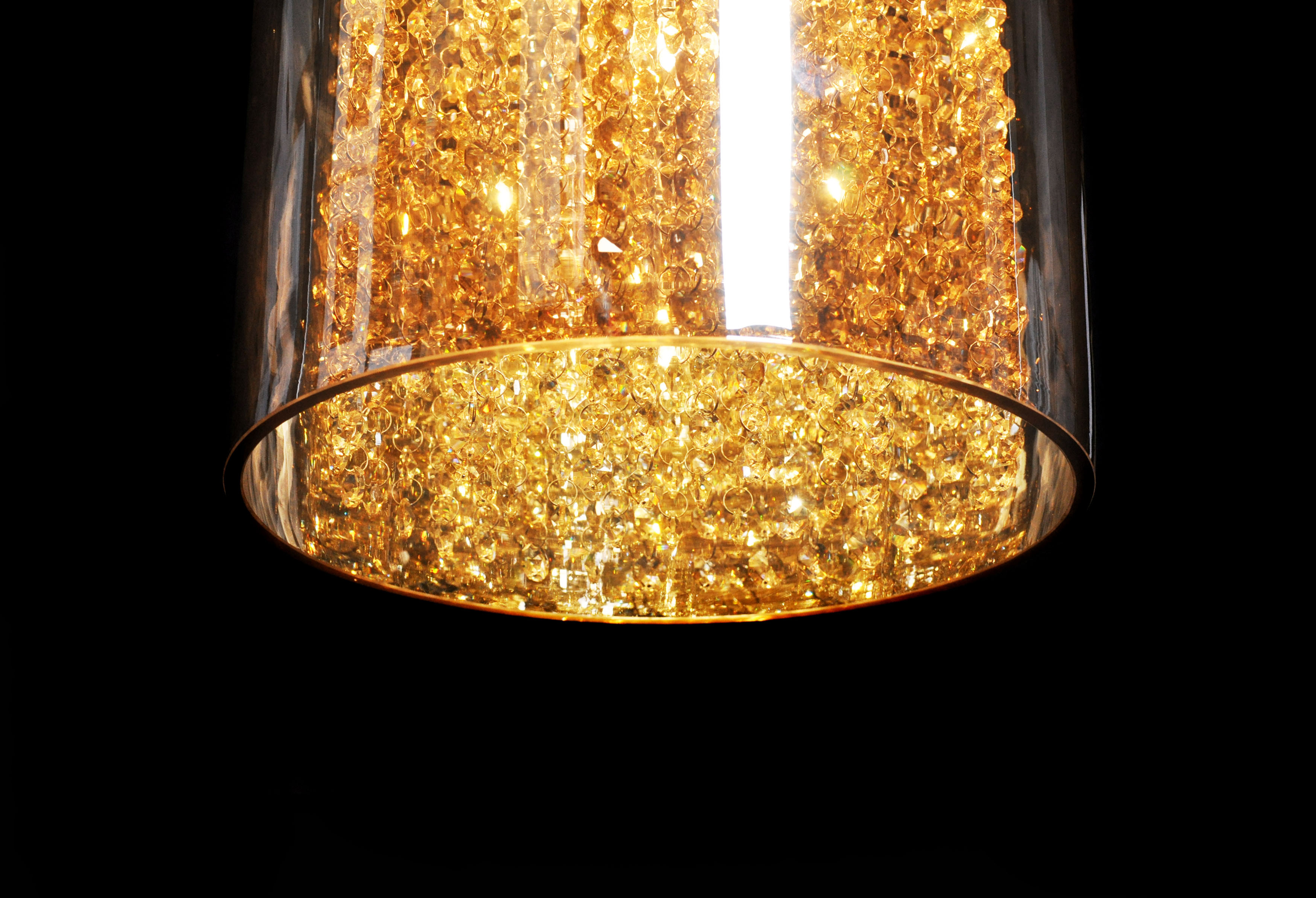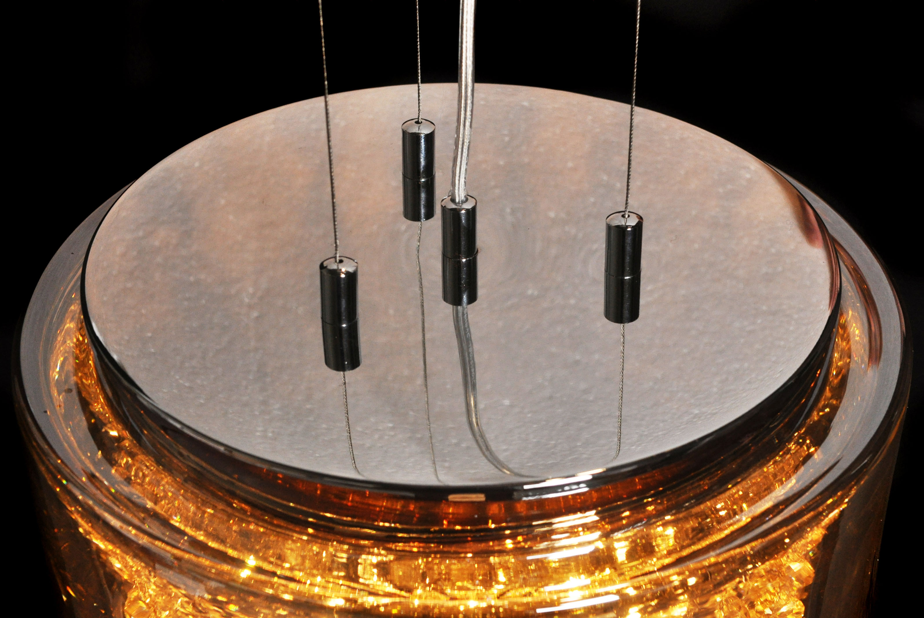 Kolekcja AMOREO pobudza wyobraźnię oraz przyćmiewa swoją postacią pozostałe dekoracje umieszczone we wnętrzu. Wykonana z połączenia metalu i szkła lampa wisząca stwarza możliwość zorganizowania klimatycznej, pełnej ciepła i nastroju przestrzeni, w której umieszczone zostanie oświetlenie o prostej, choć fantazyjnej kompozycji. Szklana tuba, która wypełniona została od wewnątrz bursztynowymi kamykami, doskonale rozświetla wnętrze pięcioma źródłami światła dającymi złotawy blask. Elementem kontrastowym jest chromowana podsufitka podłączona do lampy cienkimi linkami.