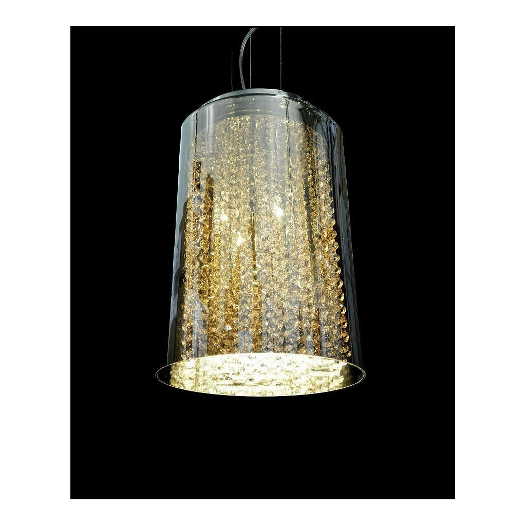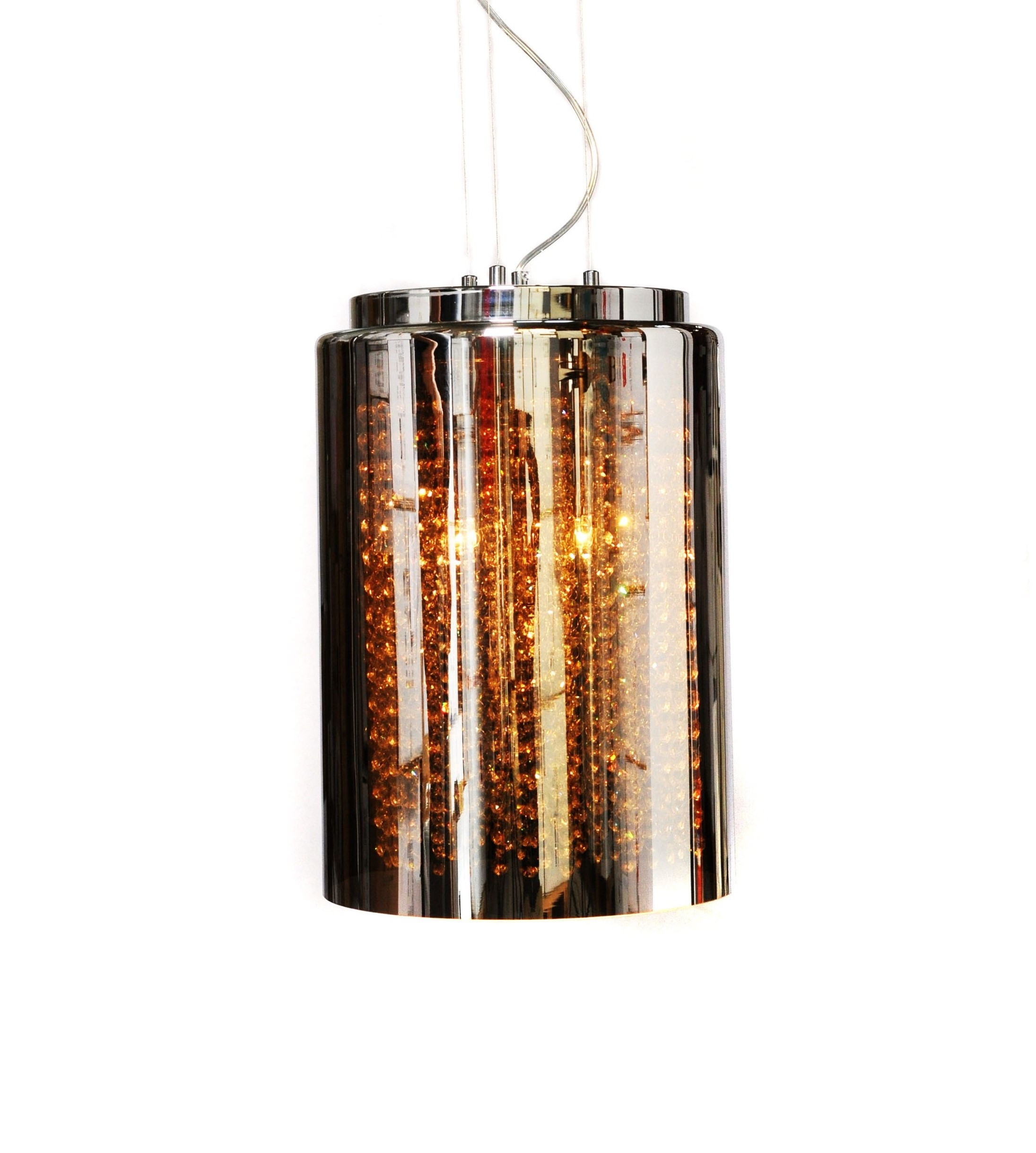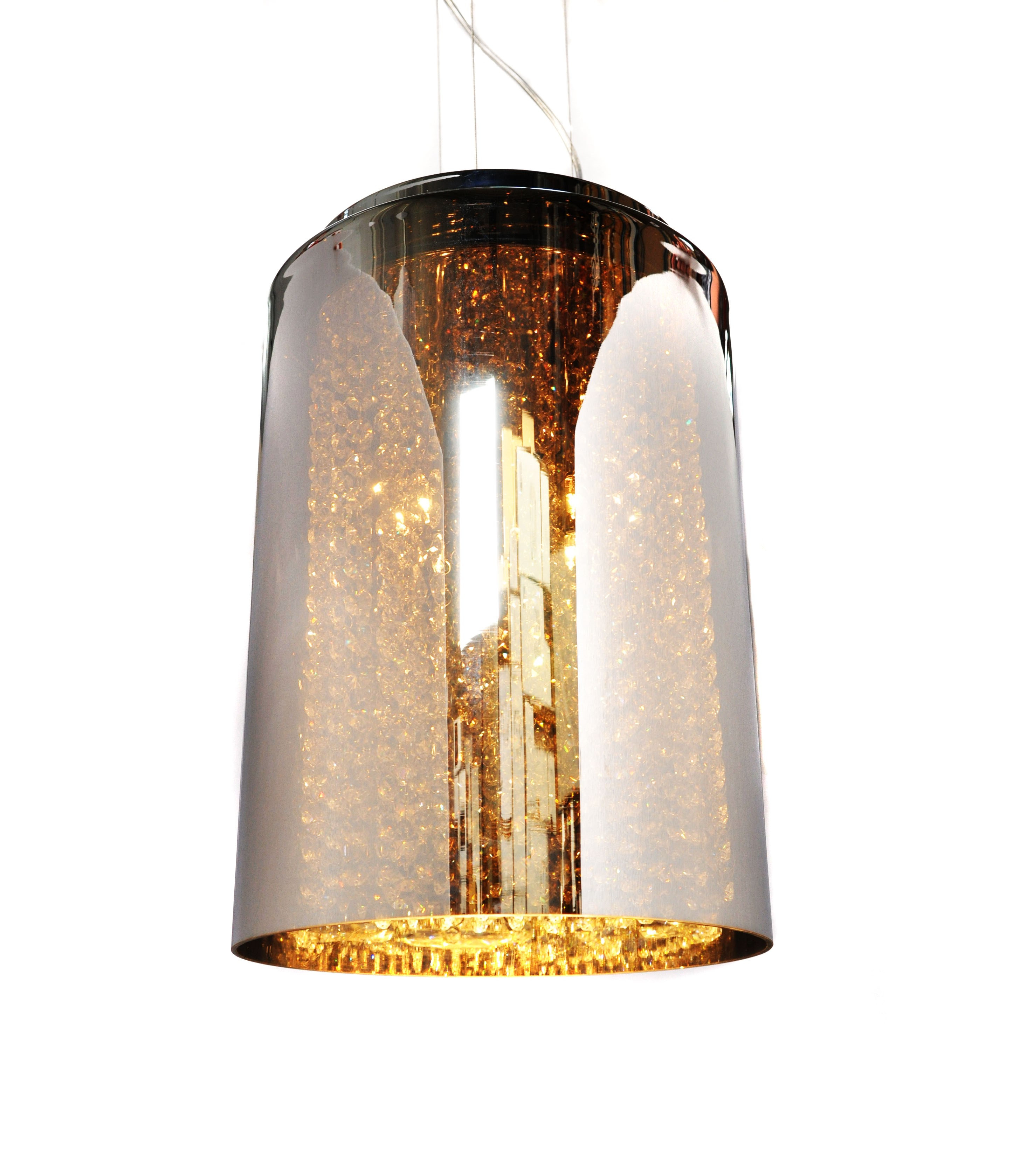 Kolekcja AMOREO pobudza wyobraźnię oraz przyćmiewa swoją postacią pozostałe dekoracje umieszczone we wnętrzu. Wykonana z połączenia metalu i szkła lampa wisząca stwarza możliwość zorganizowania klimatycznej, pełnej ciepła i nastroju przestrzeni, w której umieszczone zostanie oświetlenie o prostej, choć fantazyjnej kompozycji. Szklana tuba, która wypełniona została od wewnątrz bursztynowymi kamykami, doskonale rozświetla wnętrze pięcioma źródłami światła dającymi złotawy blask. Elementem kontrastowym jest chromowana podsufitka podłączona do lampy cienkimi linkami.