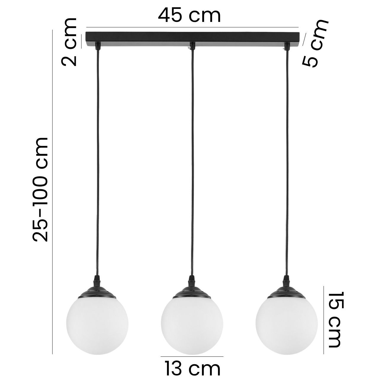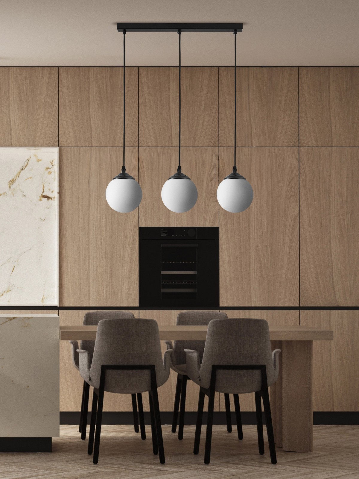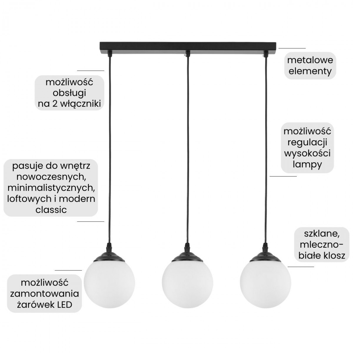Czarna lampa wisząca FINO W3 to model, który łączy dekoracyjny charakter z codzienną funkcjonalnością. Trzy kuliste klosze w mlecznym wykończeniu zostały umieszczone na smukłej konstrukcji, tworząc elegancki i uniwersalny układ świetlny.