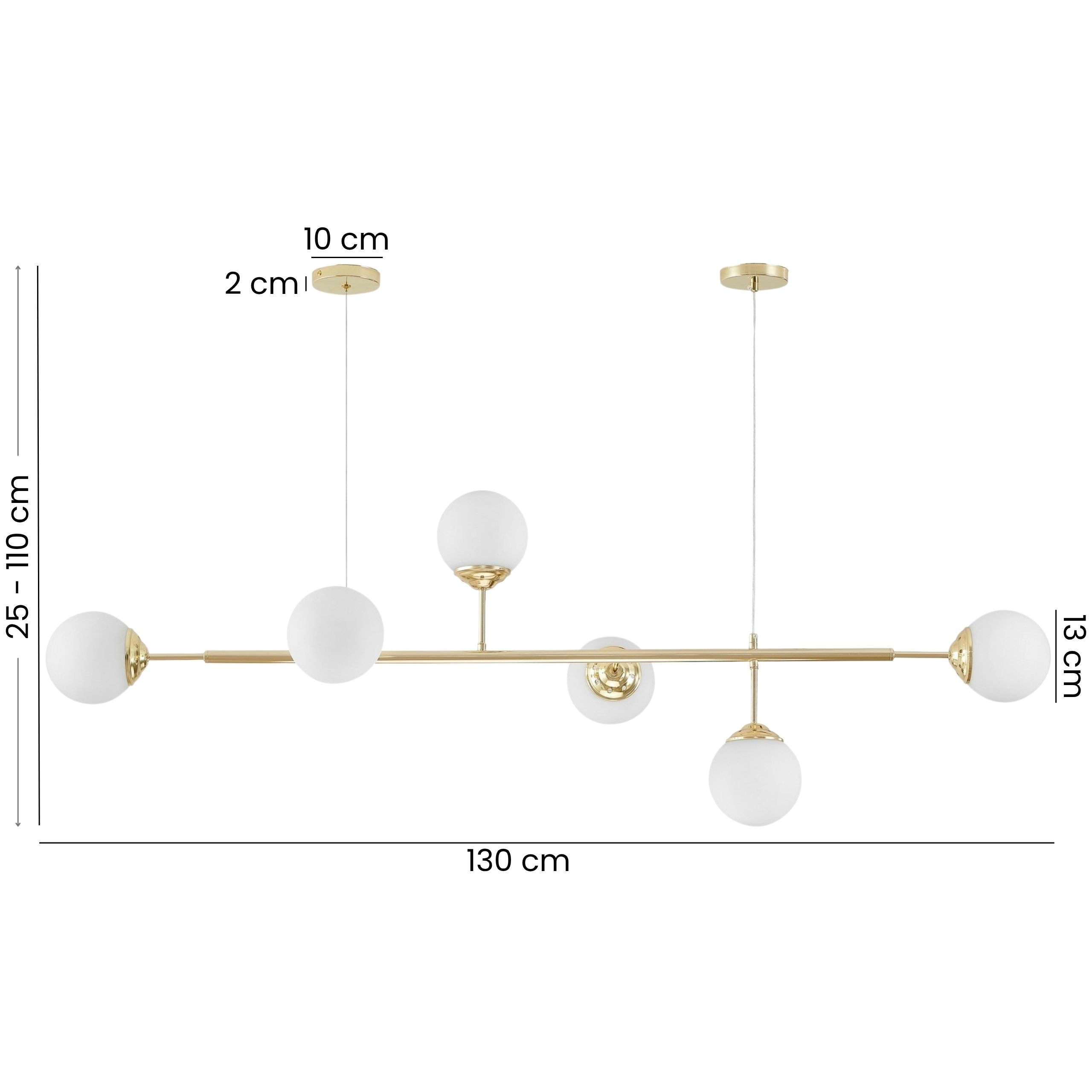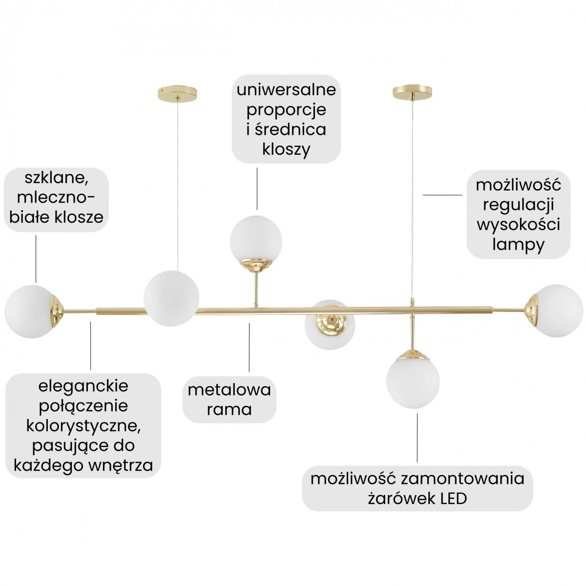 Lampa wisząca FINO W6 w kolorze klasycznego złota łączy nowoczesną formę z subtelną elegancją. Sześć kloszy z mlecznego szkła umieszczono na smukłej, poziomej belce, tworząc kompozycję, która wygląda lekko i proporcjonalnie. Złote wykończenie dodaje całości wytwornego charakteru i sprawia, że lampa staje się dekoracją, która podkreśla styl całego wnętrza.