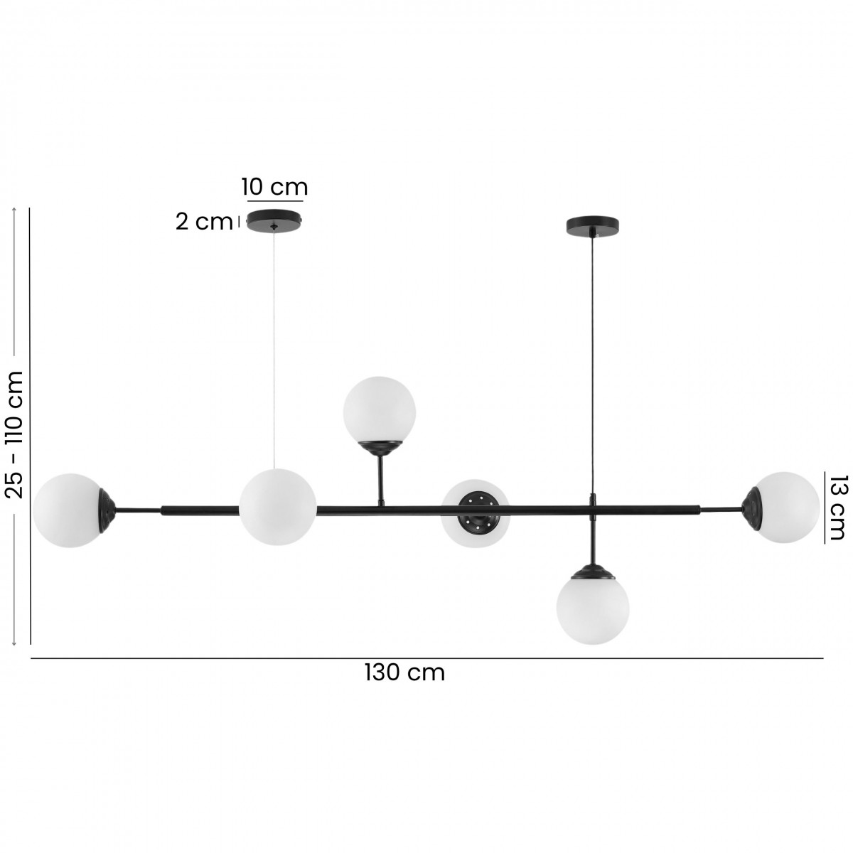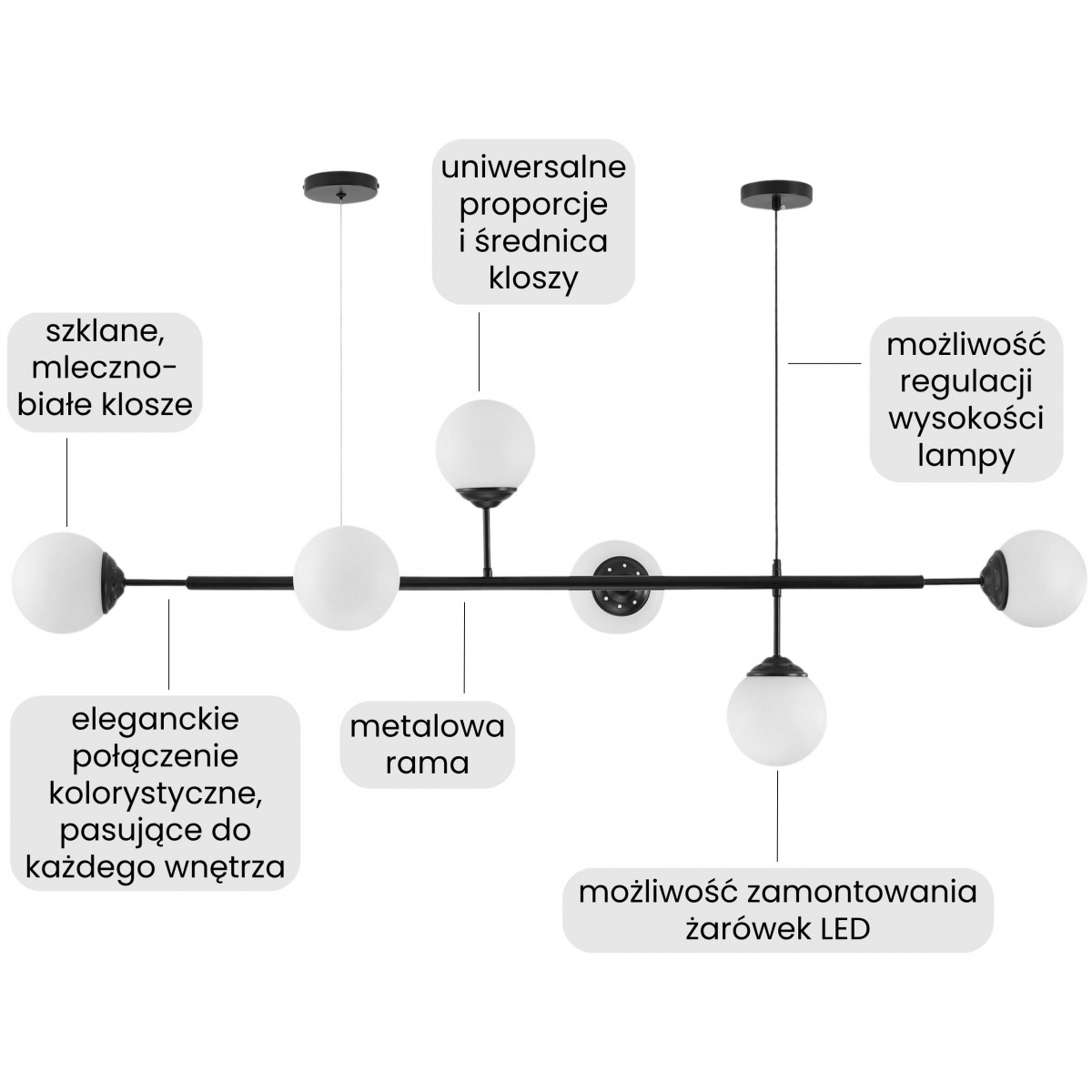 Lampa wisząca FINO 6 w wersji czarnej to elegancki punkt centralny dla każdego wnętrza. Sześć kulistych kloszy z mlecznego szkła zostało osadzonych na smukłych, czarnych ramionach, tworząc układ, który daje mocny efekt dekoracyjny i funkcjonalne światło jednocześnie.
