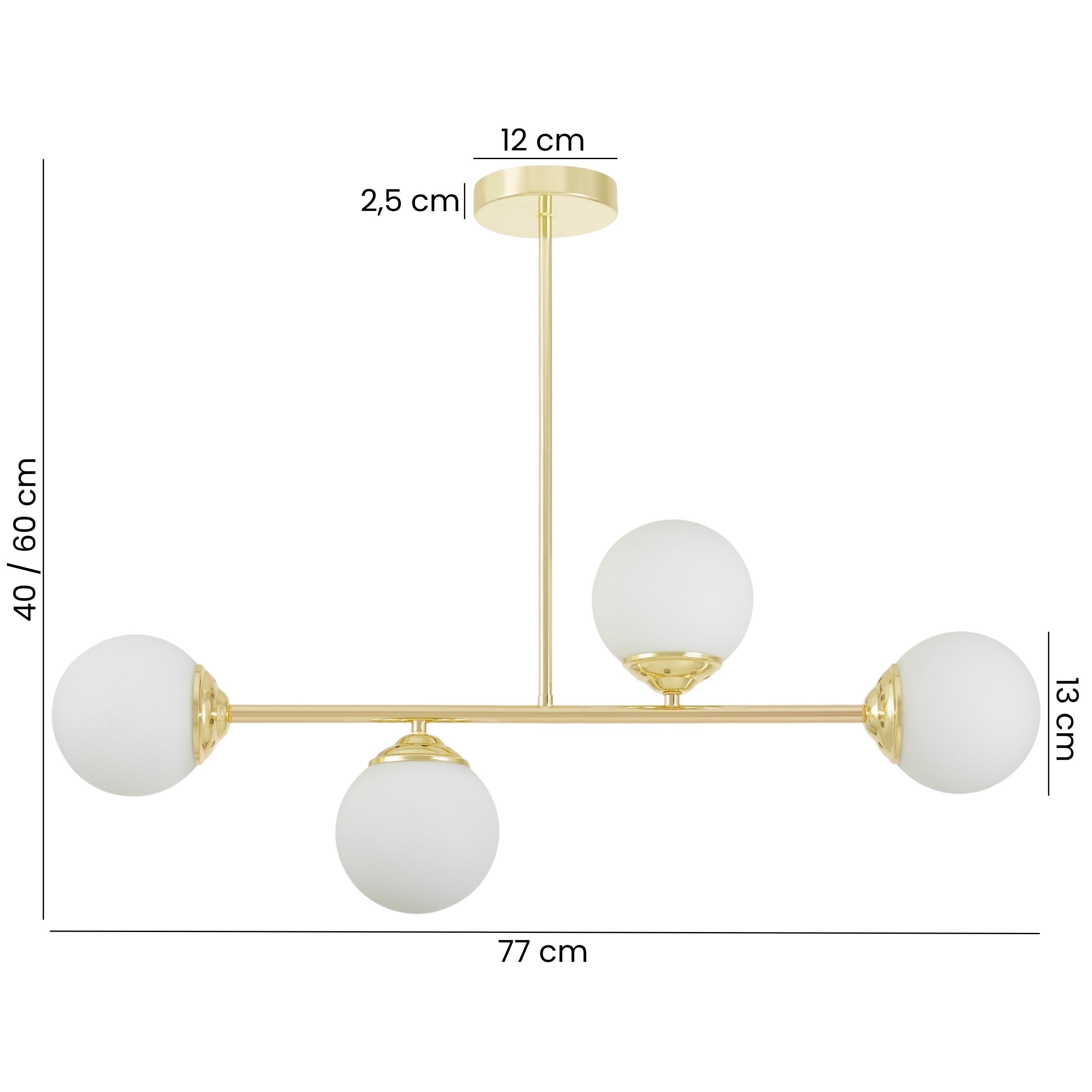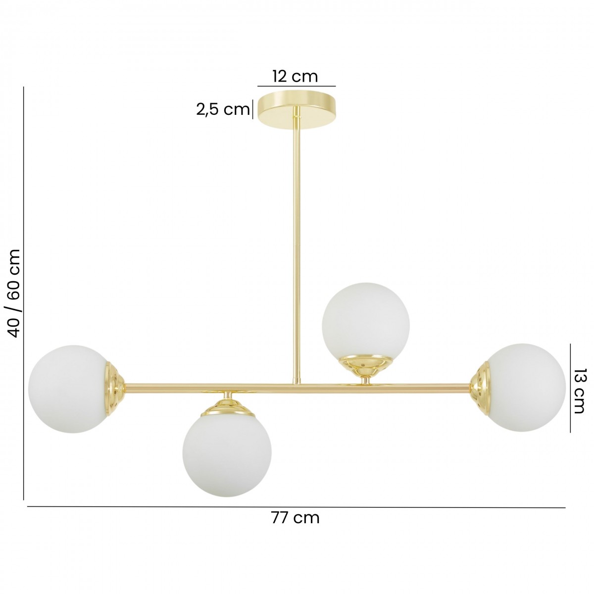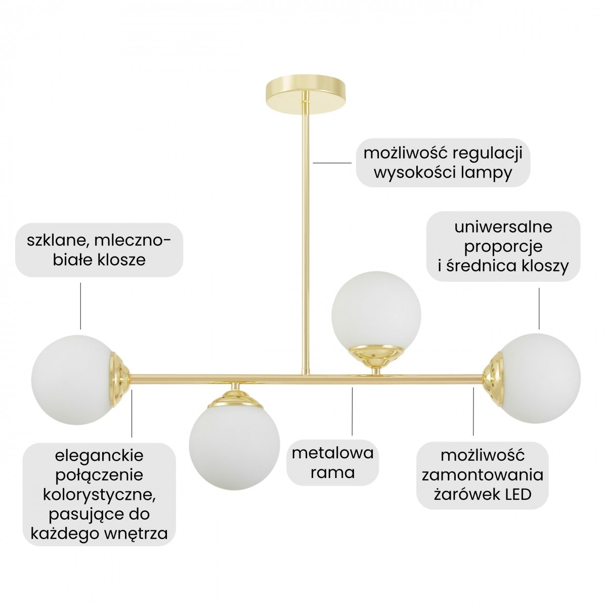 FINO W4 w kolorze klasycznego złota to nowoczesna lampa wisząca, która doskonale odnajduje się w różnych przestrzeniach domowych. Jej forma oparta na czterech kloszach z mlecznego szkła daje miękkie, przyjemne dla oczu światło, które sprzyja codziennym czynnościom i wieczornemu odpoczynkowi.