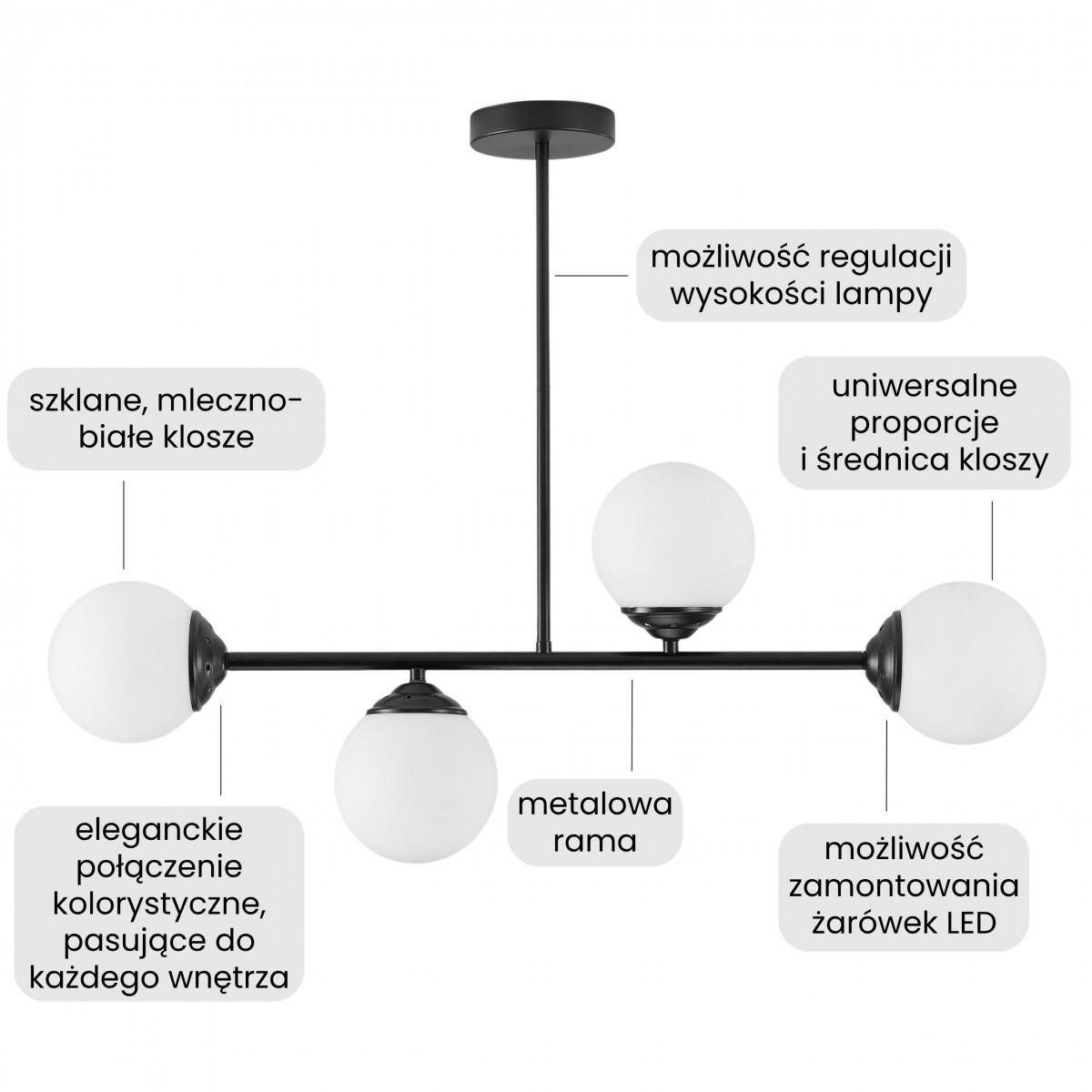 Nowoczesna lampa wisząca FINO W4 w czarnym wykończeniu to rozwiązanie dla osób, które cenią nowoczesny styl i praktyczność. Jej konstrukcja opiera się na prostym stelażu z czterema kulistymi kloszami z mlecznego szkła, które dają równomierne i łagodne światło, umilające czas spędzony w domu. Układ sprawia, że wnętrze staje się przyjazne i funkcjonalne – zarówno w codziennym użytkowaniu, jak i podczas wieczornego relaksu.