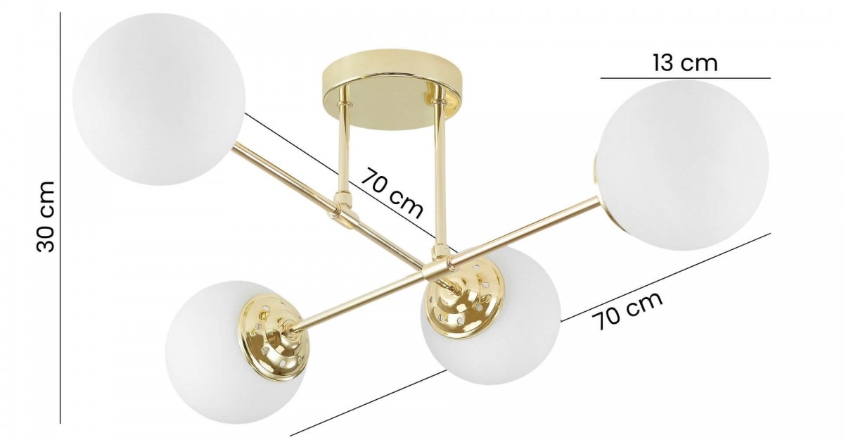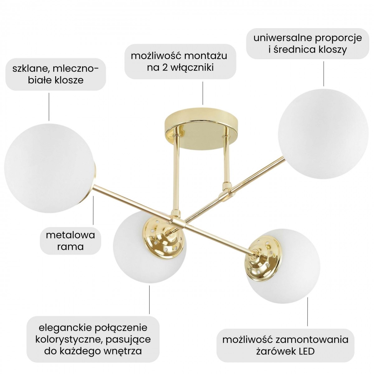 FINO W4 to modna, klasyczna złota lampa sufitowa, która zmienia charakter wnętrza, niezależnie od jego stylu. Piękna, złota oprawa wygląda jak subtelny detal, a cztery kuliste klosze z mlecznego szkła zapewniają spokojne i równomierne oświetlenie. Całe wnętrze staje się jasne, a atmosfera sprzyja zarówno codziennym spotkaniom, jak i wieczornemu odpoczynkowi w ciszy. Lampa pozwala na montaż z podziałem światła na sekcje, sterowane dwoma włącznikami.
