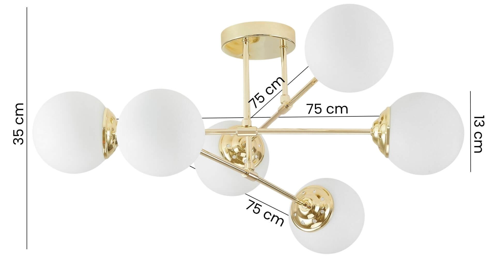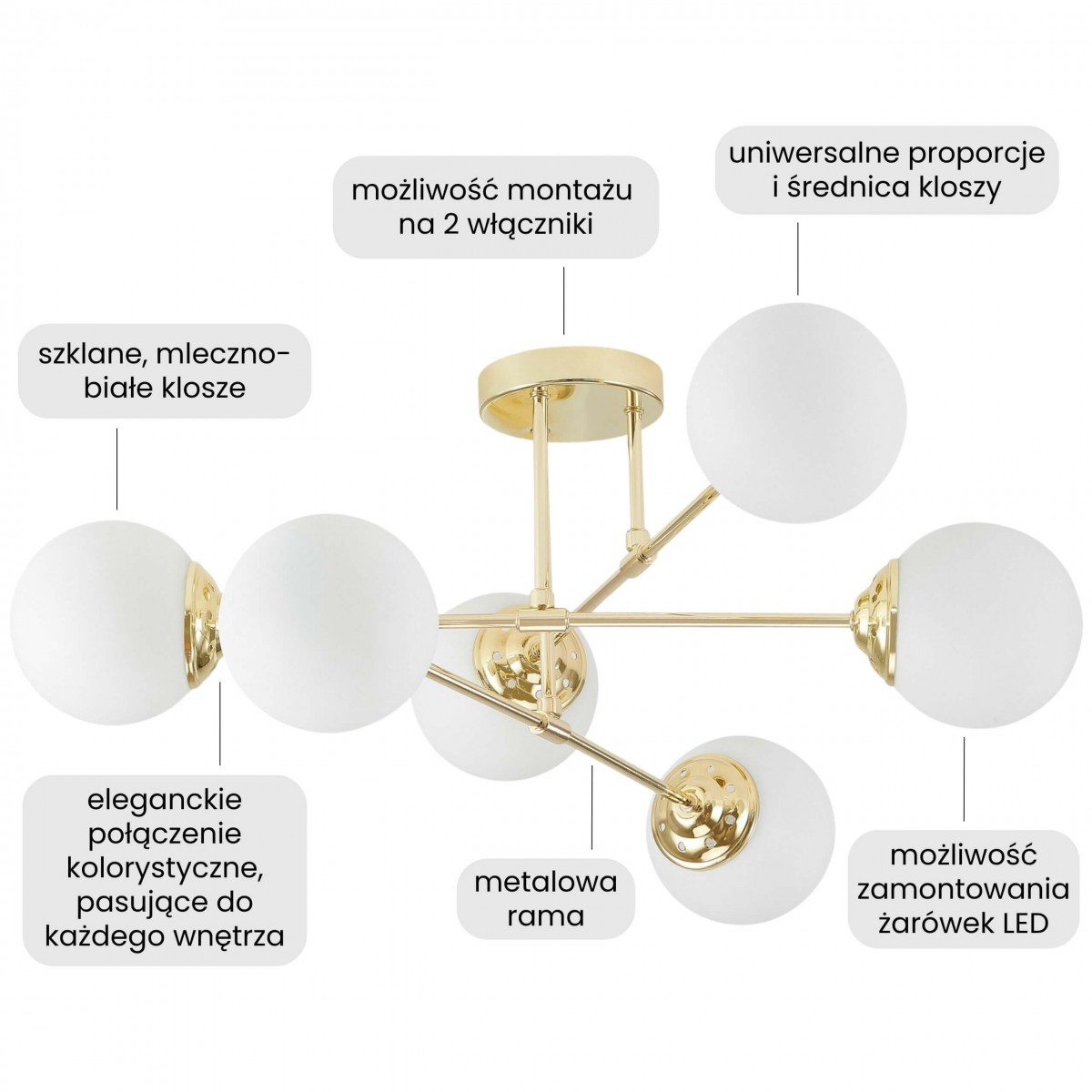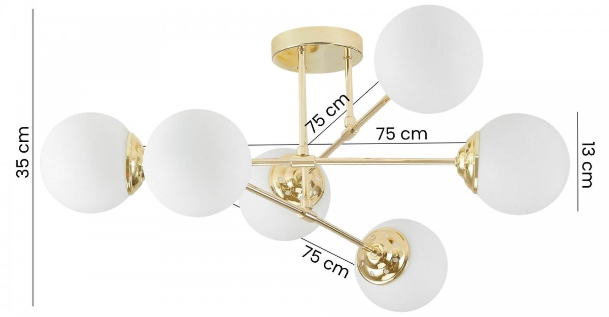 Lampa sufitowa FINO w wykończeniu klasycznego złota to propozycja dla osób, które szukają oświetlenia łączącego elegancję z codzienną wygodą. Sześć białych kul zostało rozmieszczonych na złotej oprawie, dzięki czemu zapewnia światło rozchodzące się równomiernie i naturalnie wypełniające pomieszczenie.