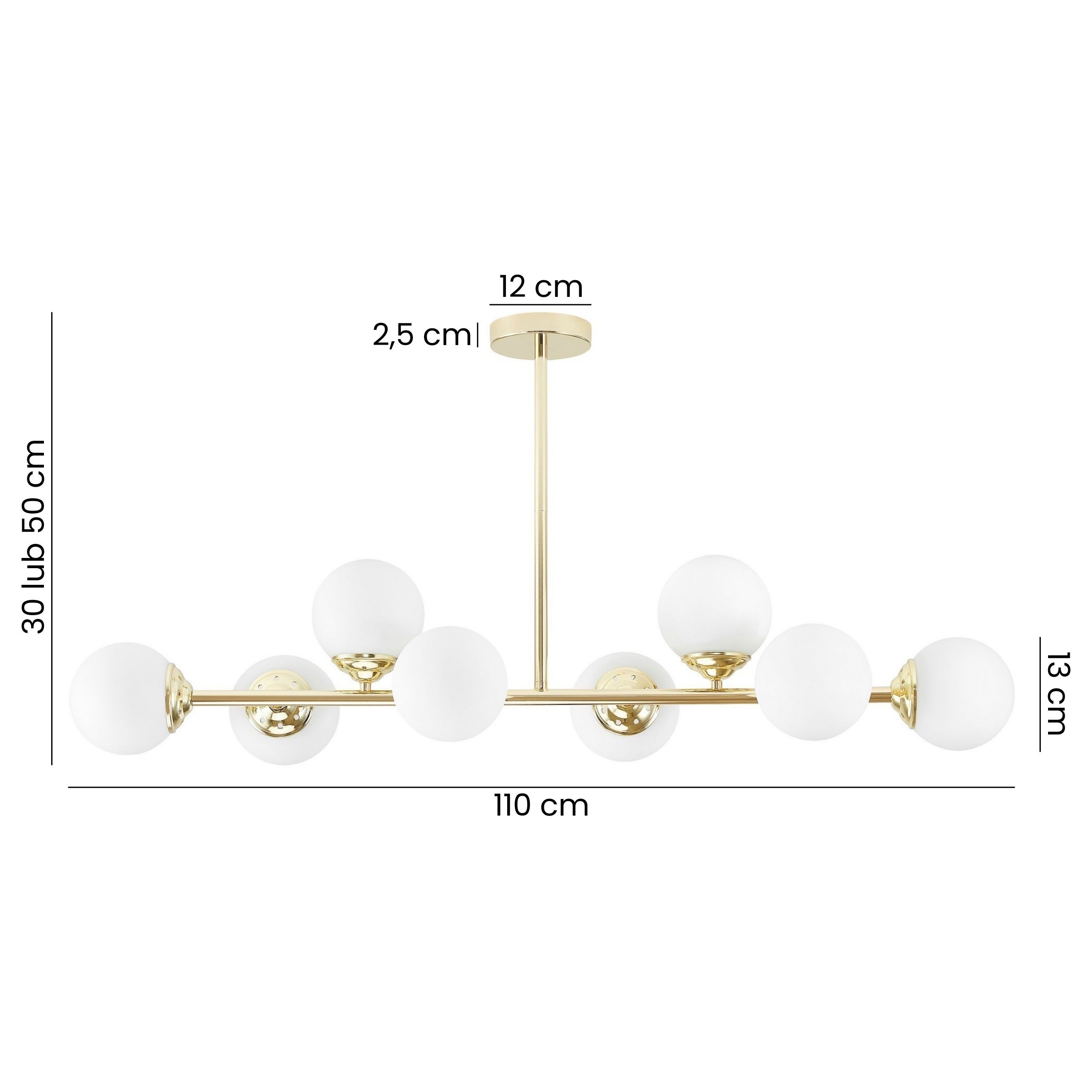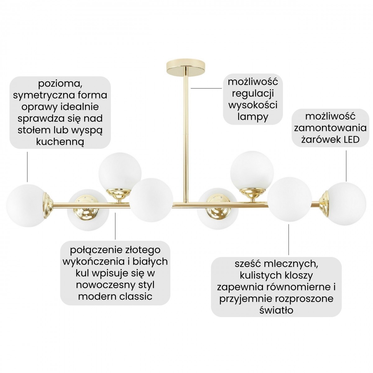 FINO W8 w złotej wersji kolorystycznej to lampa wisząca z ośmioma białymi kulami z mlecznego szkła. Elegancki detal w postaci złotej oprawy nadaje jej uniwersalności i pozwala łatwo dopasować do różnych aranżacji.