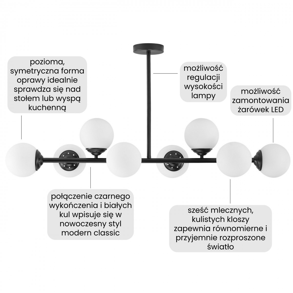 Czarna oprawa z łatwością dopasowuje się do nowoczesnych aranżacji w połączeniu z metalem, ciemnym drewnem lub betonem, podkreślając industrialny charakter wnętrza i dodając mu spójności. W jaśniejszych, skandynawskich aranżacjach ta nowoczesna lampa wisząca kontrastuje z bielą i jasnym drewnem, podkreślając prostotę i naturalność wnętrza. Jest to także idealna lampa wisząca do wnętrz nowoczesnych, gdzie w duecie z marmurem lub szkłem wnosi elegancję i modny akcent, który nie dominuje, a uzupełnia całość. W zestawieniu ze złotymi dodatkami czy połyskującymi tkaninami lampa wisząca kule odnajduje się także w eleganckim stylu glamour.