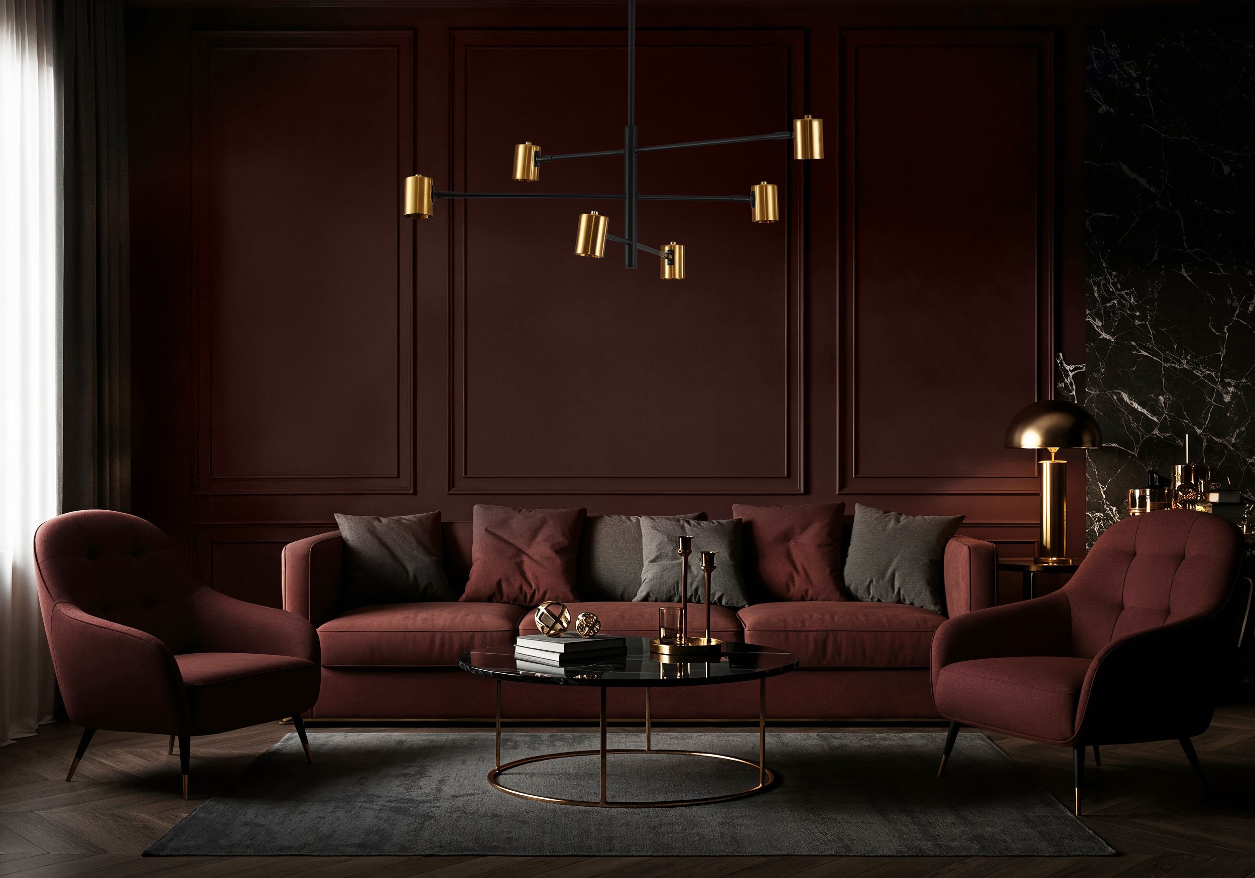 Dzięki czarno-złotemu wykończeniu lampa staje się elementem, który nie tylko oświetla, ale stylowo dopełnia wystrój wnętrza. W salonie wprowadza kontrast, który zaakcentuje inne elementy dekoracyjne i podkreśli sofę; jako lampa wisząca do kuchni lub jadalni pomaga wydobyć pożądaną strefę posiłków; a w domowym biurze umożliwia dostosowanie światła do pracy. Złoty detal ramion współgra z różnorodnymi materiałami — metalem, szkłem, drewnem, tkaninami — a także z wieloma odcieniami, dając szerokie możliwości aranżacyjne.