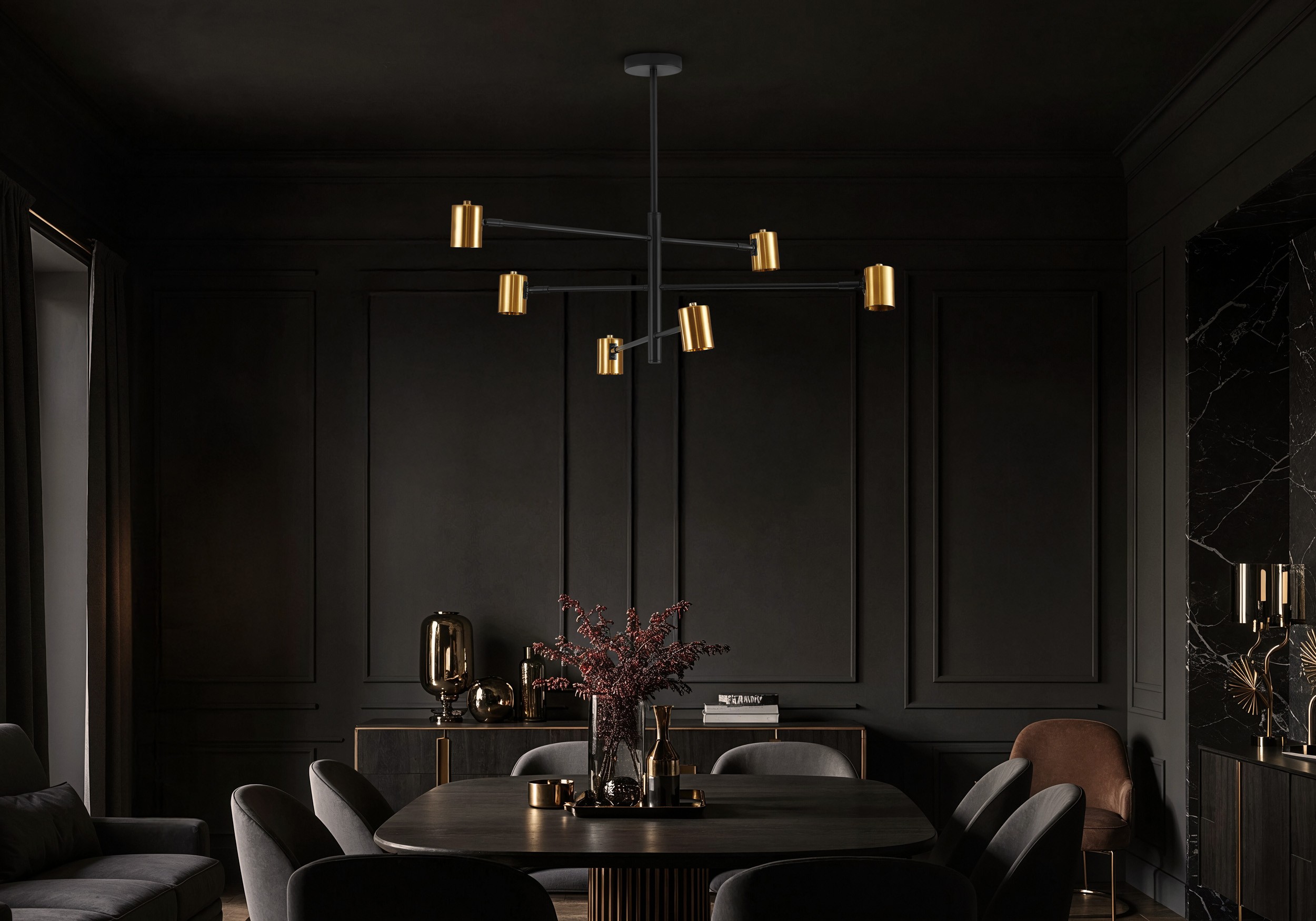 Czarna lampa wisząca ze złotymi spotami DORA W6 – wyrazisty kontrast do nowoczesnych wnętrz