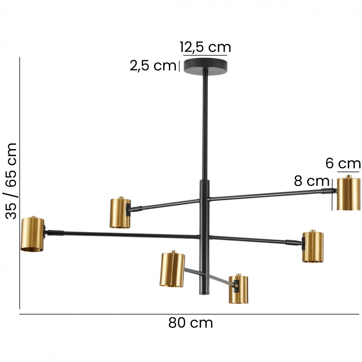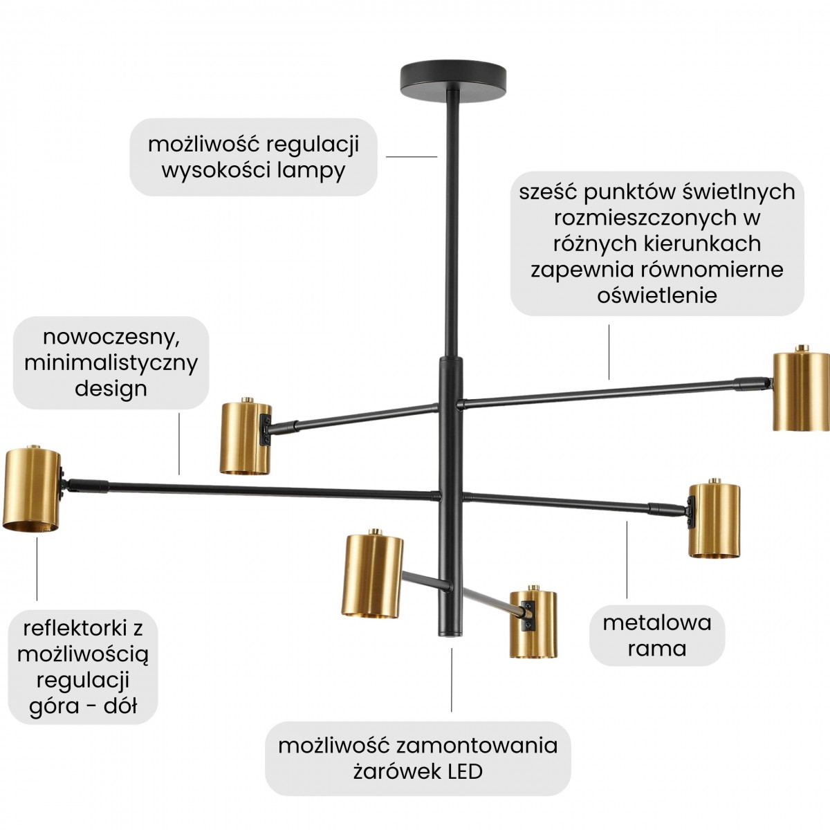 Lampa wisząca DORA W6 to wyrazisty element dekoracyjny, który łączy elegancję z nowoczesnym duchem. Sześć reflektorków osadzono na ramionach o dwóch odcieniach - czerni i złocie - nadając konstrukcji dynamicznego charakteru i luksusowego wyrazu.