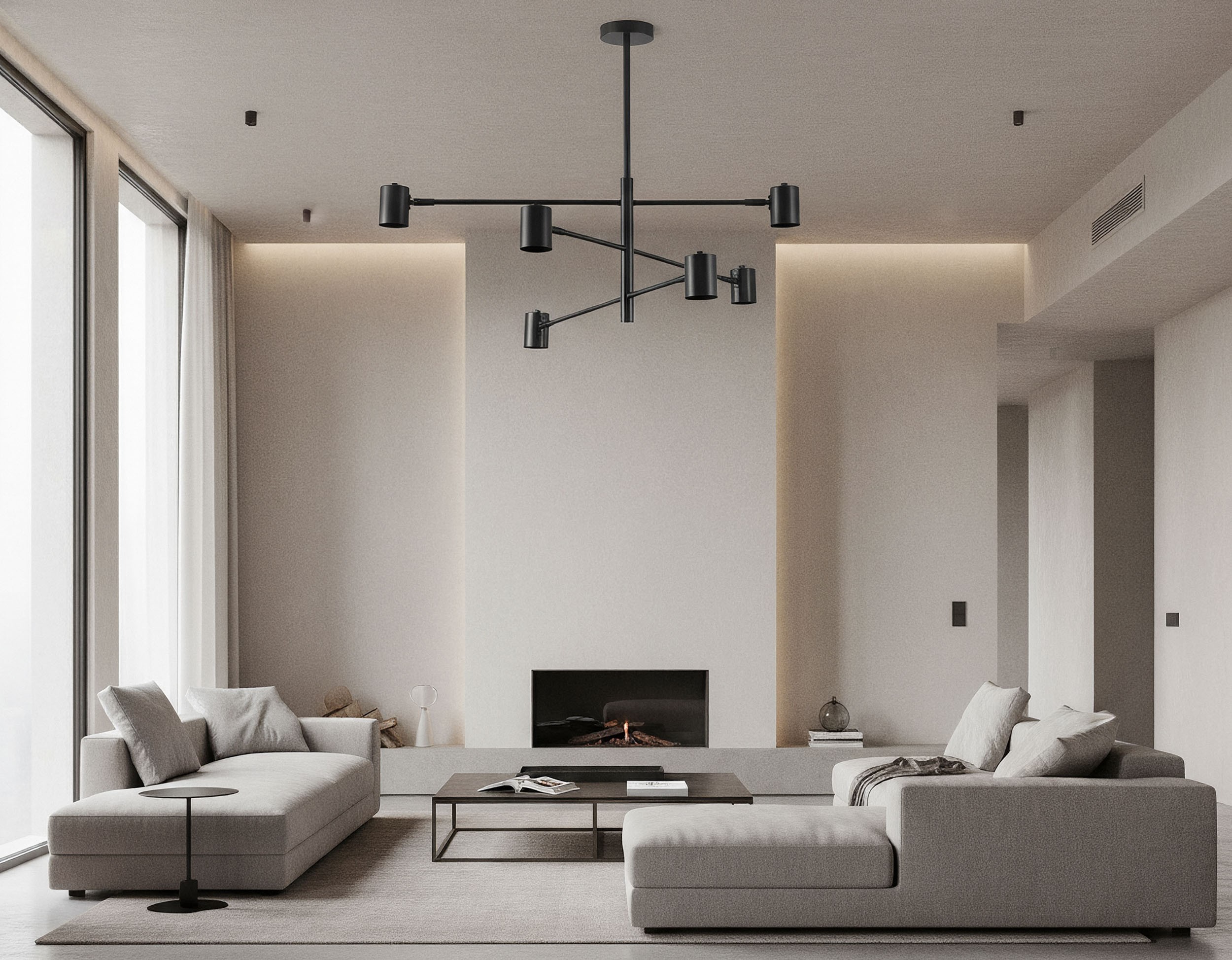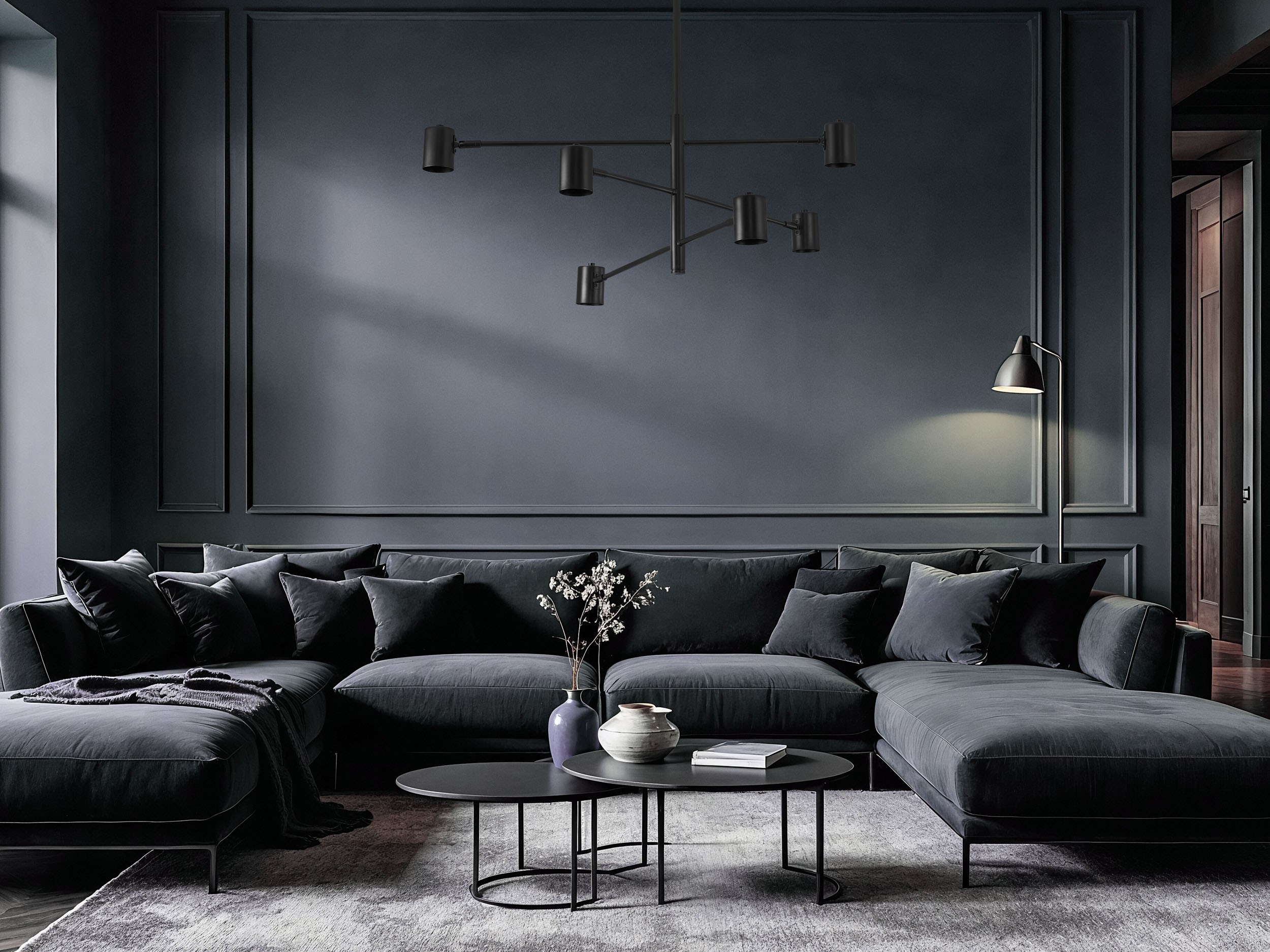 DORA W6 to czarna lampa sufitowa z sześcioma reflektorami. Funkcyjna, graficzna forma podkreśla nowoczesny styl i umożliwia precyzyjne prowadzenie światła w salonie, kuchni czy domowym biurze.
