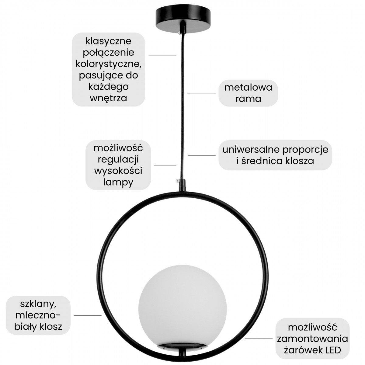 Czarna lampa wisząca VERO 1A zachwyca minimalistyczną, ale unikatową formą i lekką konstrukcją. Klosz z mlecznego szkła został osadzony w cienkiej, okrągłej ramie w formie pierścienia, która subtelnie podkreśla jego kształt. To połączenie funkcjonalności i stylu, które wprowadza do wnętrza przyjemne, równomierne światło.