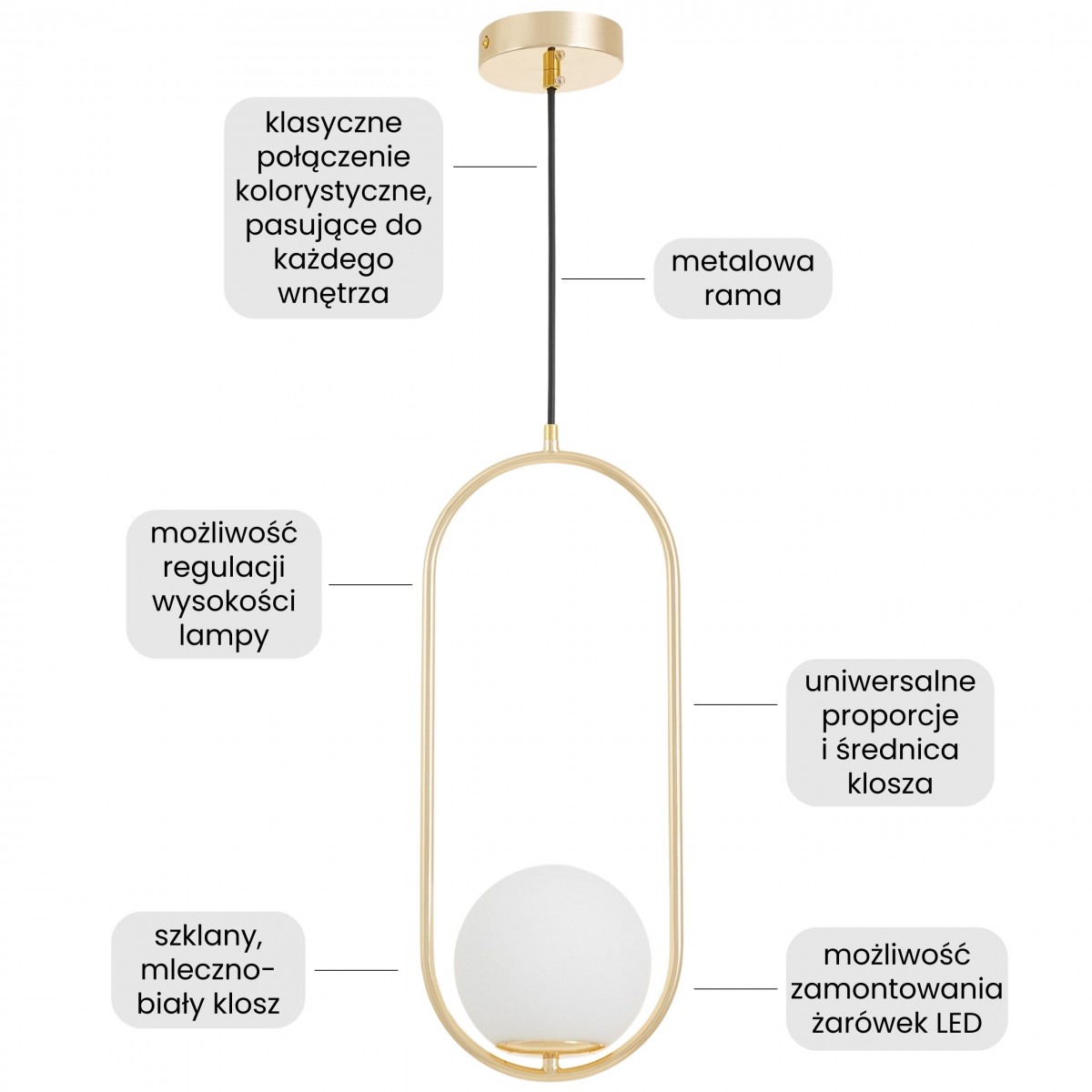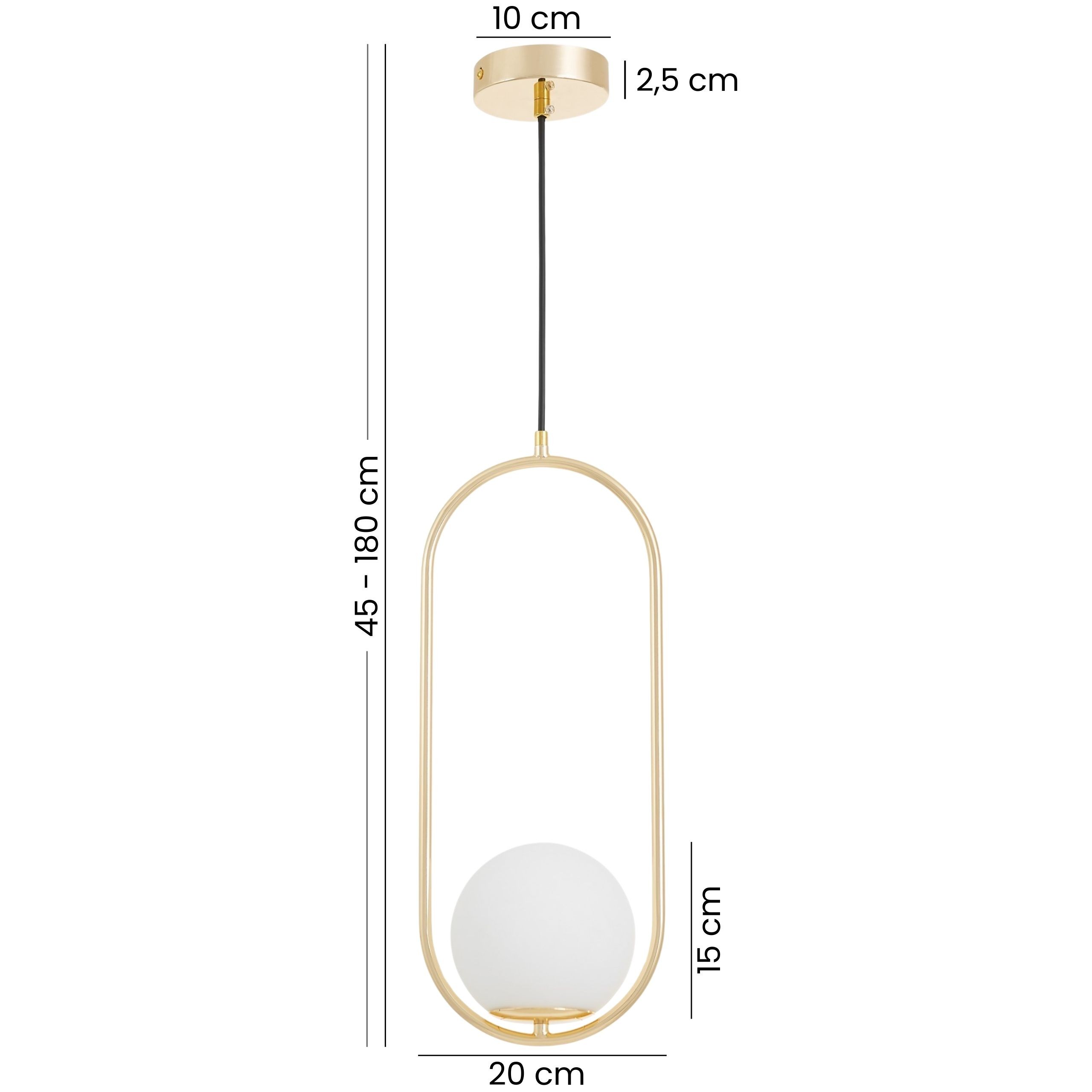 Rama o wydłużonym kształcie otacza kulę z mlecznego szkła, tworząc efekt przyjazny dla oka i dopełniający wnętrze. Złota lampa wisząca VERO 1B podkreśla charakter aranżacji, nie konkurując z głównymi elementami. Doskonale prezentuje się w pojedynkę – np. nad stołem lub stolikiem w roli lampy do kuchni i salonu – ale również w parze, gdzie tworzy spójną kompozycję świetlną.