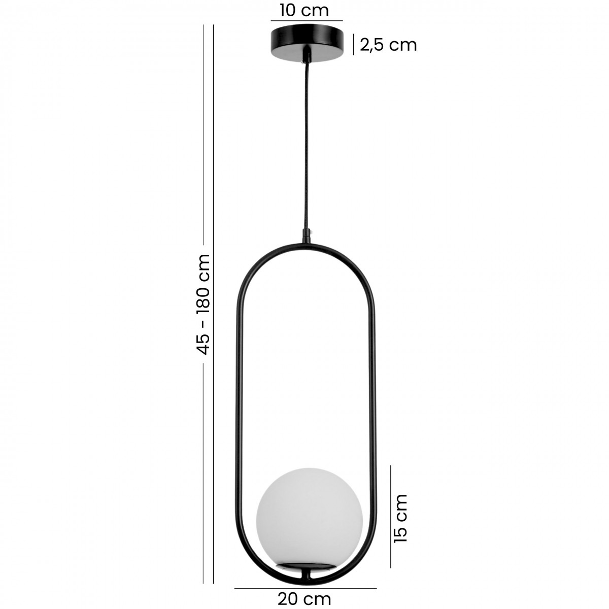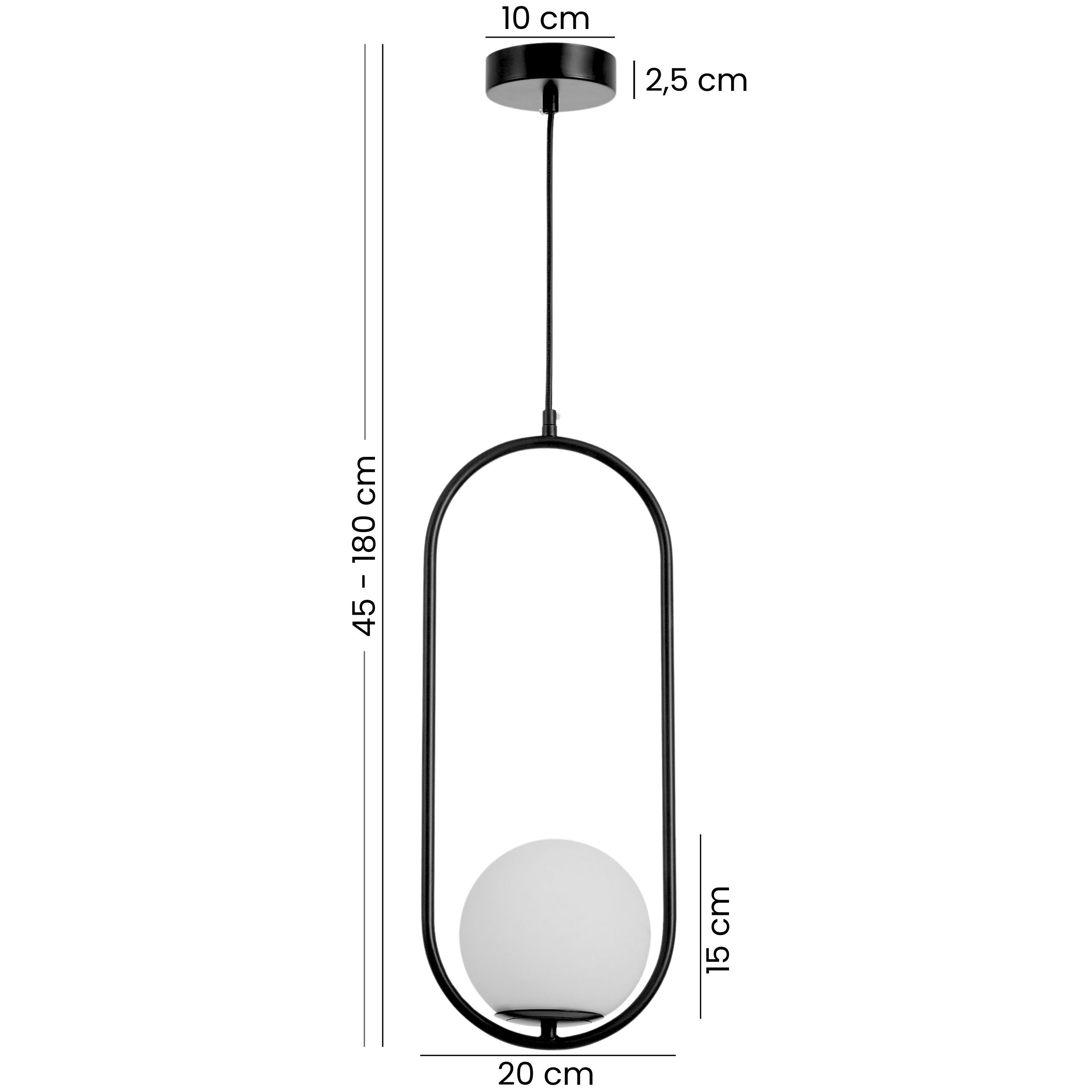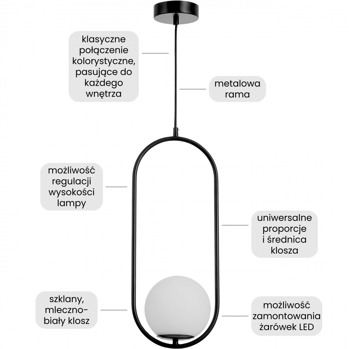 Czarna lampa wisząca z linii VERO to propozycja dla osób, które cenią minimalizm z nowoczesnym charakterem w jednym. Mleczna kula została umieszczona w smukłej, owalnej ramie, tworząc subtelny kontrast i formę przyciągającą wzrok. Lampa dobrze komponuje się z różnymi stylami i zapewnia przyjemne oświetlenie do codziennych zajęć – od porannej kawy po wieczorne spotkania w gronie najbliższych.