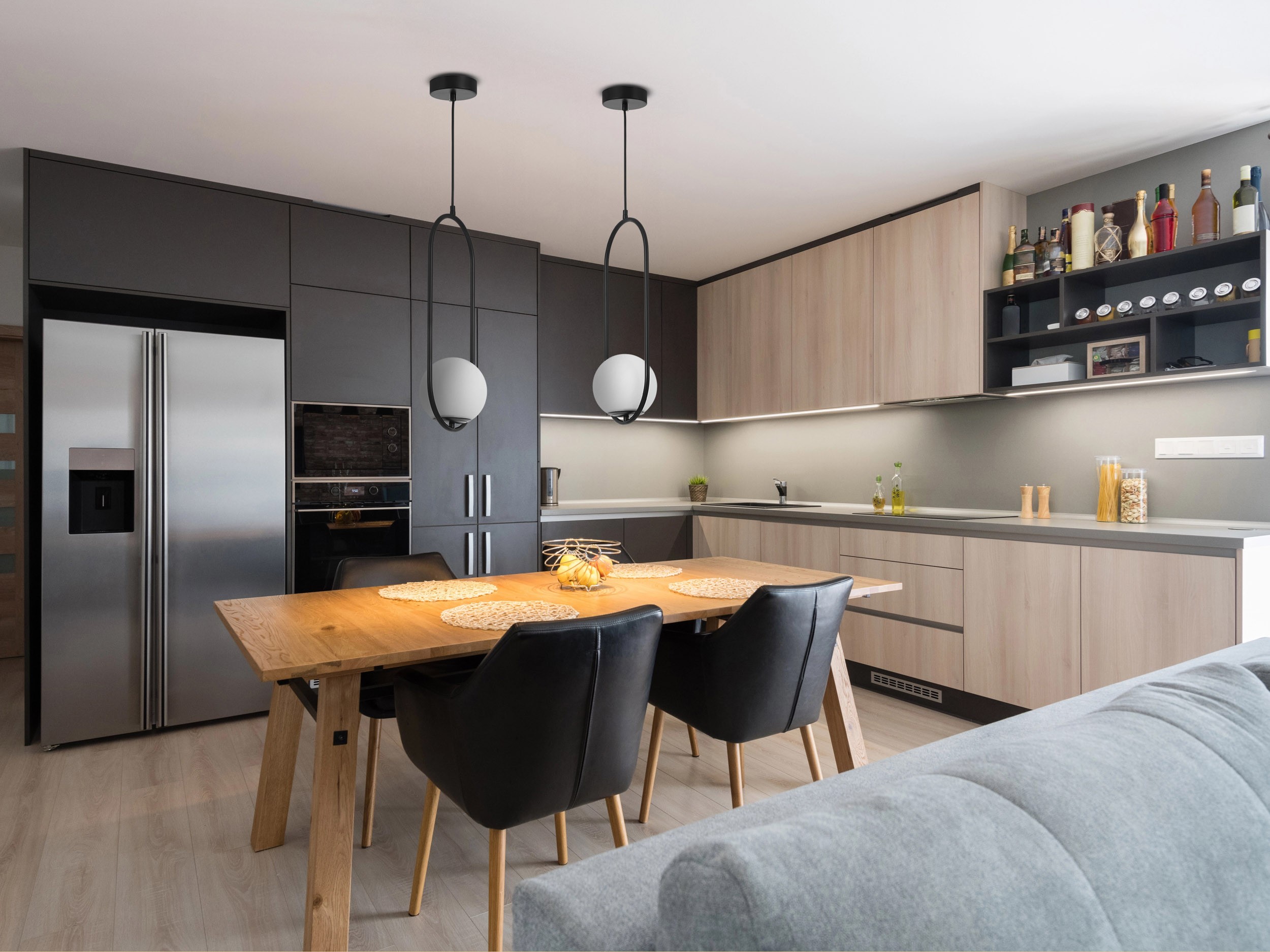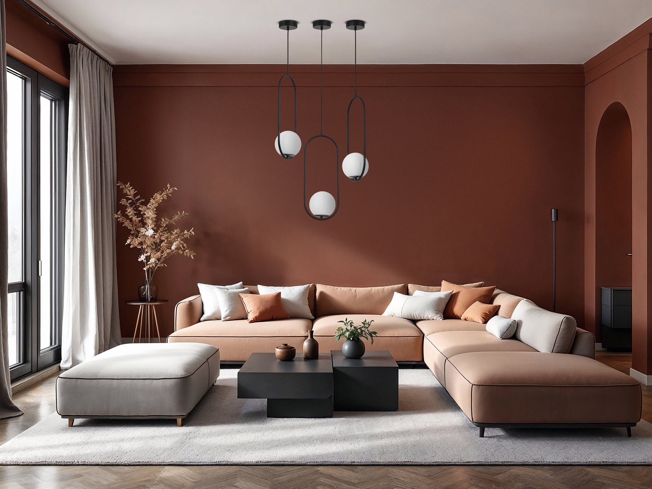 Czerń w tym wydaniu nie przytłacza – delikatnie akcentuje kształty i pozwala zachować elegancki, nowoczesny charakter. Lampa wisząca doskonale nadaje się jako główne oświetlenie w salonie czy sypialni. Dopełnia również miejsce spotkań z bliskimi wisząc nad stołem jako lampa wisząca do kuchni. Model dobrze współgra z jasnymi i ciemniejszymi przestrzeniami, pasując zarówno do minimalistycznych, jak i bardziej klasycznych wnętrz.
