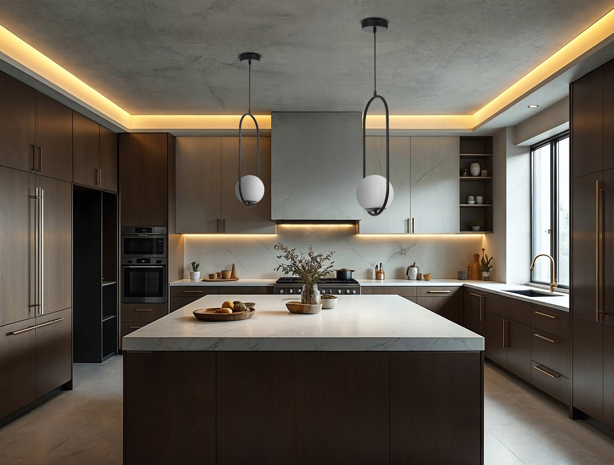 Lampa sufitowa z kolekcji VERO to wydłużona owalna rama w czarnym kolorze, która otacza mleczny klosz, tworząc efektowną, nowatorską kompozycję. Ta nowoczesna lampa wisząca rozjaśnia wnętrze w sposób równomierny i łagodny, dzięki czemu doskonale sprawdza się zarówno podczas pracy, jak i odpoczynku.