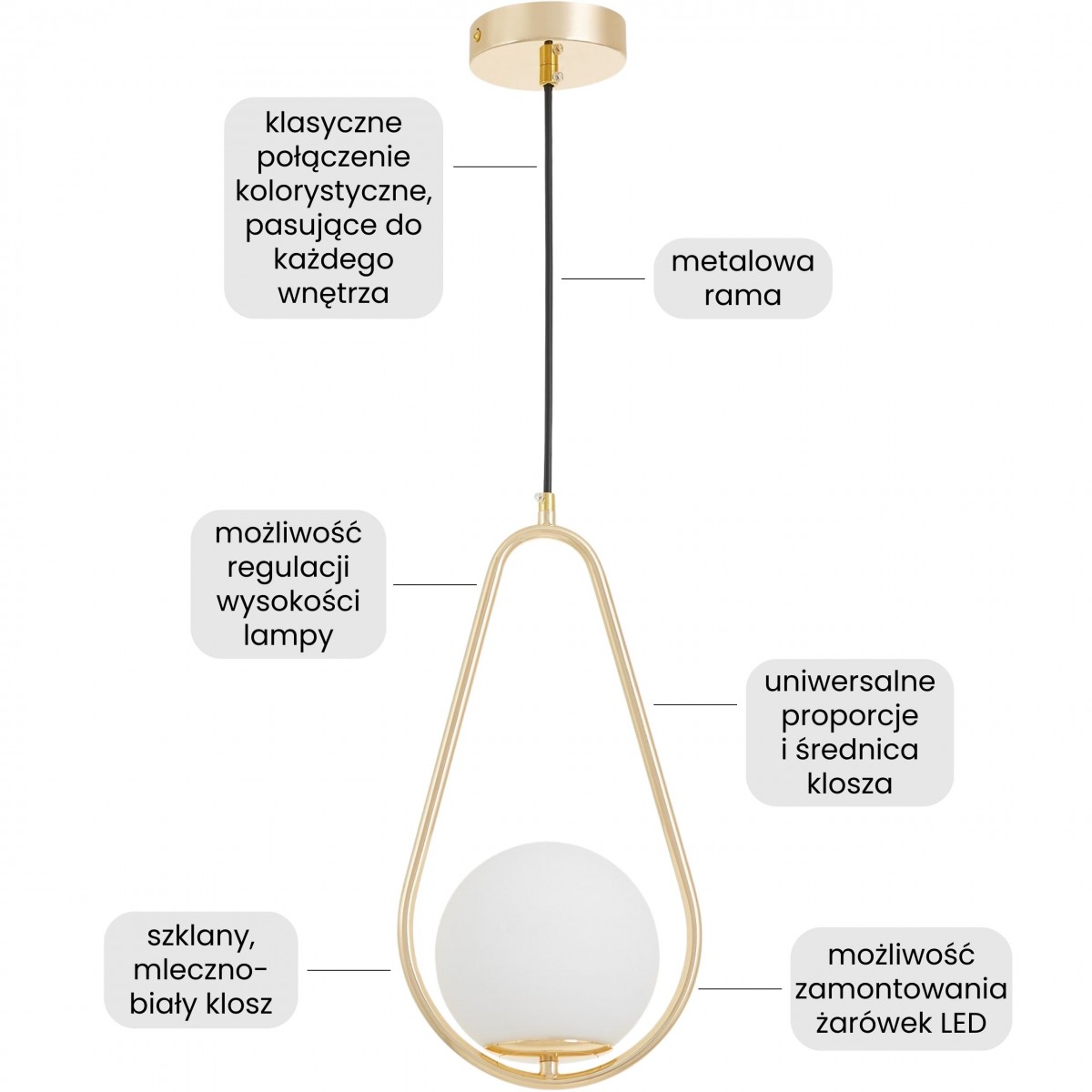 VERO 1C to złota lampa wisząca, przypominająca kroplę, z białym kloszem w kształcie kuli o mlecznym wykończeniu, która prezentuje się elegancko i zarazem nowocześnie. Doskonale sprawdza się w wielu pomieszczeniach, zapewniając komfort podczas życia codziennego i wypoczynku. Zawieszona nad stołem staje się przyjemnym centrum codziennych rozmów, a nad wyspą podkreśla funkcjonalną część kuchni. W roli lampy wiszącej do salonu buduje atmosferę sprzyjającą swobodnym spotkaniom i odpoczynkowi, z kolei w sypialni tworzy światło, które towarzyszy wyciszającym momentom po całym dniu.
