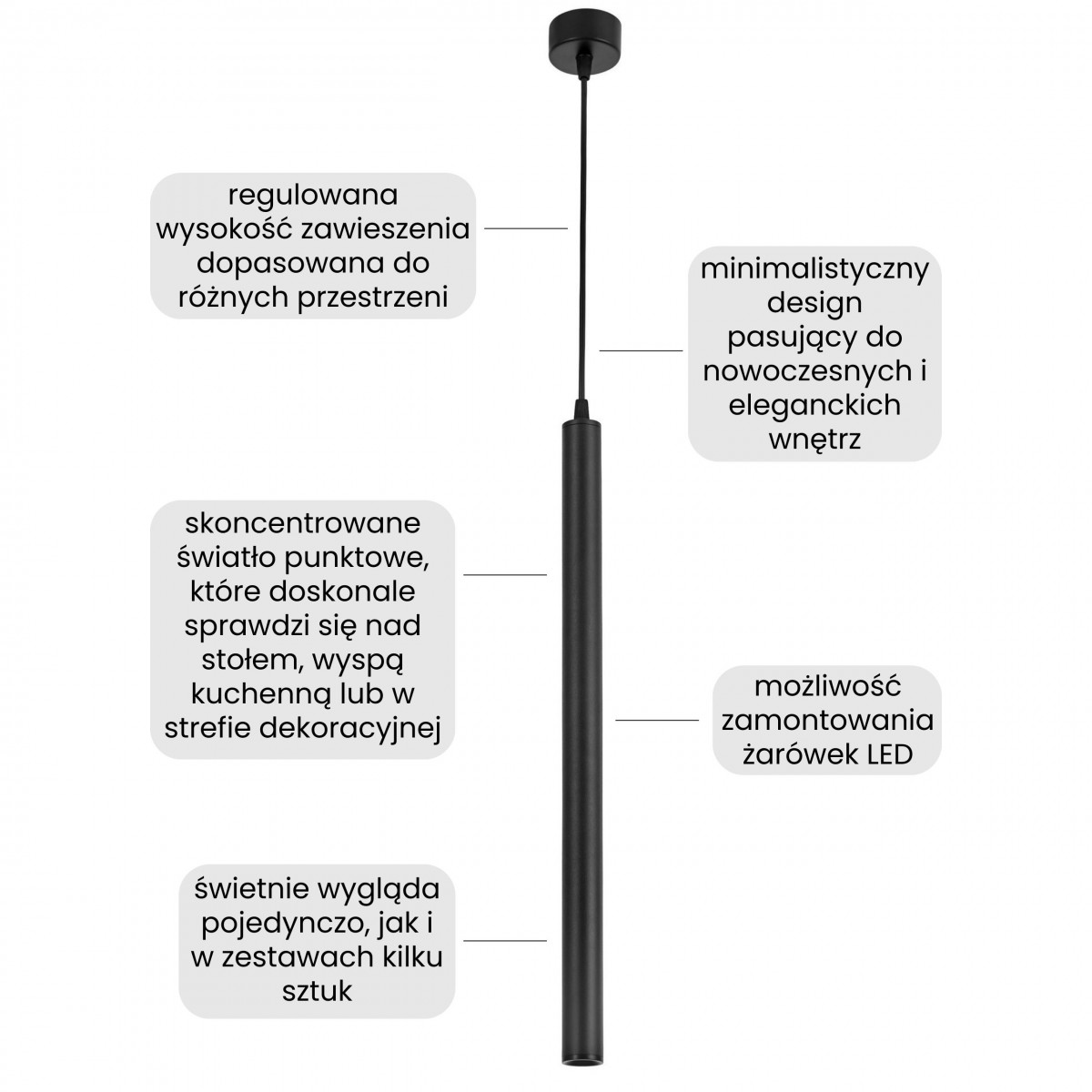 Czerń oprawy nadaje całości nowoczesnego charakteru. Ta nowoczesna lampa wisząca to wybór, który pasuje zarówno do jasnych aranżacji, gdzie wprowadza kontrast, jak i do ciemniejszych, w których tworzy spójną, minimalistyczną całość. Dzięki temu lampa TUBA SLIM W1 staje się uniwersalnym elementem wystroju, który łączy w sobie prostotę i funkcjonalność.