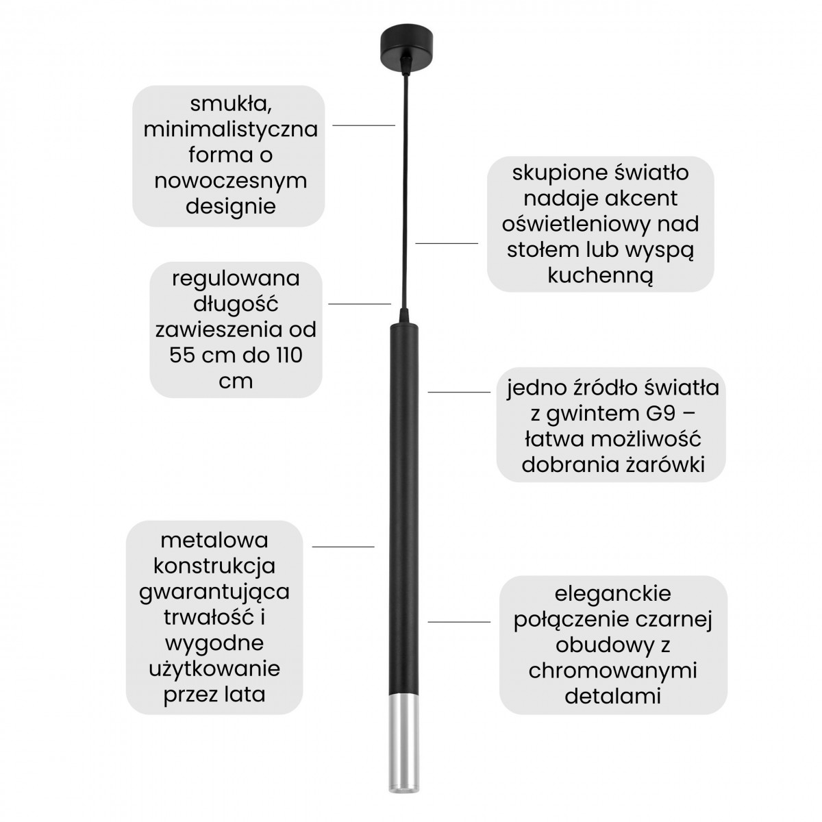 Model SLIM W1 to prosta, a zarazem bardzo elegancka propozycja dla każdego, kto ceni nowoczesny styl bez zbędnych ozdobników. Ta czarna lampa wisząca ma formę długiej, metalowej rurki, która dzięki swojej niewielkiej średnicy zajmuje mało miejsca i prezentuje się wyjątkowo lekko. Połączenie matowej czerni z błyszczącym chromem nadaje jej wyrazistego wyglądu, który pasuje do współczesnych wnętrz.
