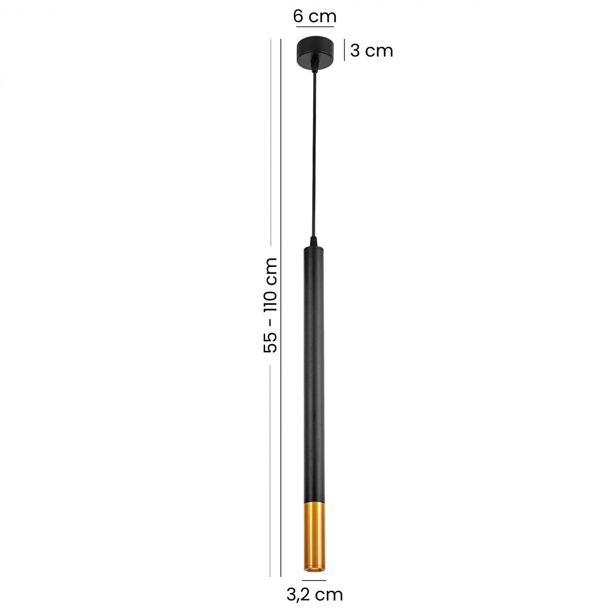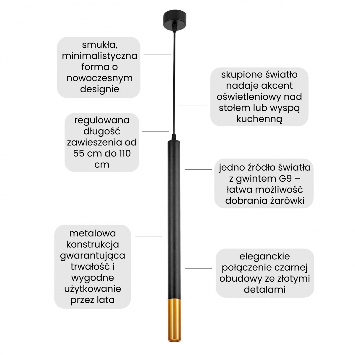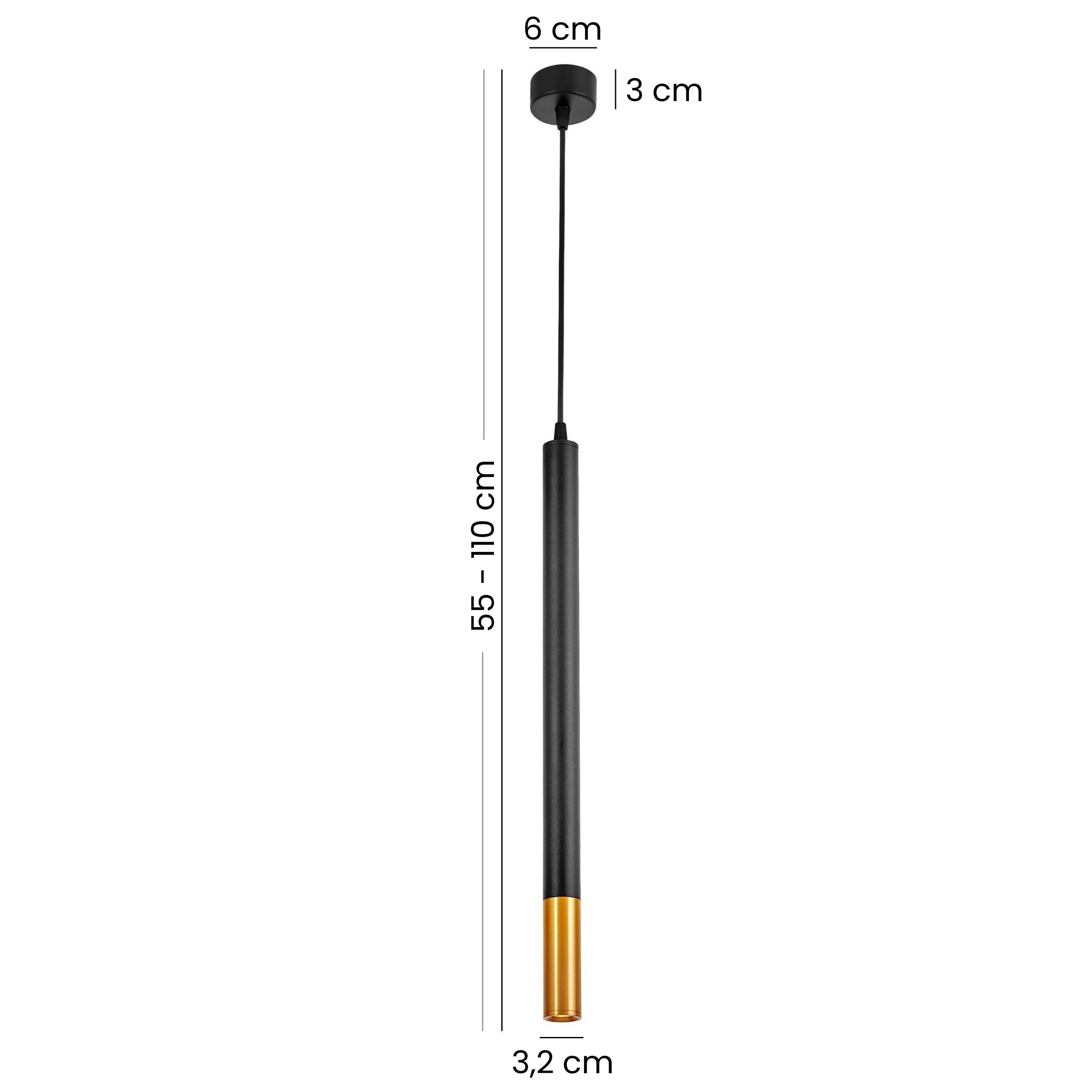 Projektując tę nowoczesną lampę wiszącą, chcieliśmy stworzyć połączenie minimalizmu z luksusowym akcentem. Zdecydowaliśmy się na formę smukłej rurki, w której matową czerń dopełnia ciepły odcień mosiądzu. Model ma tylko 3,2 cm średnicy, więc wygląda bardzo lekko, co docenisz zwłaszcza w mniejszych pokojach lub wtedy, gdy zawiesisz kilka sztuk w jednym pomieszczeniu.