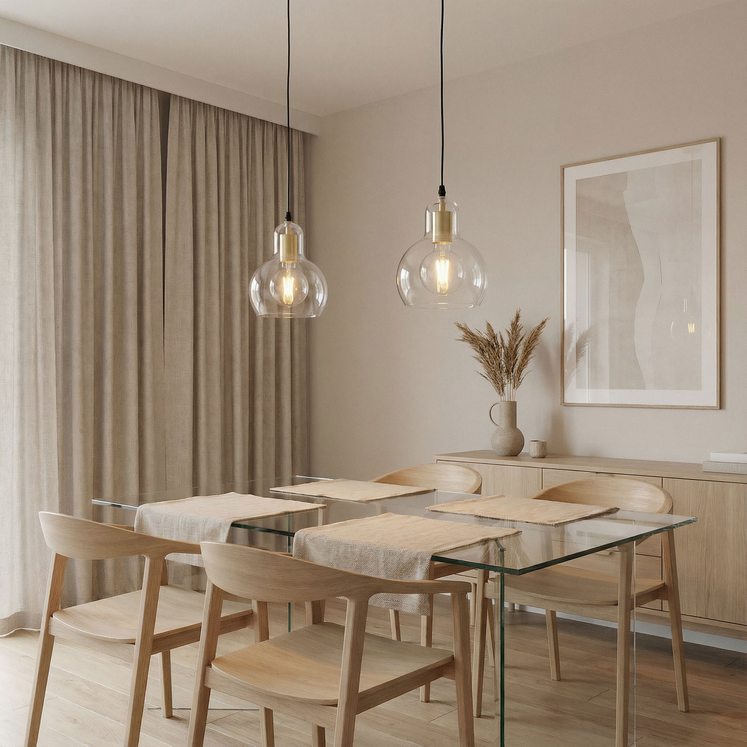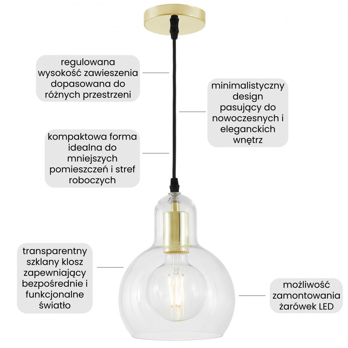 MORO 1A w złotym wykończeniu to propozycja dla osób, które szukają światła nie tylko praktycznego, ale także budującego atmosferę wnętrza. Transparentny klosz nie ogranicza pracy żarówki, dzięki czemu światło optymalnie oświetla wybrane miejsce, a złoty detal dodaje mu wizualnej elegancji. Rozwiązanie wyjątkowo sprawdza się jako lampa do kuchni, oświetlenie jadalni, przedpokoju, a także nad biurkiem lub stolikiem.