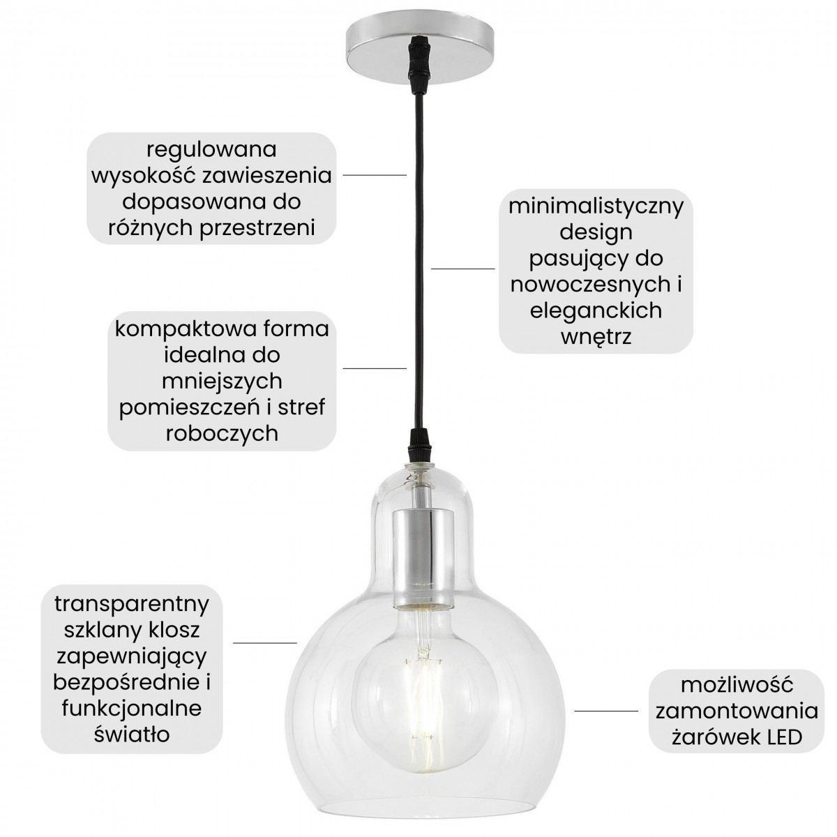 MORO 1A to nowoczesna lampa wisząca z transparentnym, szklanym kloszem i chromowaną oprawą. Jej forma jest minimalistyczna i neutralna, dzięki czemu łatwo wpisuje się we współczesne wnętrza urządzone w różnych stylach. Niewielkie wymiary sprawiają, że lampa dobrze sprawdza się tam, gdzie potrzebne jest dodatkowe, funkcjonalne światło na co dzień.