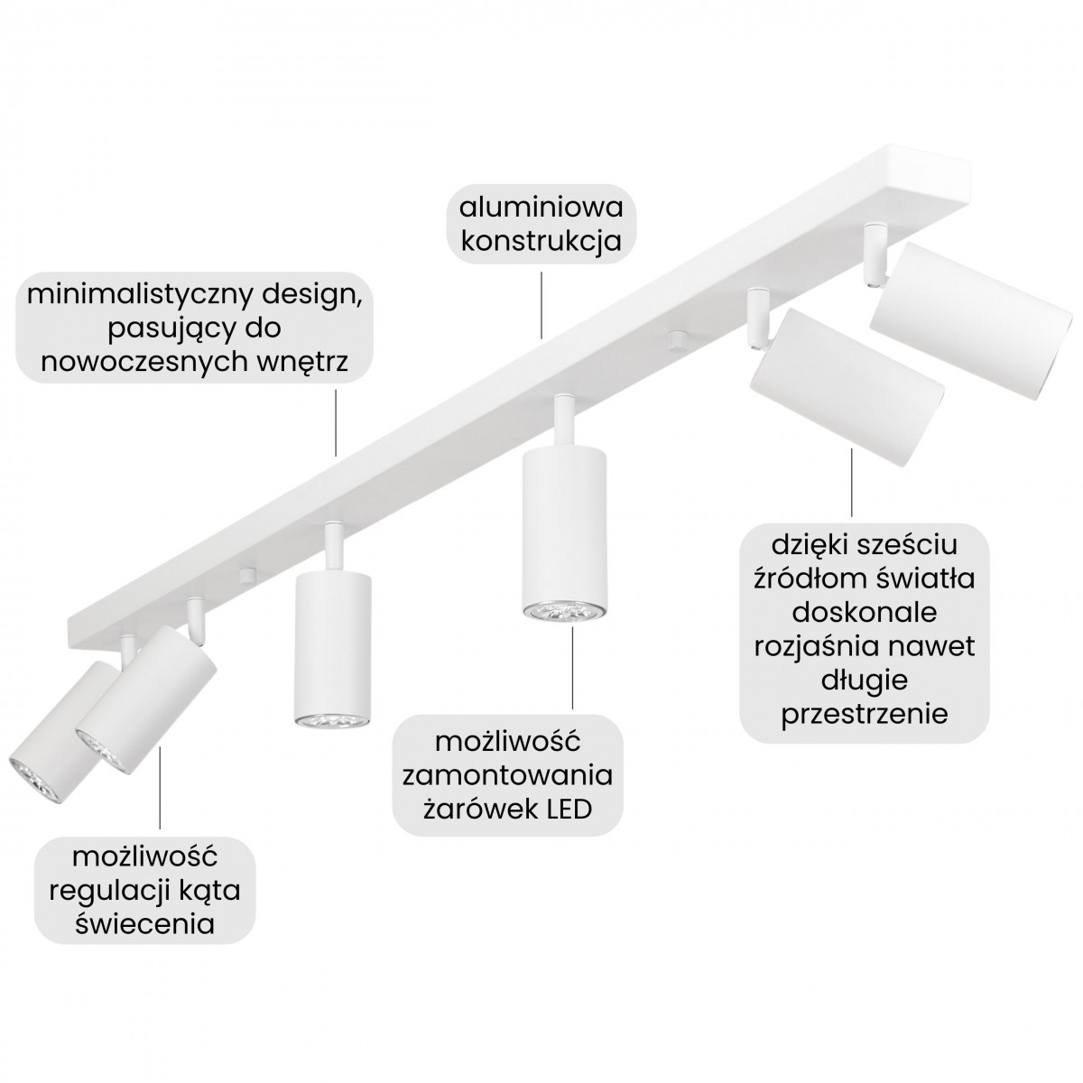 NEO W6 to nowoczesny spot sufitowy sześcioma punktami światła, który sprawia, że światło staje się naturalną częścią otoczenia. Regulowane reflektorki mogą być wykorzystywane do różnych czynności: oświetlenia do pracy, strefy relaksu czy wieczornego odpoczynku jako spoty do salonu. Białe wykończenie ma w sobie coś harmonijnego - pozwala, aby oprawa współbrzmiała z aranżacją bez narzucania stylu.