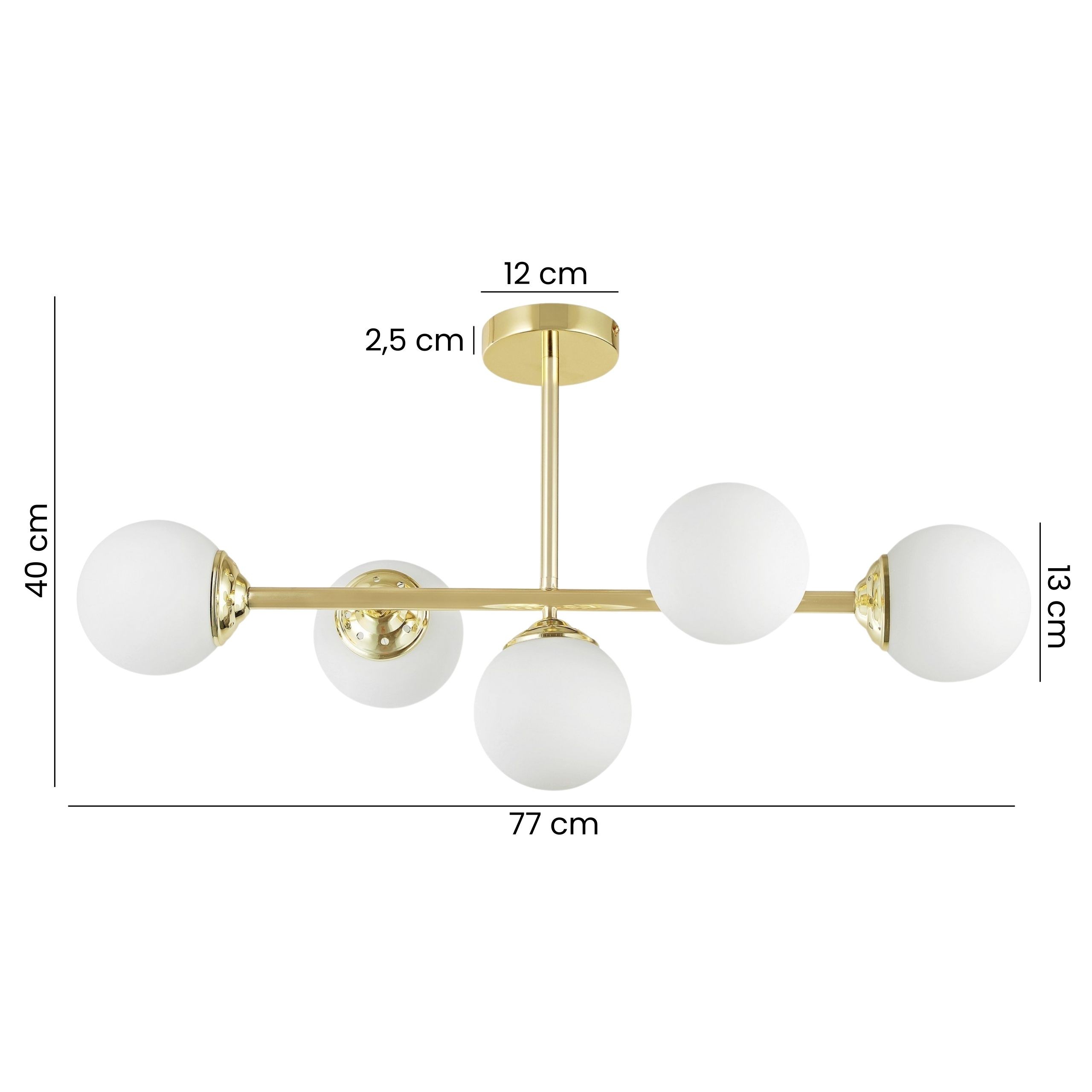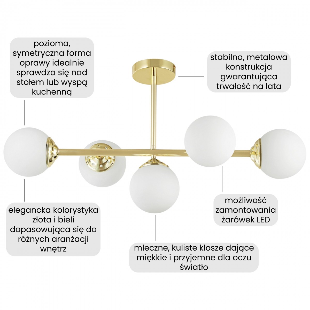 Lampa sufitowa FINO W5 w klasycznym złocie to model, który wyróżnia się równowagą między estetyką a praktycznością. Pięć kulistych, białych kloszy z mlecznego szkła zawieszono na smukłych ramionach, co daje efekt symetrii i elegancji. Nowoczesne lampy wiszące oświetlają całe wnętrze, nie dominując nad aranżacją, a dodając jej luksusowego charakteru.