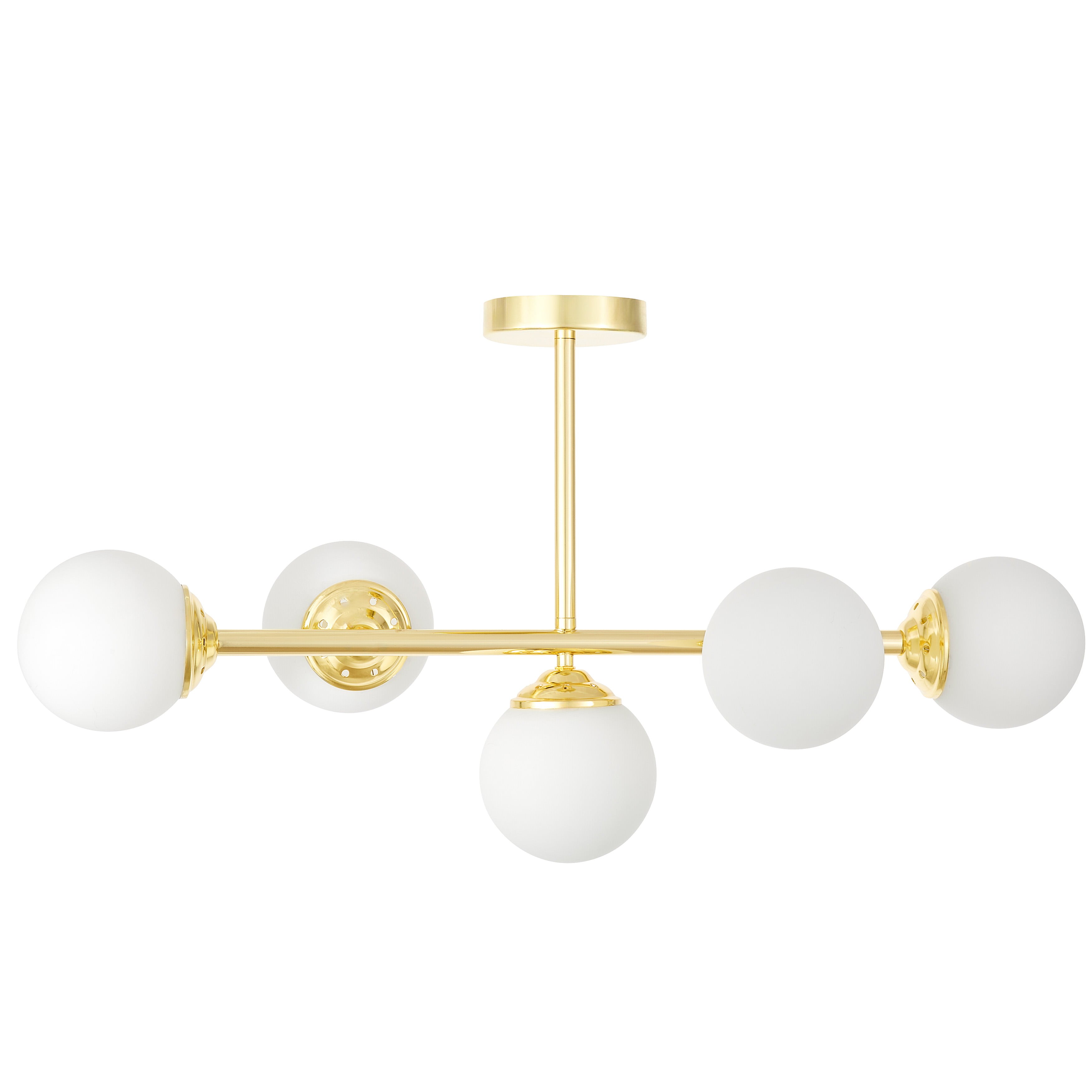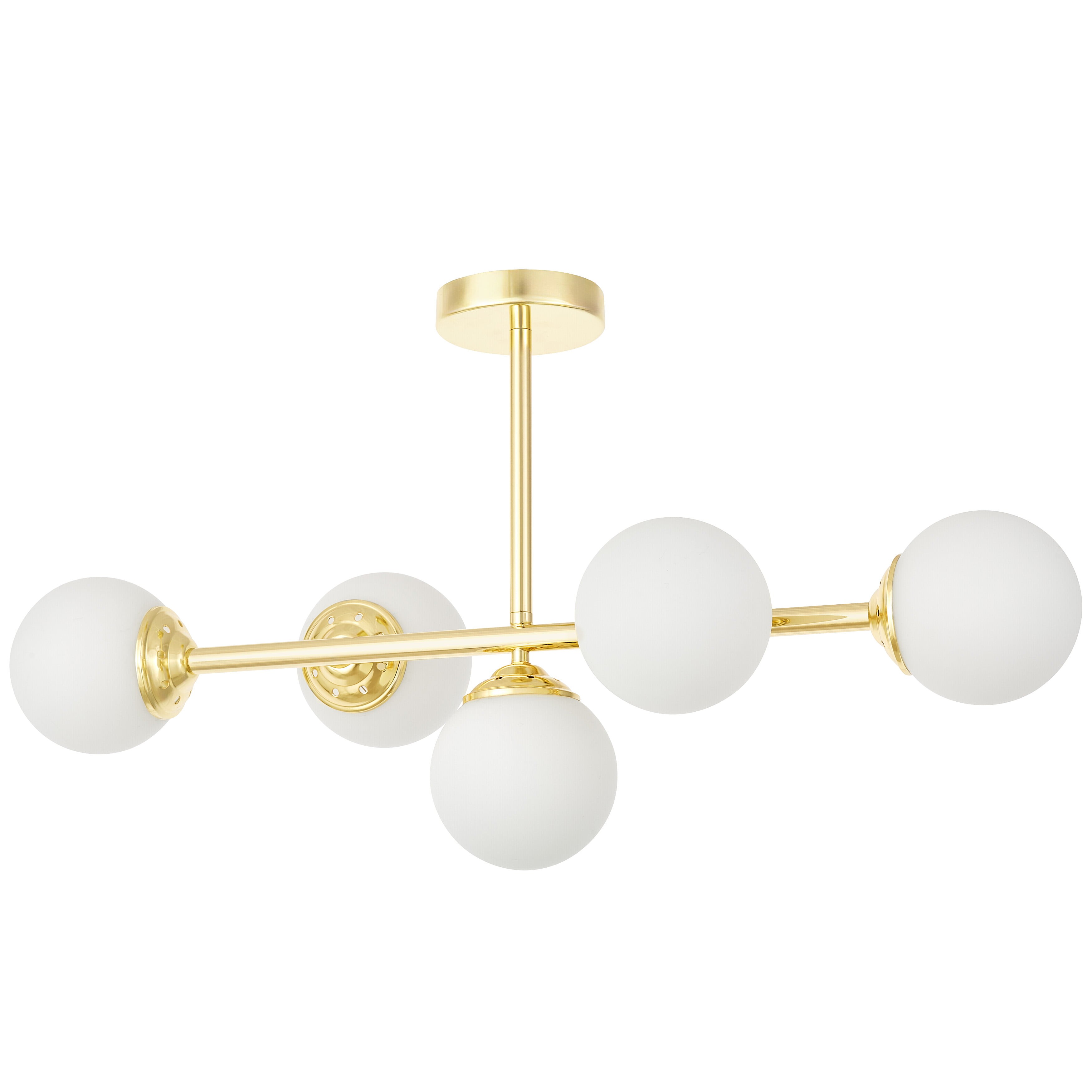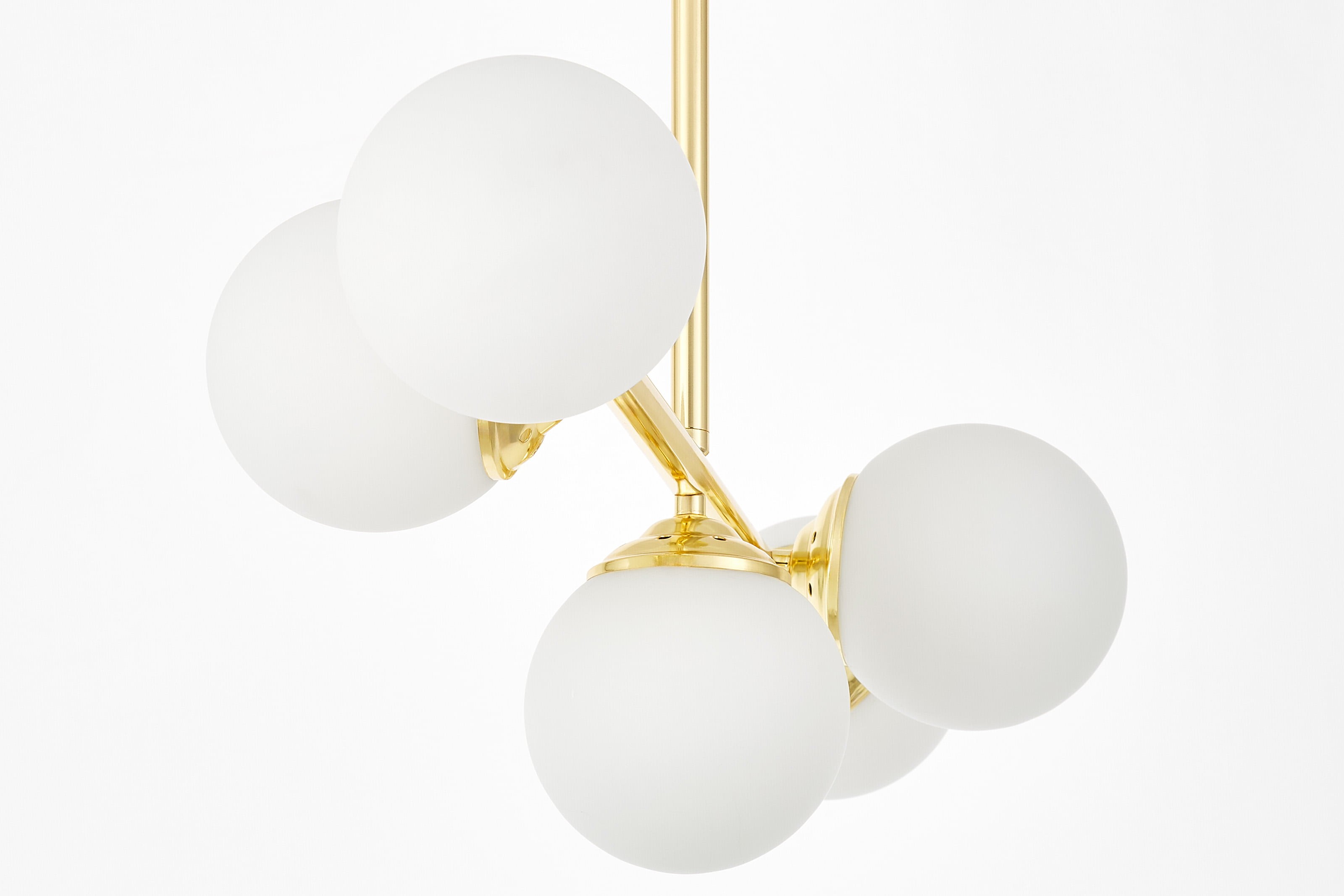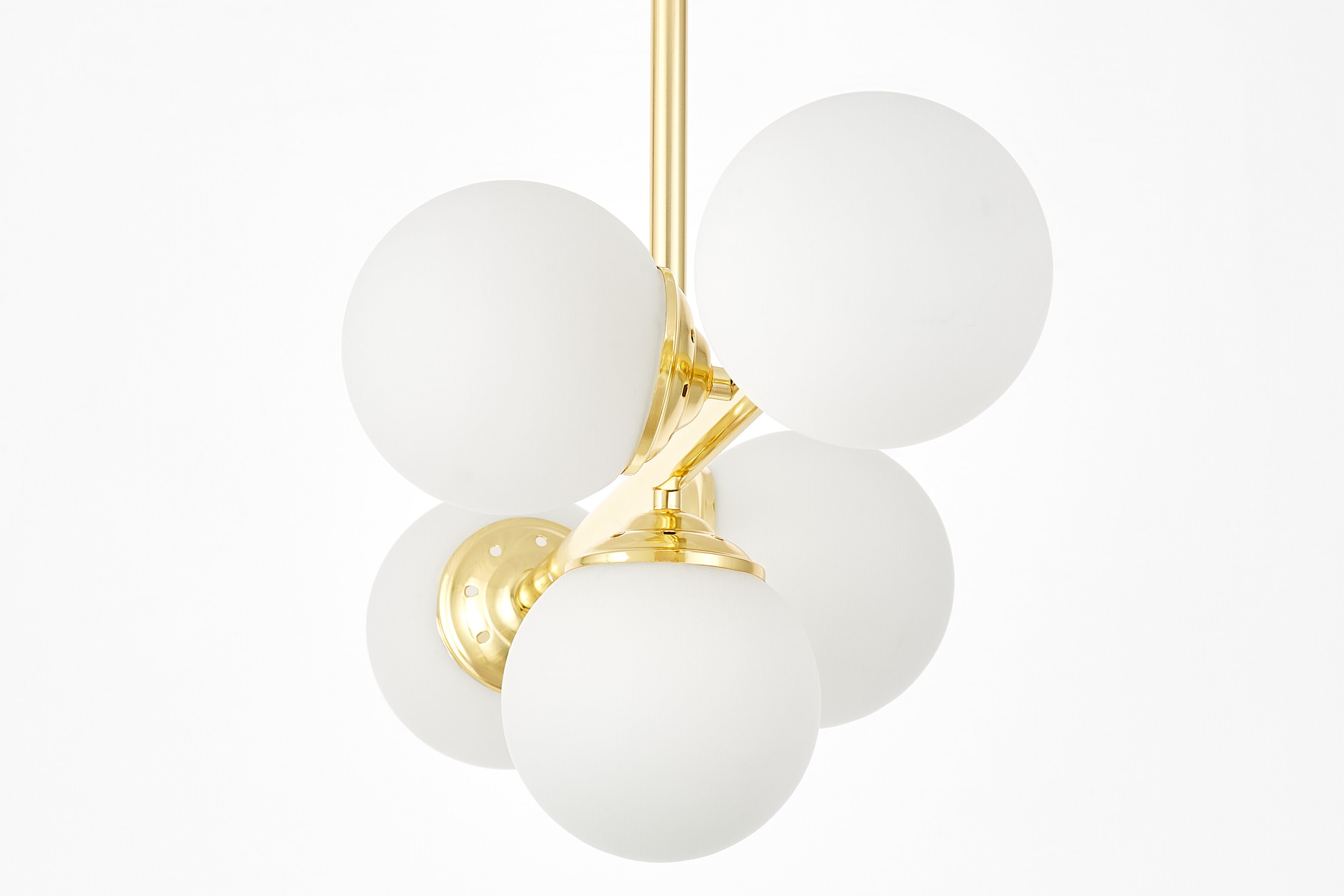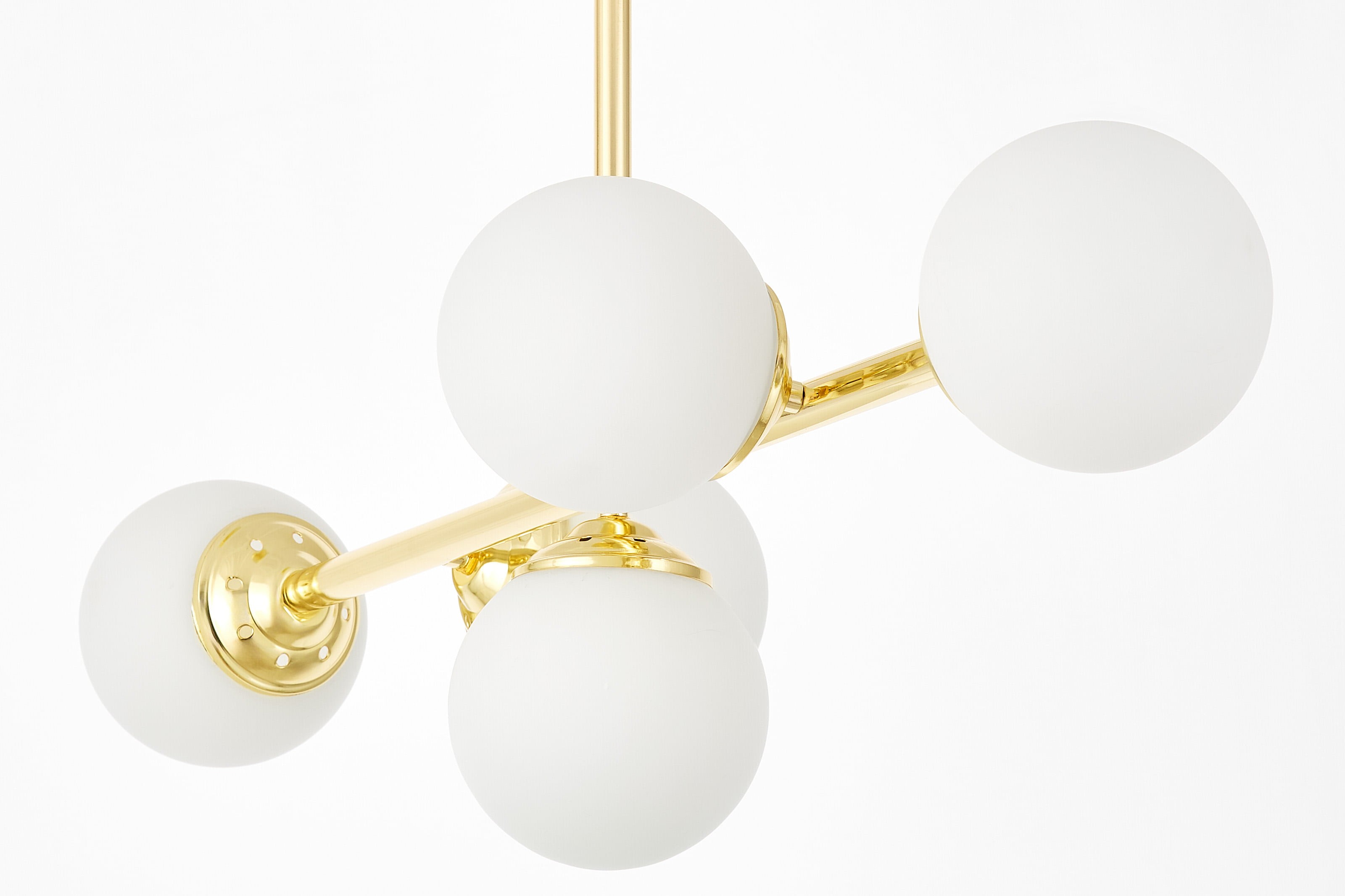 Lampa sufitowa FINO W5 w klasycznym złocie to model, który wyróżnia się równowagą między estetyką a praktycznością. Pięć kulistych, białych kloszy z mlecznego szkła zawieszono na smukłych ramionach, co daje efekt symetrii i elegancji. Nowoczesne lampy wiszące oświetlają całe wnętrze, nie dominując nad aranżacją, a dodając jej luksusowego charakteru.