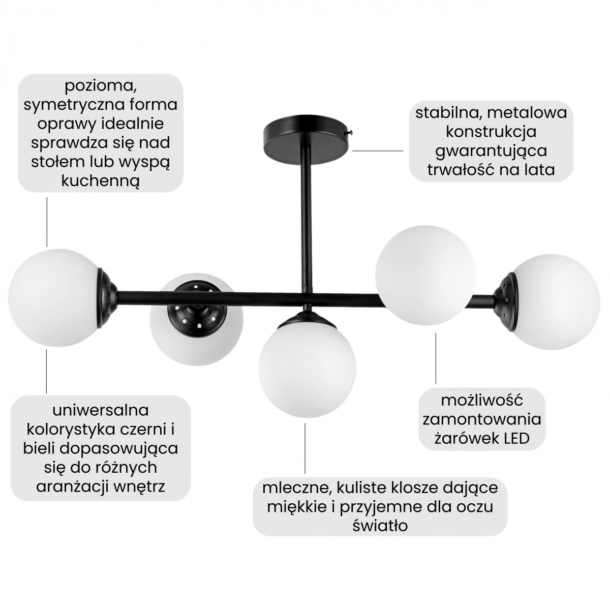 Jako lampa do sypialni wnosi nowoczesny, elegancki akcent, podkreślając charakter aranżacji i sprzyjając relaksowi. Model dobrze współgra z jasnymi ścianami, ociepla wnętrza z betonem, a w połączeniu z drewnem staje się eleganckim detalem w nowoczesnym salonie czy kuchni. Czerń w zestawieniu z bielą kulistych kloszy wpisuje się w klimat industrialnych loftów. Plafon równie dobrze odnajduje się w minimalistycznych i skandynawskich przestrzeniach, gdzie liczy się prostota i konsekwentny styl.